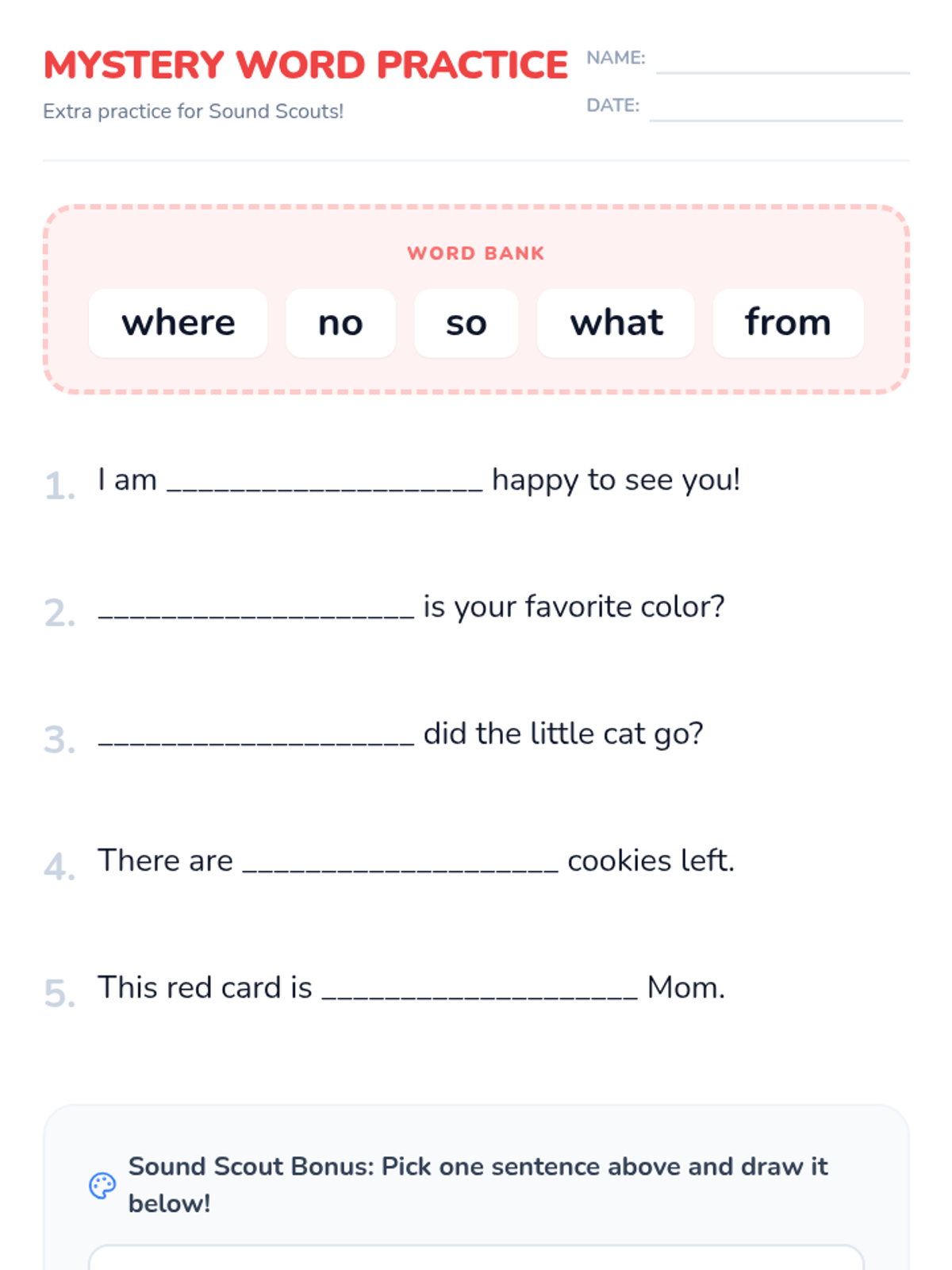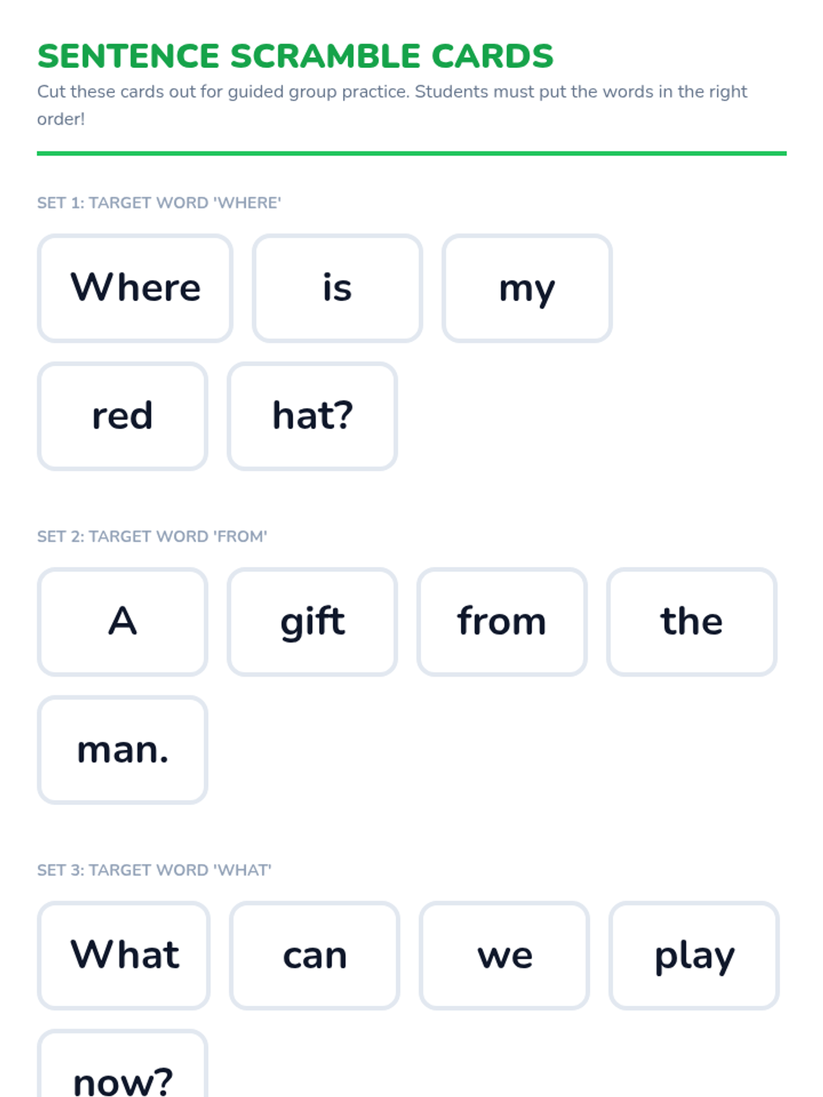 Fluency building and phonics games. Students practice rapid reading of bonus letter words and construct sentences.