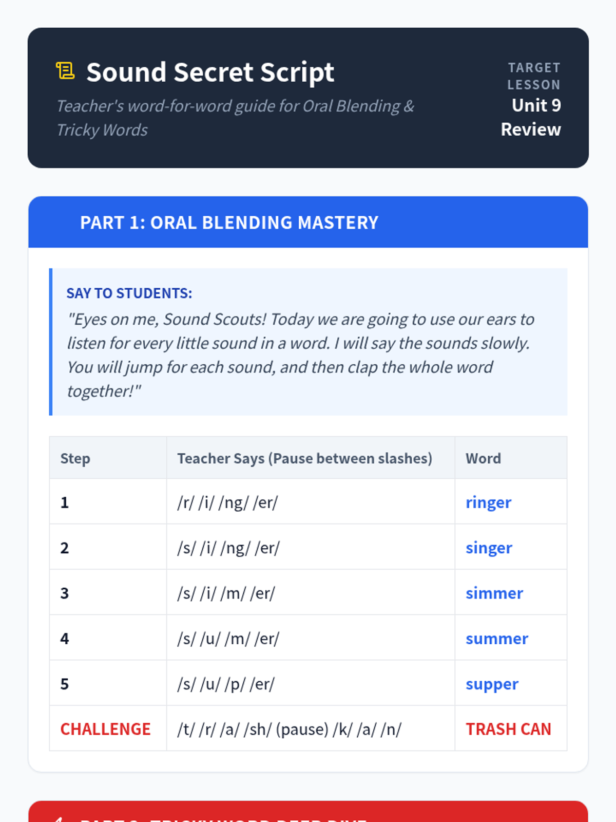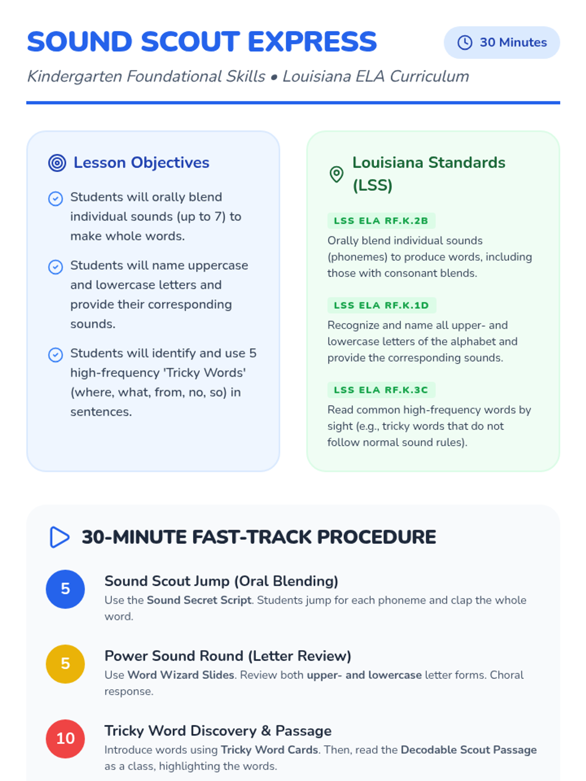 A fast-paced, 30-minute Kindergarten literacy lesson focused on oral blending of phonemes and mastering high-frequency 'tricky' words through energetic interactive activities.