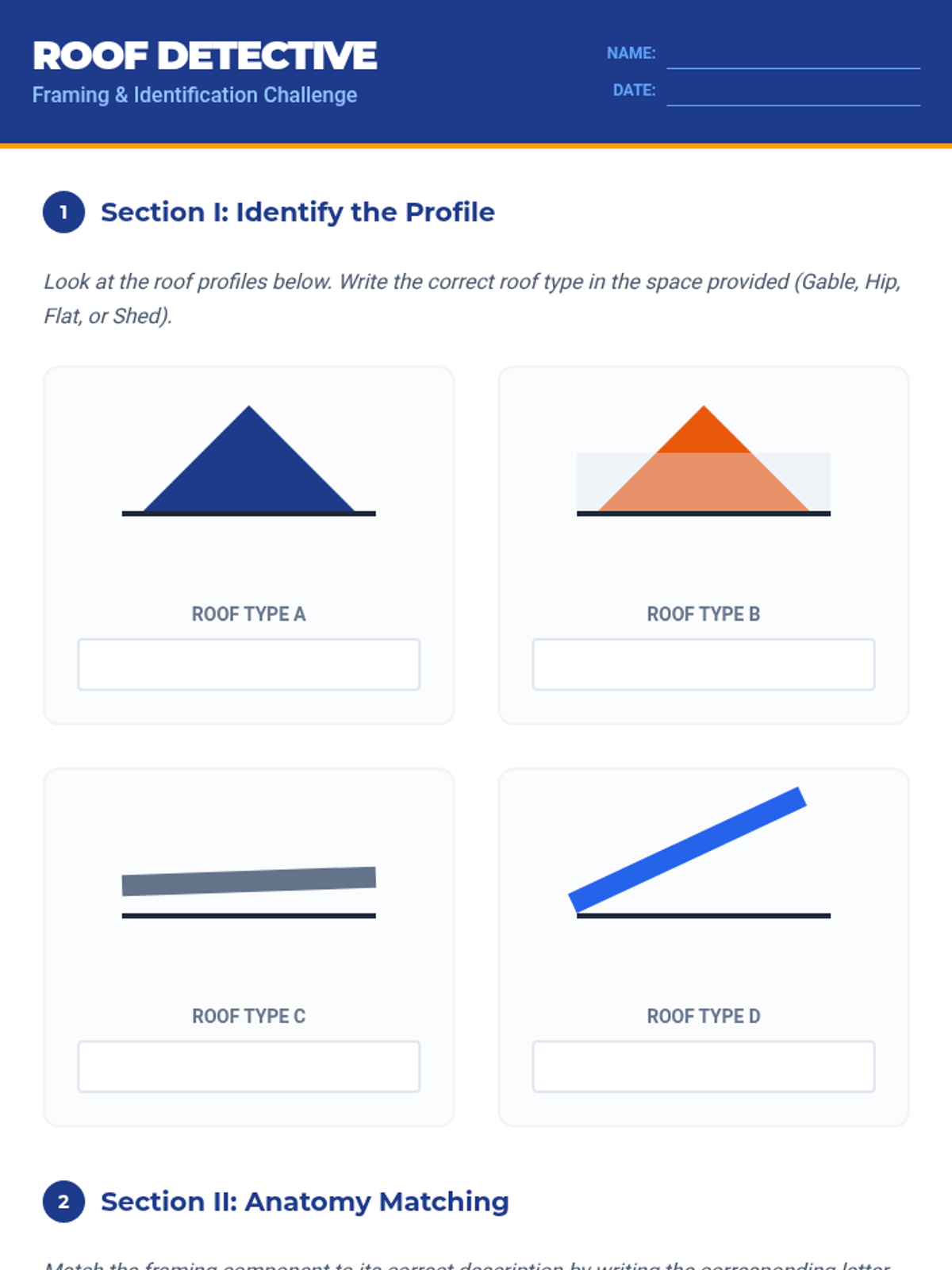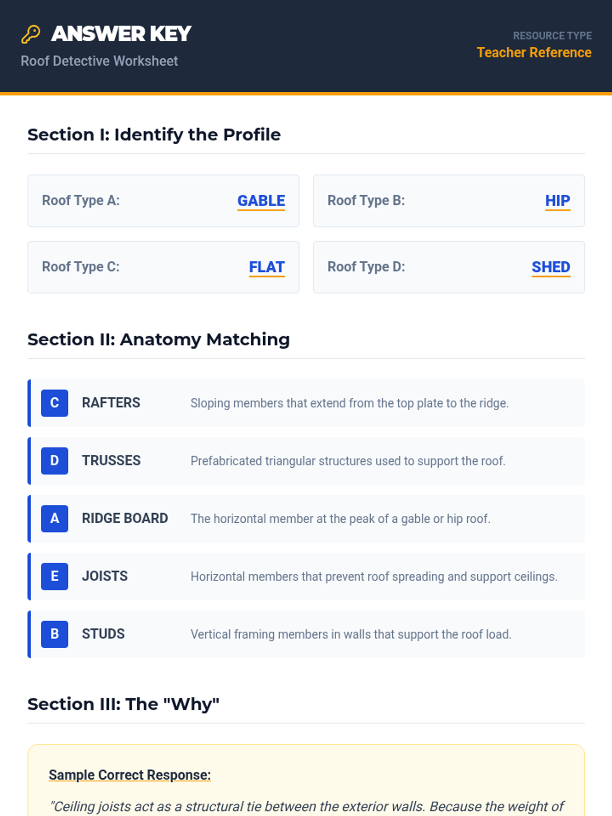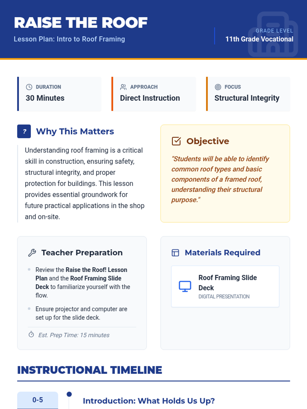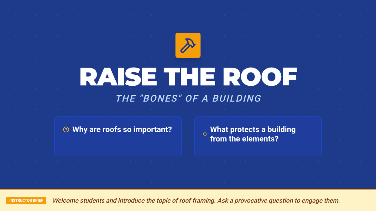 This lesson introduces students to the fundamentals of roof framing, covering common roof types, essential components, and structural importance for construction careers.