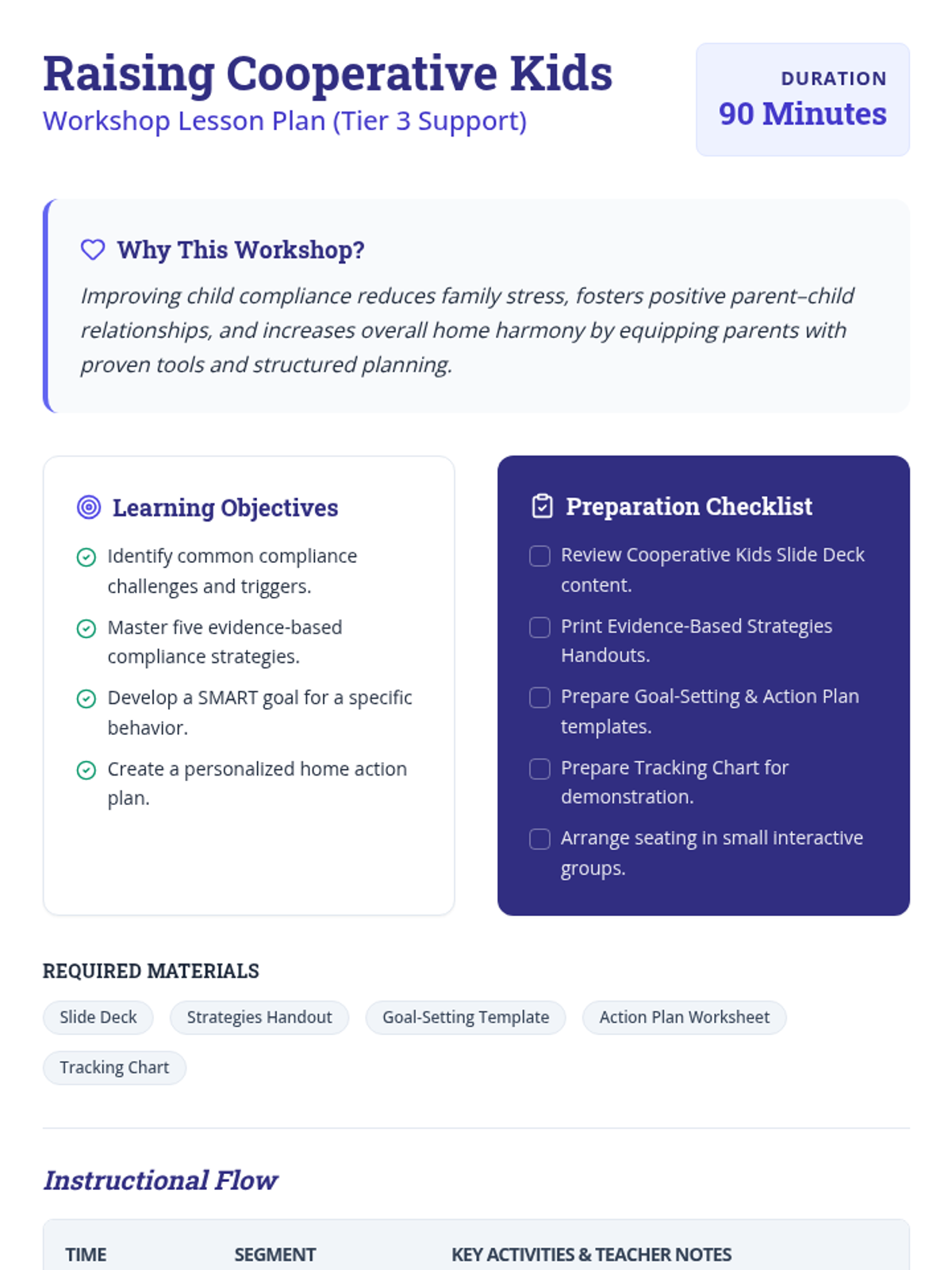A 90-minute Tier 3 workshop for parents focusing on evidence-based strategies to improve child compliance and reduce home stress through personalized action plans.