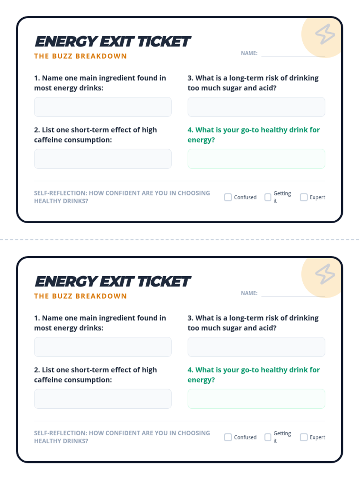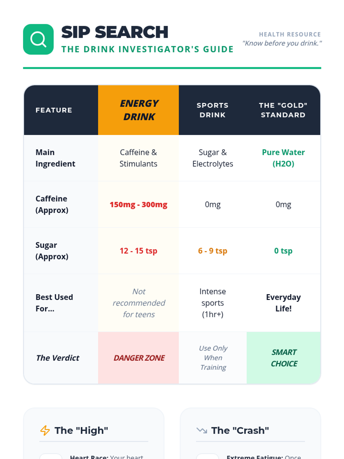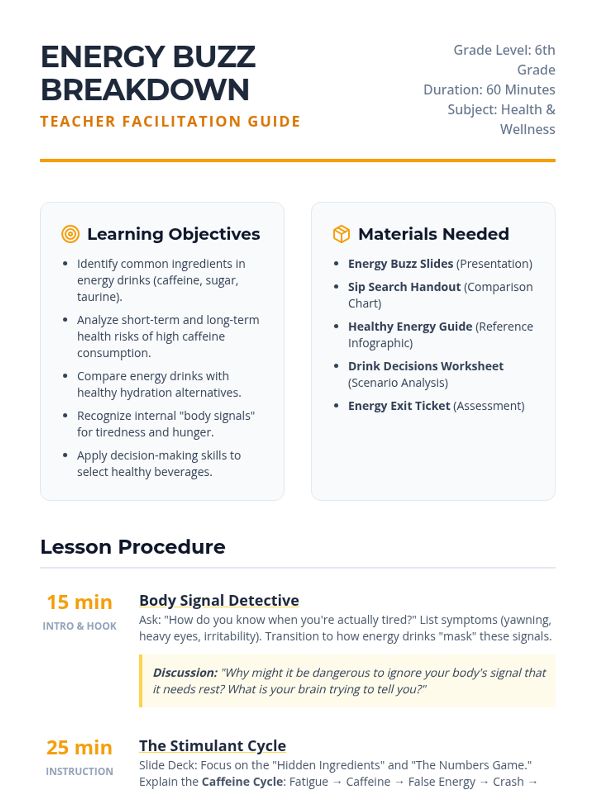 A comprehensive lesson exploring the science of energy drinks, their health impacts, and how to make better beverage choices through scenario analysis and data comparison.