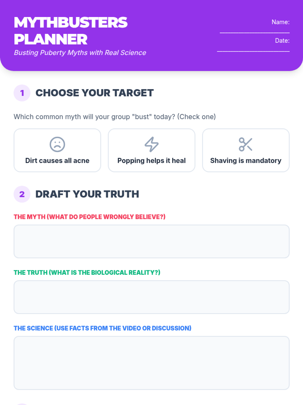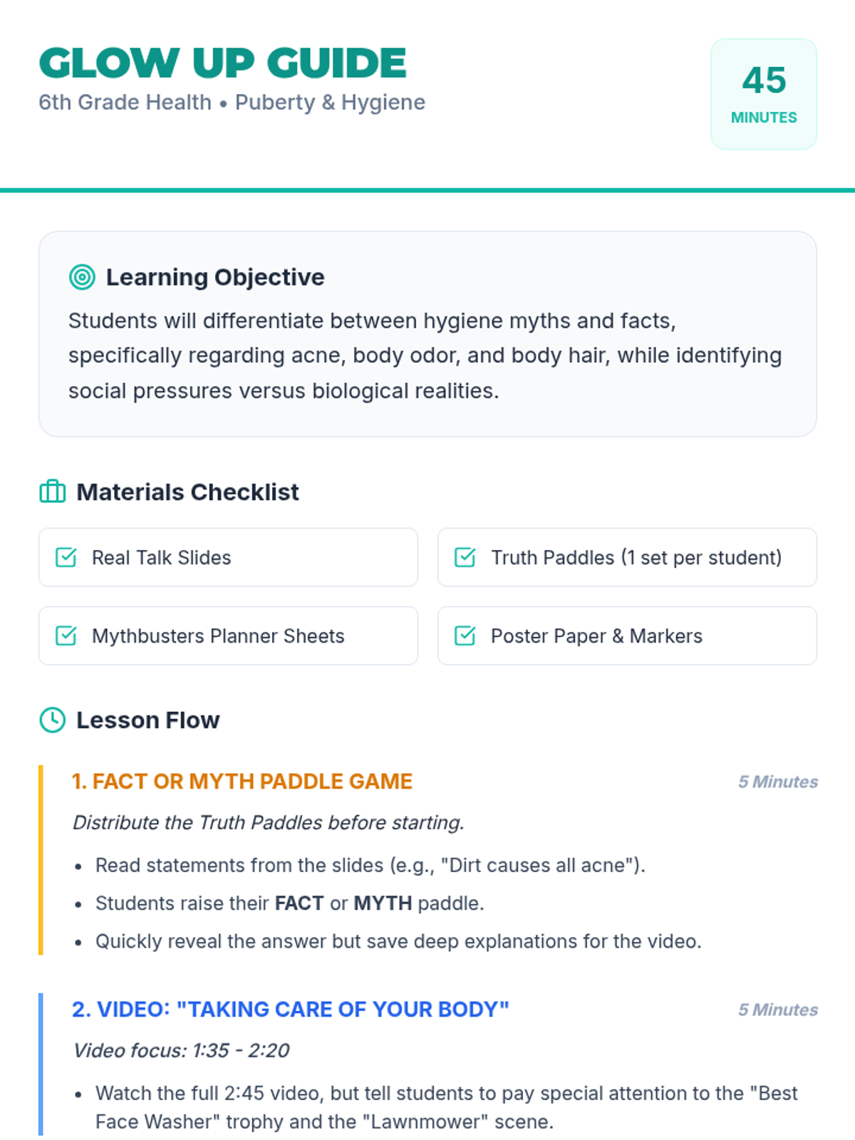Students investigate common myths and facts about puberty, focusing on acne, body odor, and body hair. Through a video-guided discussion and a creative poster activity, they learn the biological realities of hygiene and the importance of personal choice in grooming.