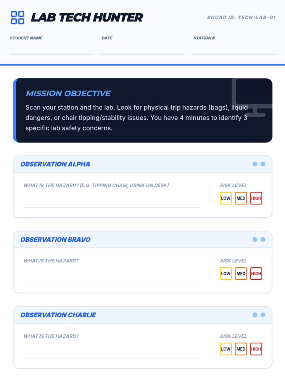 A high-impact, 10-minute mini-lesson focused on personal and collective safety responsibility in a workshop or exploratory setting. Includes a brief presentation, a rapid hazard-hunting activity, and a teacher's facilitation guide.