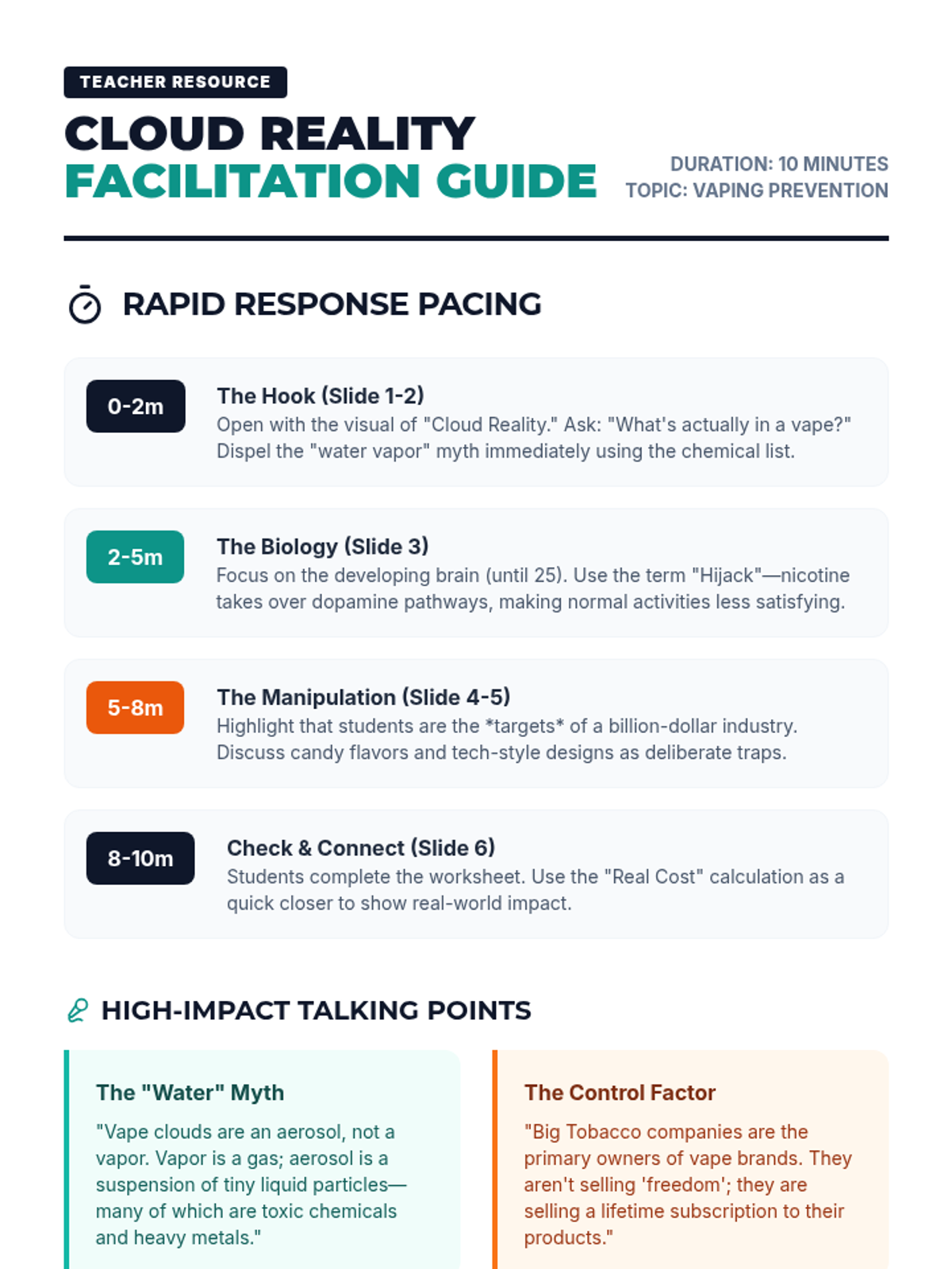 A high-impact, 10-minute session focused on the immediate and long-term health risks of vaping, designed to dispel myths and provide clear facts for middle or high school students.