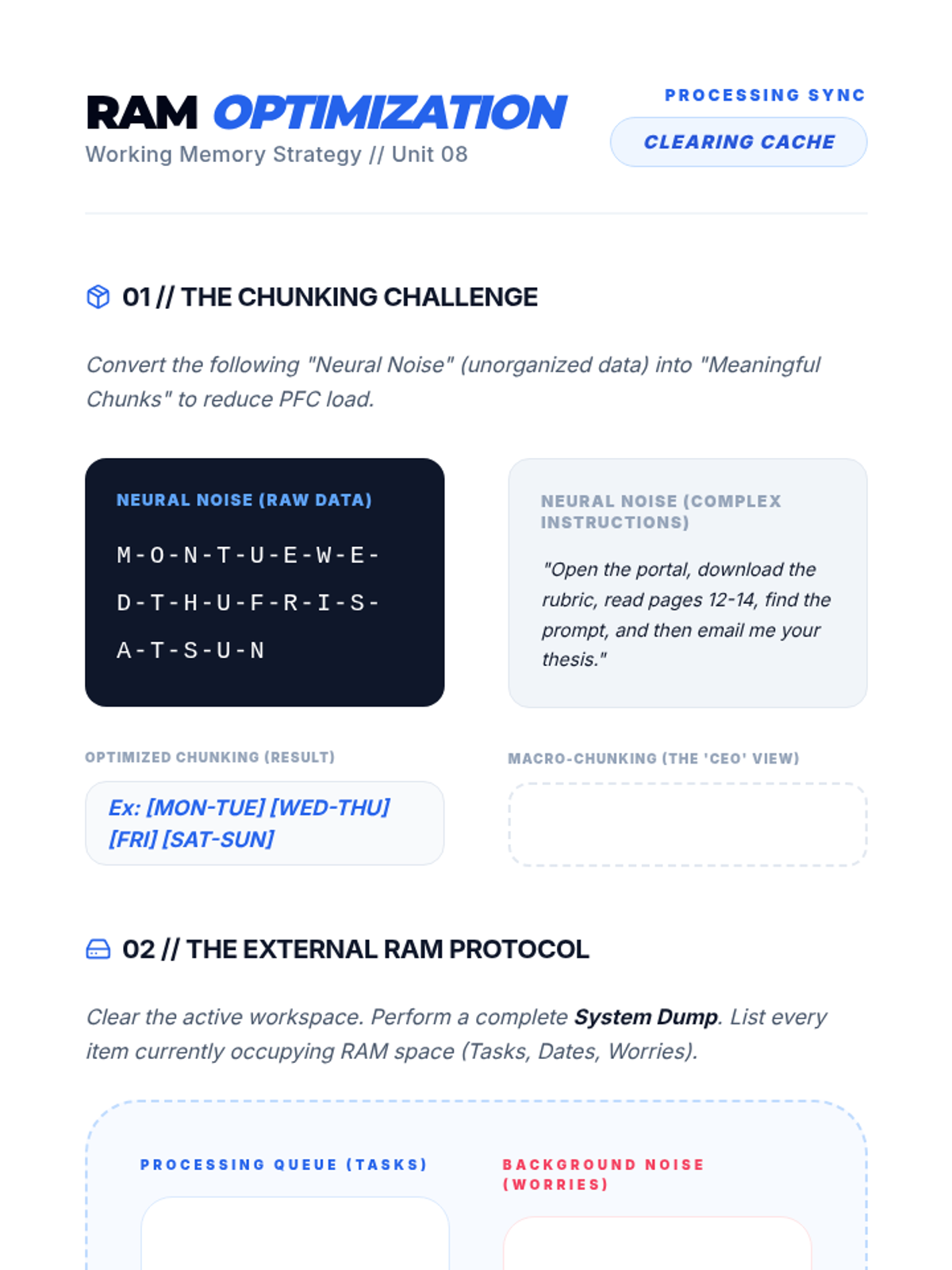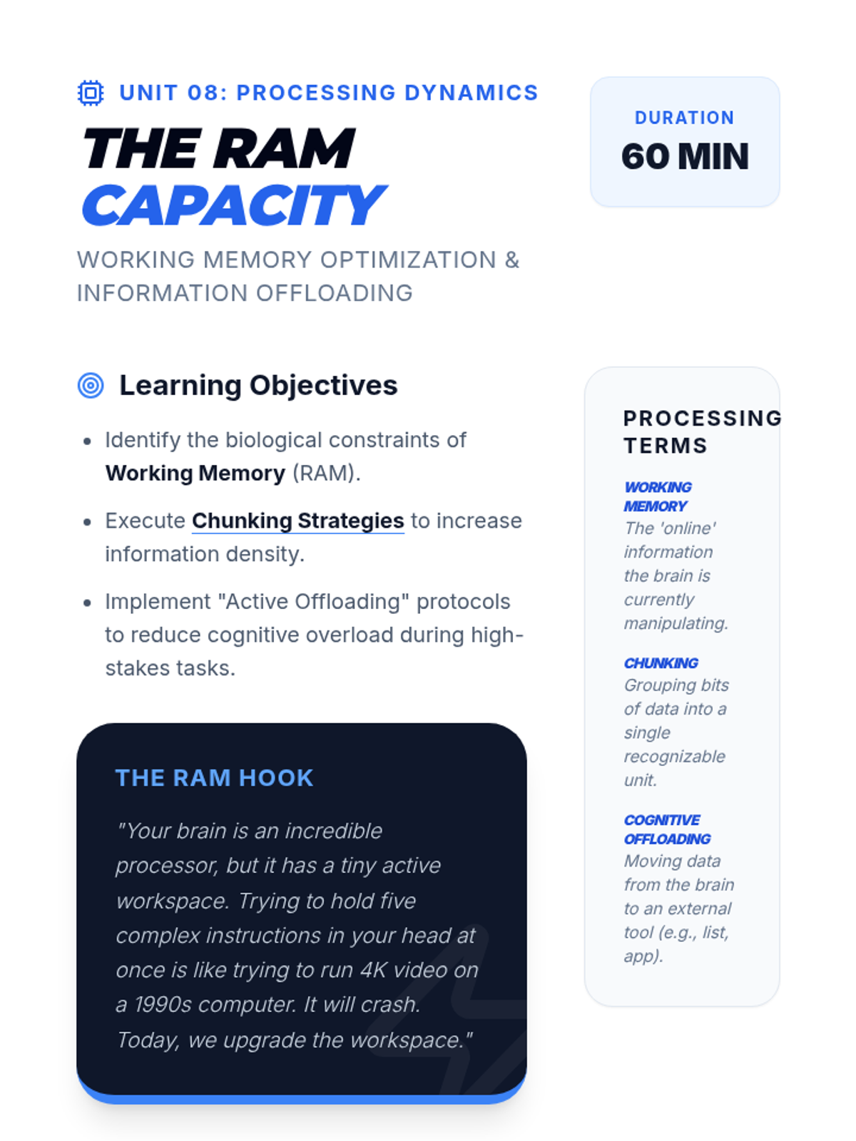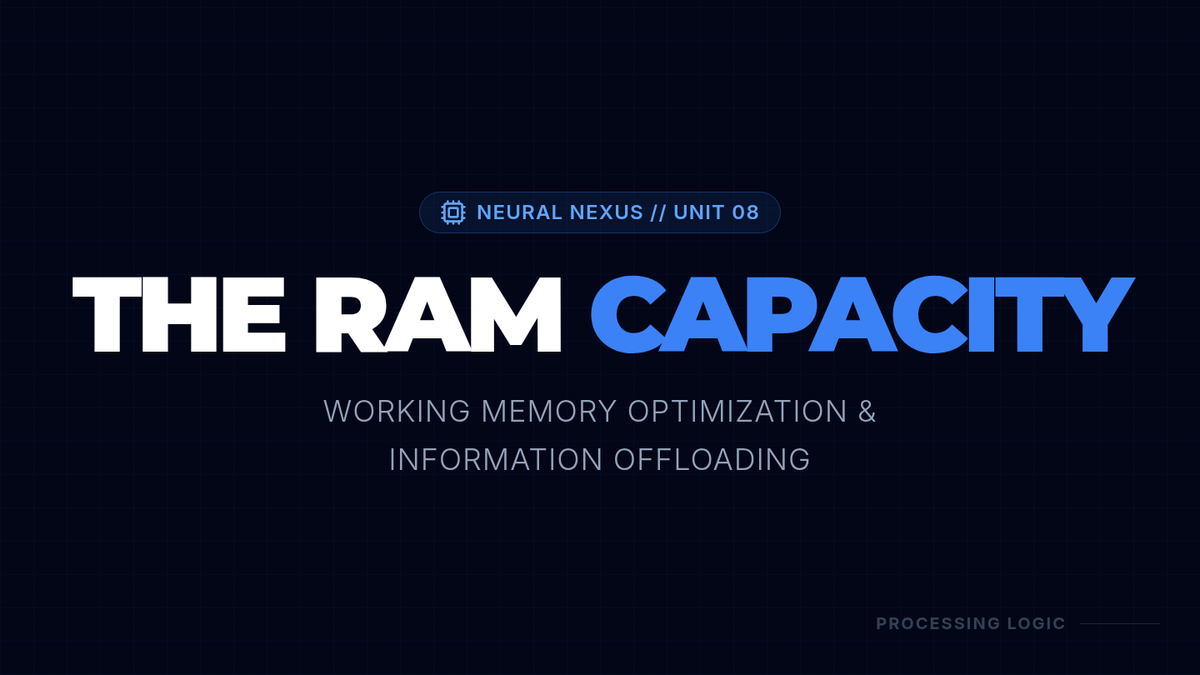 Explores the 'RAM' of the brain. Teaches chunking, visualization, and offloading techniques to maximize limited working memory capacity during high-stress tasks.