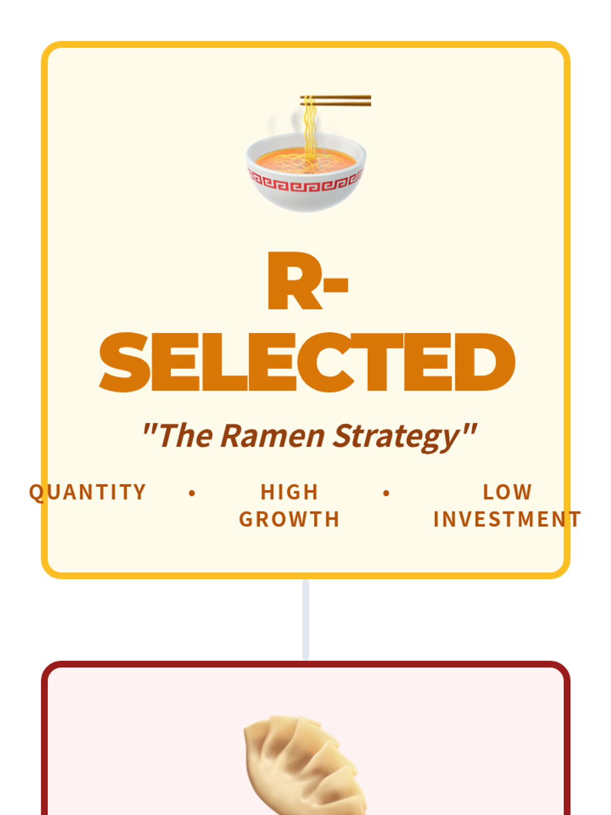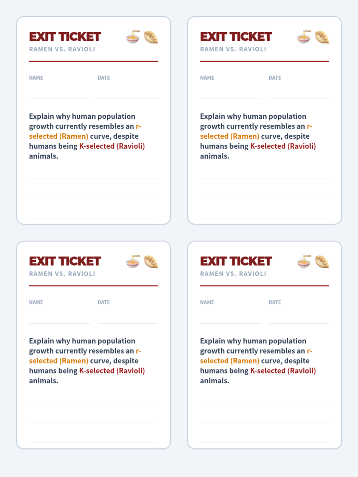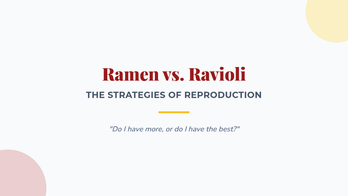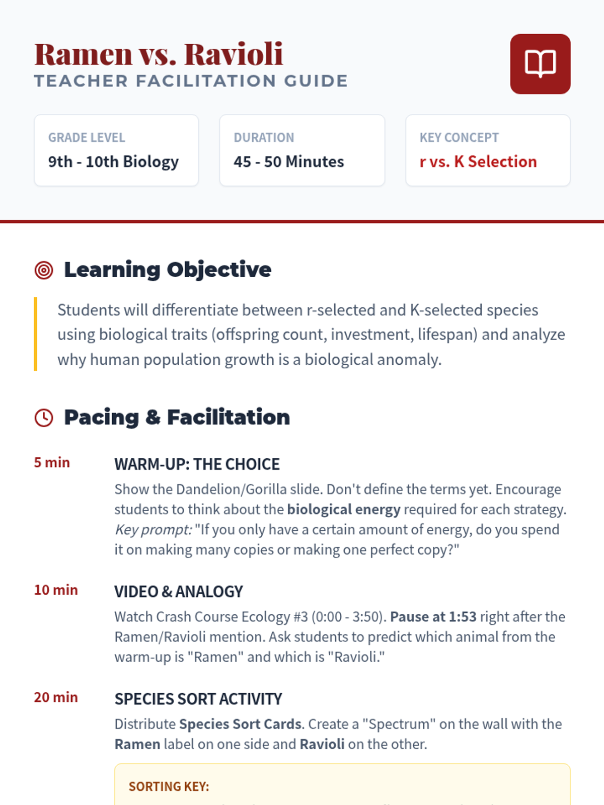 A 9th-10th grade biology lesson comparing r-selected and K-selected reproductive strategies using the 'Ramen vs. Ravioli' analogy from Crash Course Ecology. Students analyze animal traits and the human population growth anomaly.