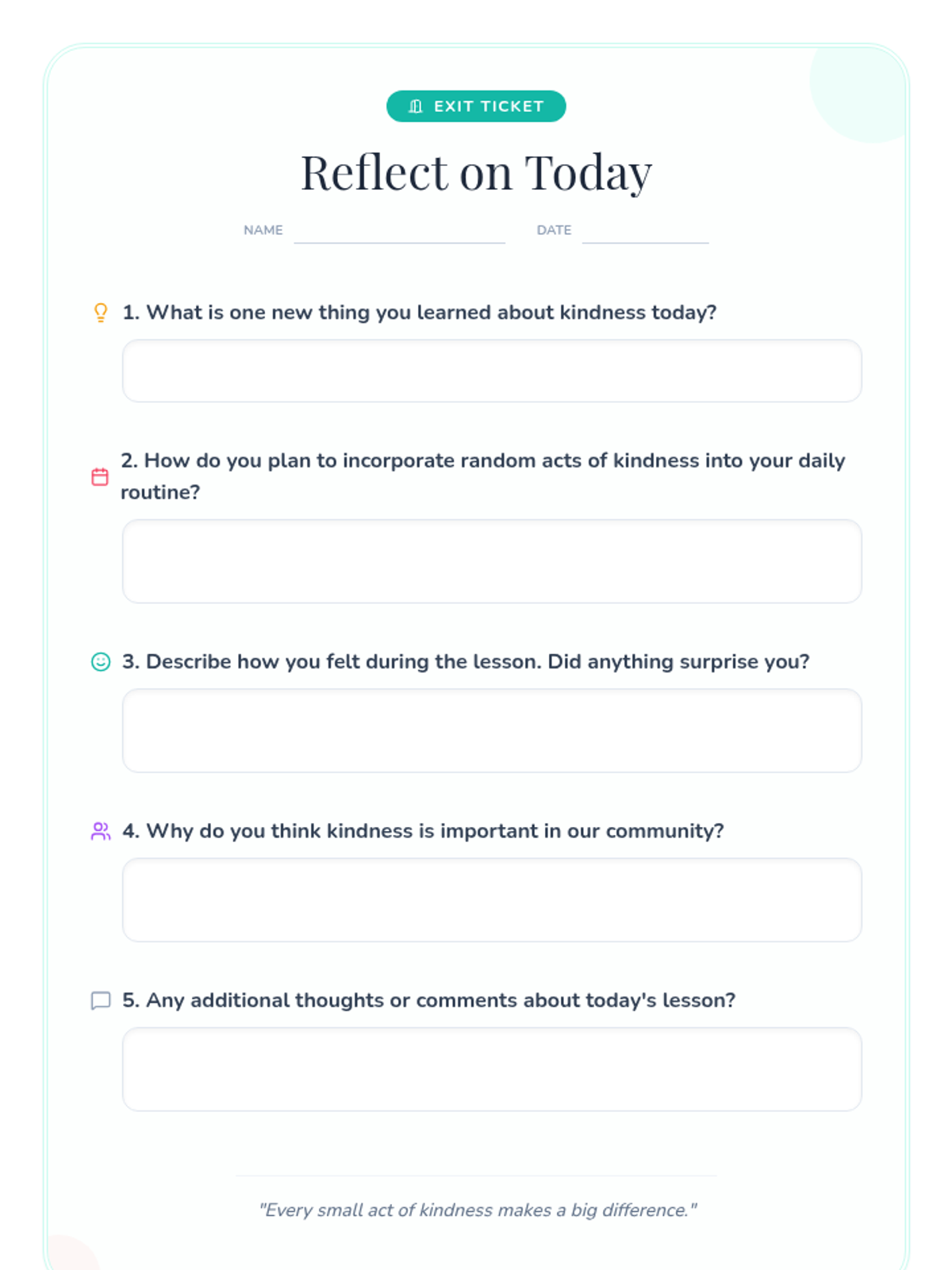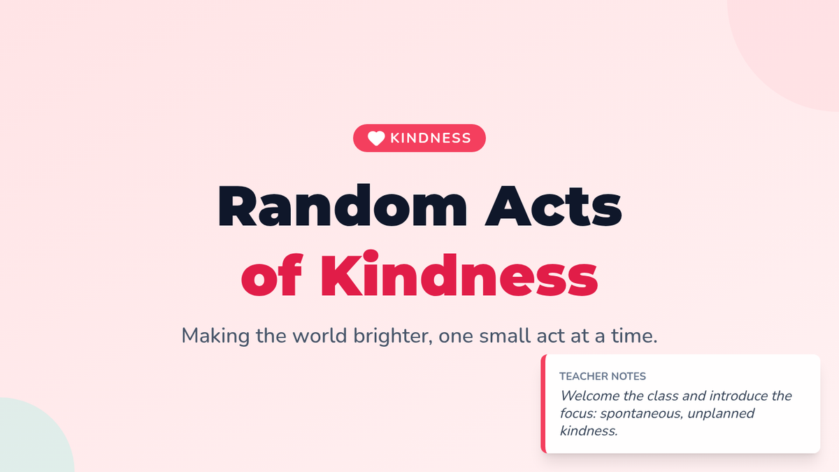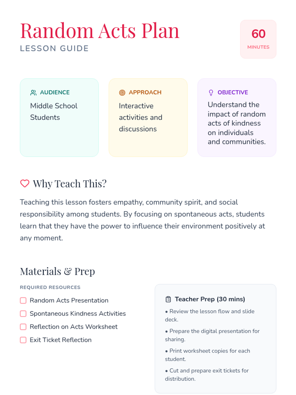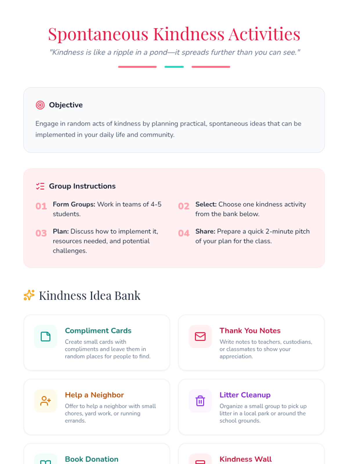 A lesson that promotes spontaneous acts of kindness and their effects on community through interactive discussion and hands-on planning.