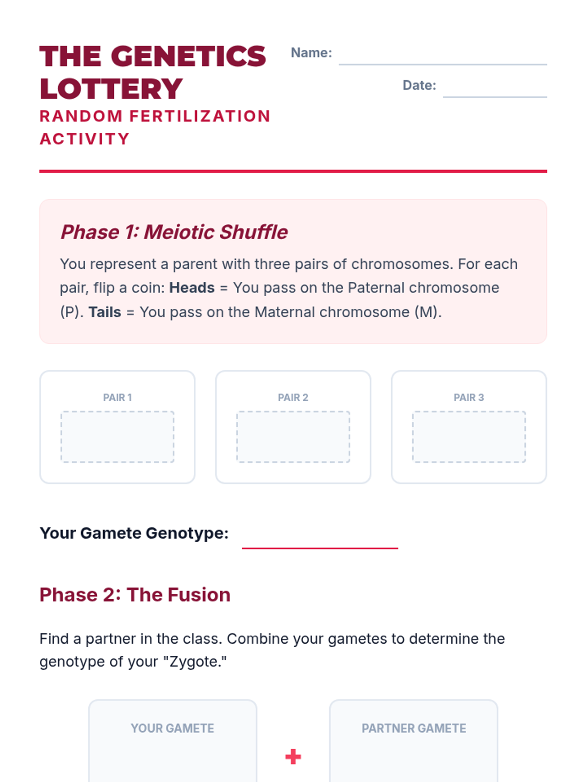 Students integrate all meiotic factors to calculate the staggering number of potential zygote combinations, culminating in a 'Genetics Lottery' simulation.