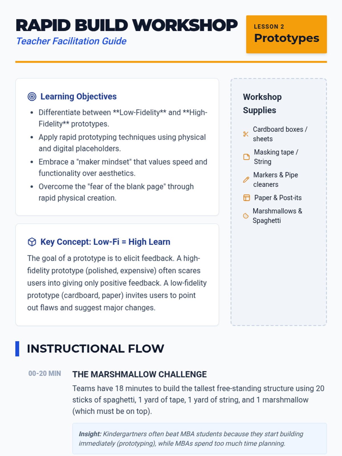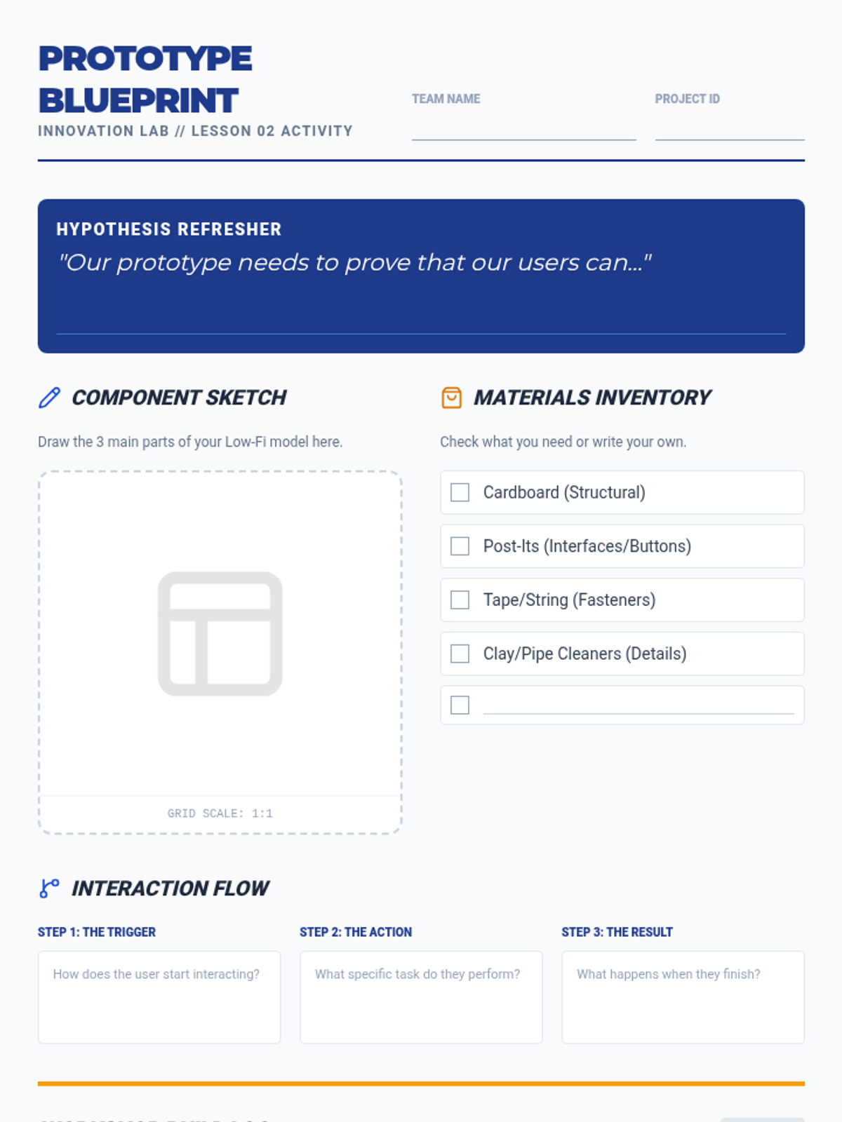 Students use low-fidelity materials to physically construct their ideas, focusing on speed and representation rather than polish. This lesson encourages tactile thinking and overcoming the fear of starting.