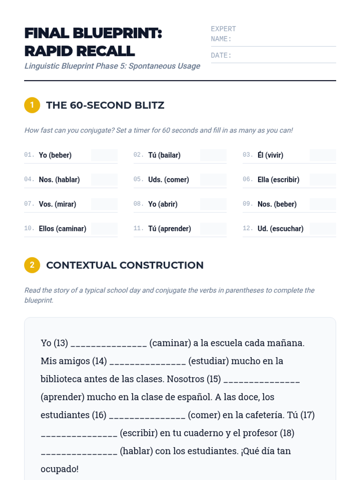 A mastery-based session designed to increase speed and accuracy. Students move from deliberate conjugation to spontaneous usage in short prompts.