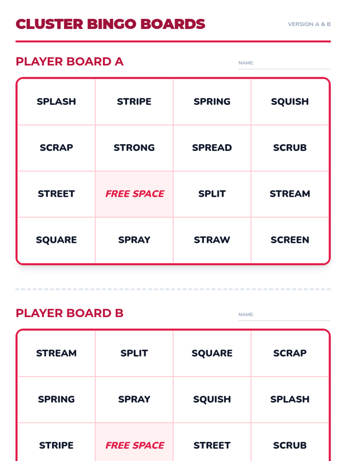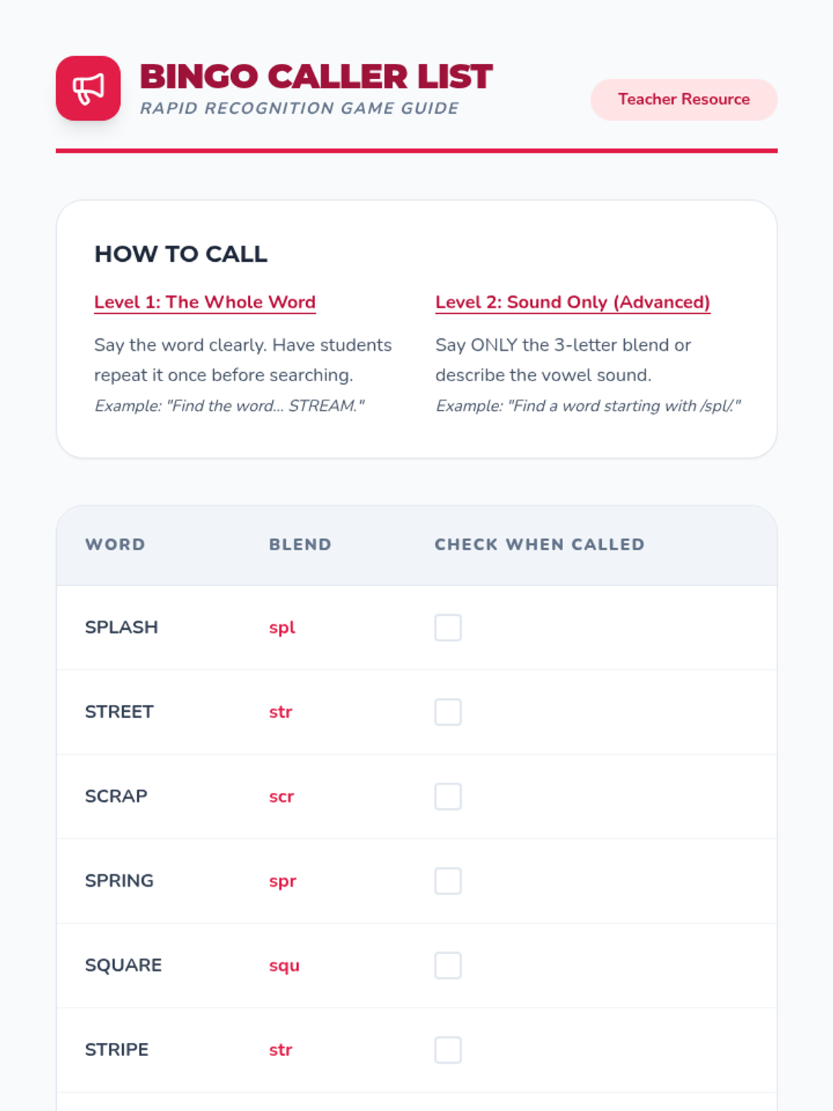 A rapid recognition game where students match spoken complex blend words to written forms on a bingo grid to build automaticity.