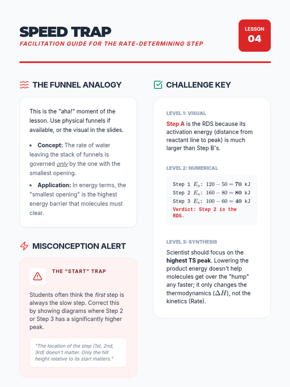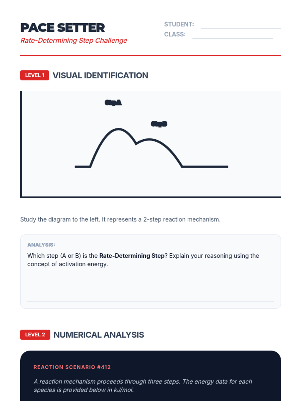 Students correlate the slowest step in a mechanism with the highest activation energy peak on a diagram. They solve problems to identify which step controls the overall rate.