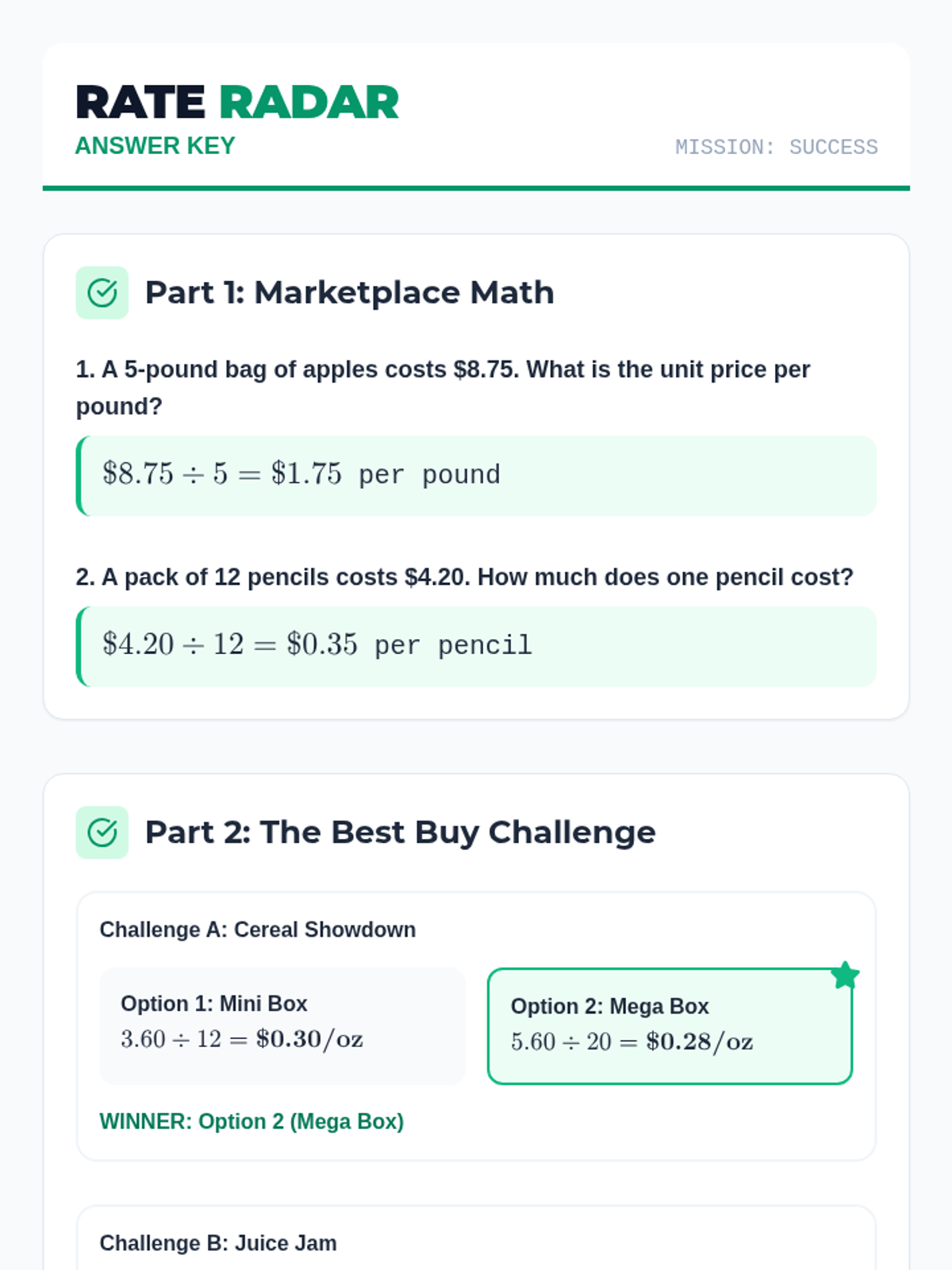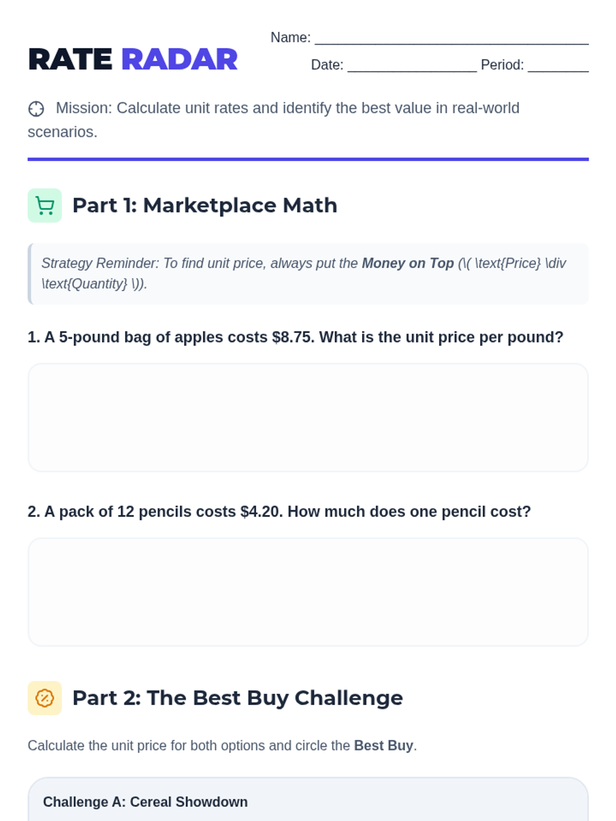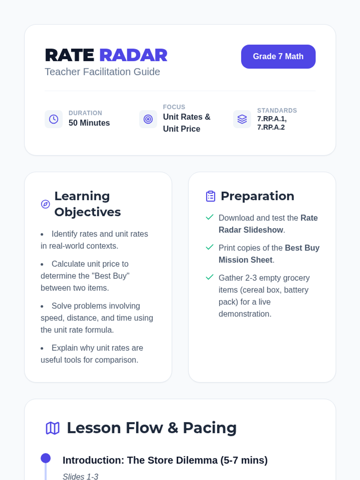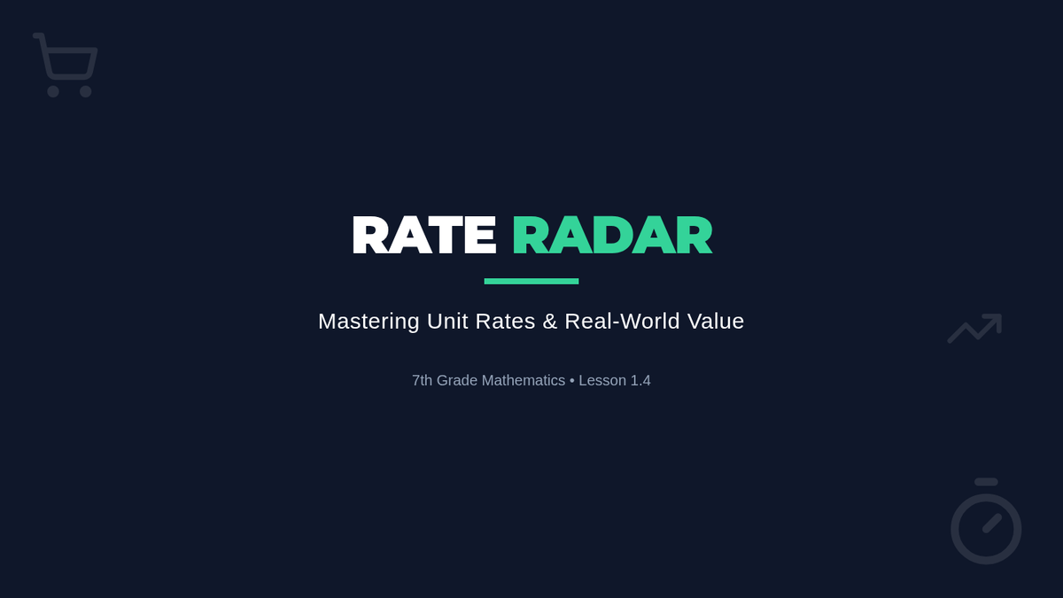 An interactive lesson for 7th grade students focusing on calculating unit rates, comparing prices to find the best buy, and solving real-world speed, distance, and time problems.