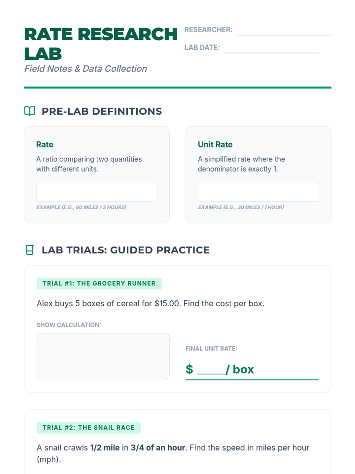 A deep dive into converting rates and complex fractions into unit rates, themed as a scientific exploration of grocery prices and speeds.