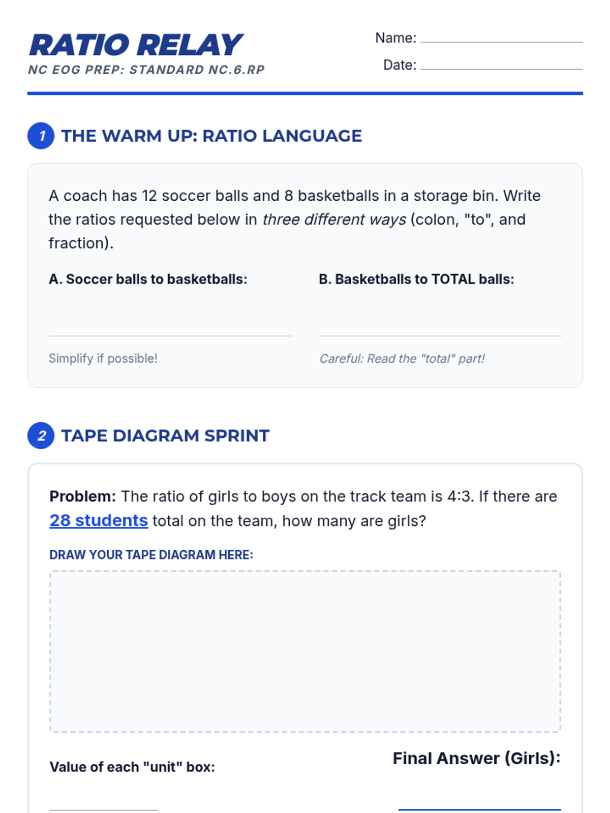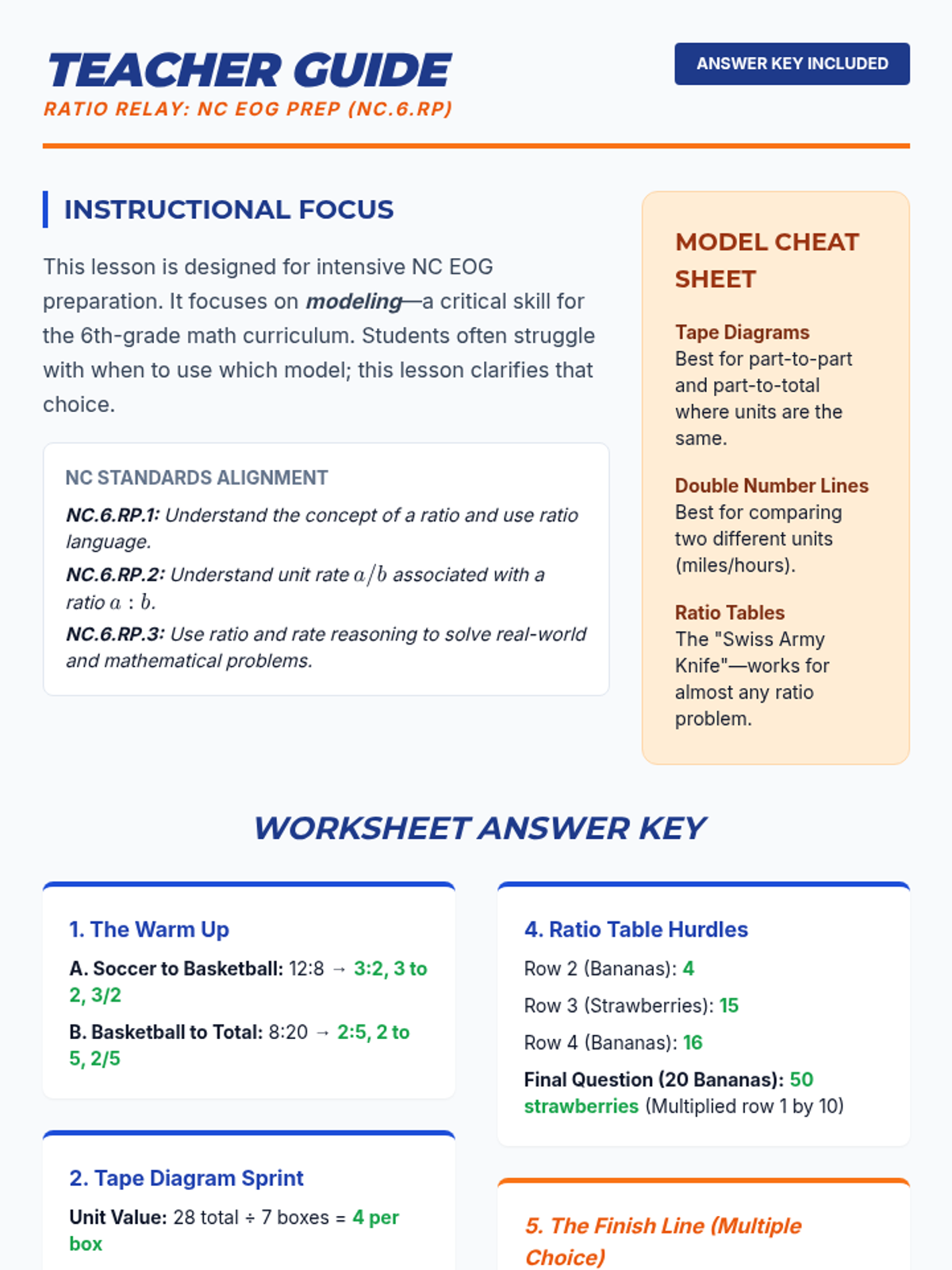 A comprehensive 6th-grade math lesson focused on North Carolina Standard Course of Study (NCSCOS) NC.6.RP. Students will master ratio concepts, unit rates, and real-world problem-solving using visual models like tape diagrams, double number lines, and ratio tables to prepare for the NC EOG.