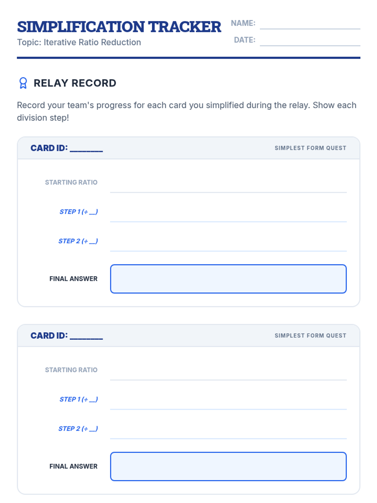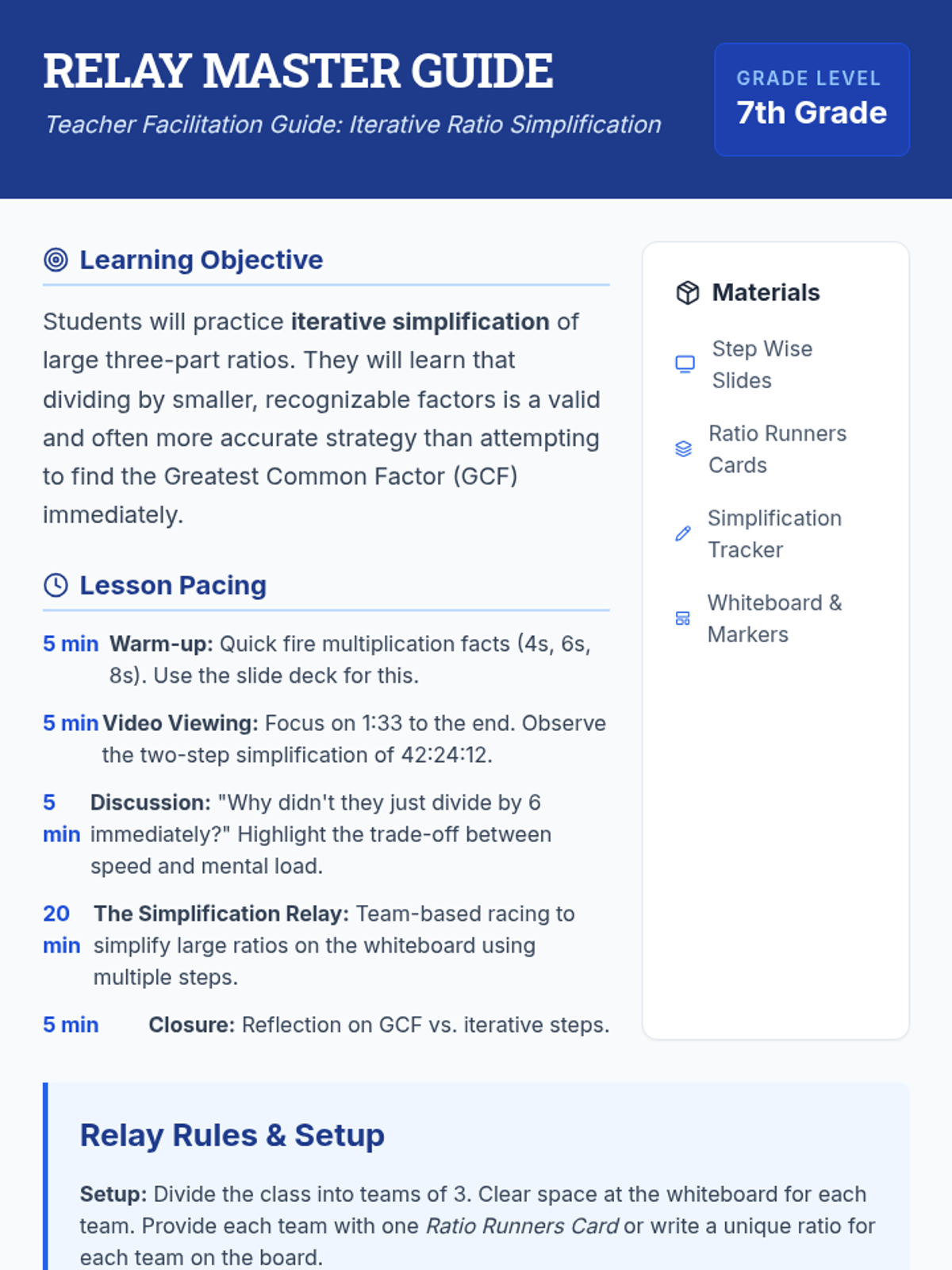 A lesson focused on the iterative simplification of three-part ratios, helping students understand that multiple steps are often easier than finding the greatest common factor immediately.