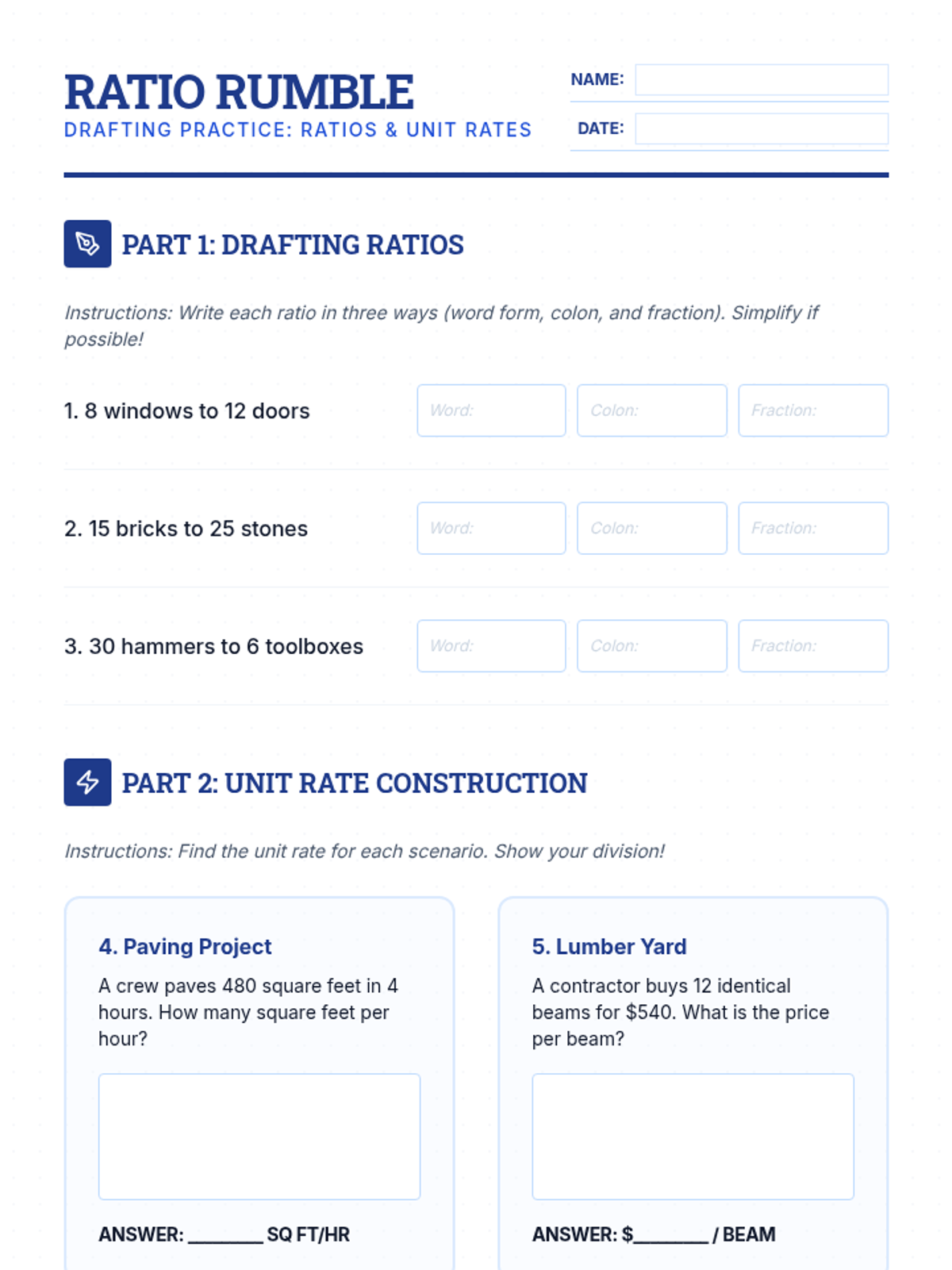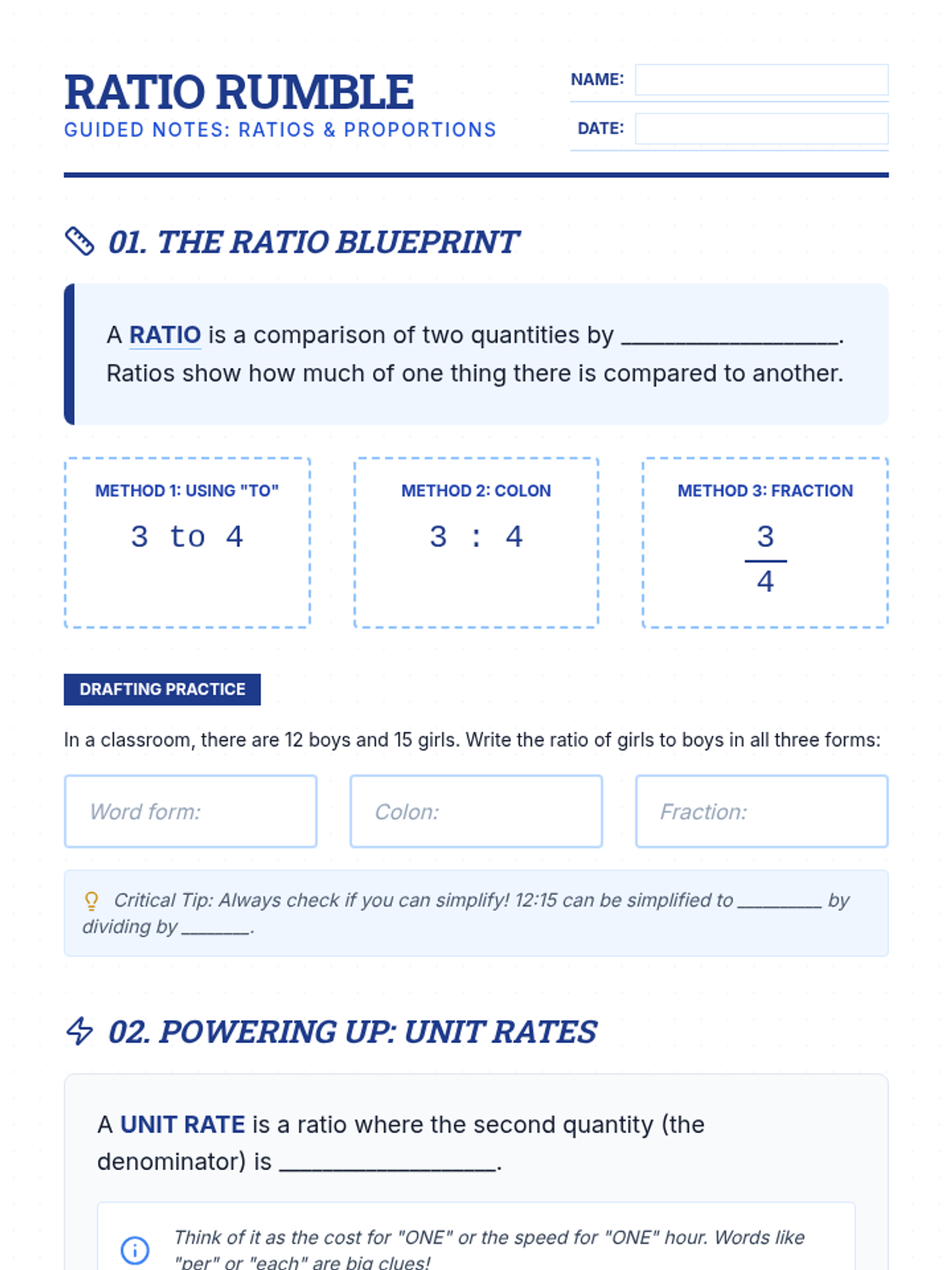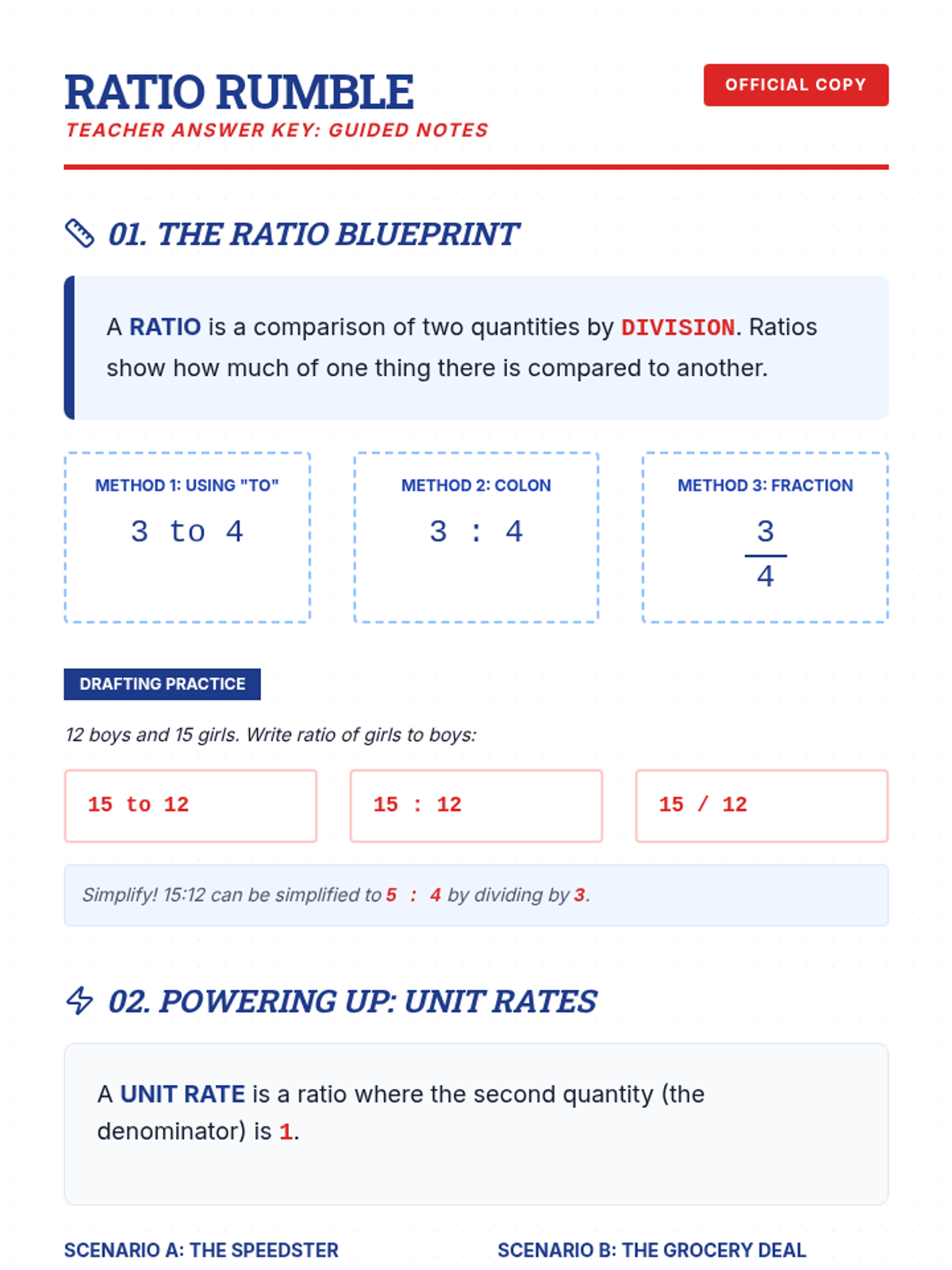 A comprehensive introduction to ratios, unit rates, and proportions using real-world scaling and architectural concepts.