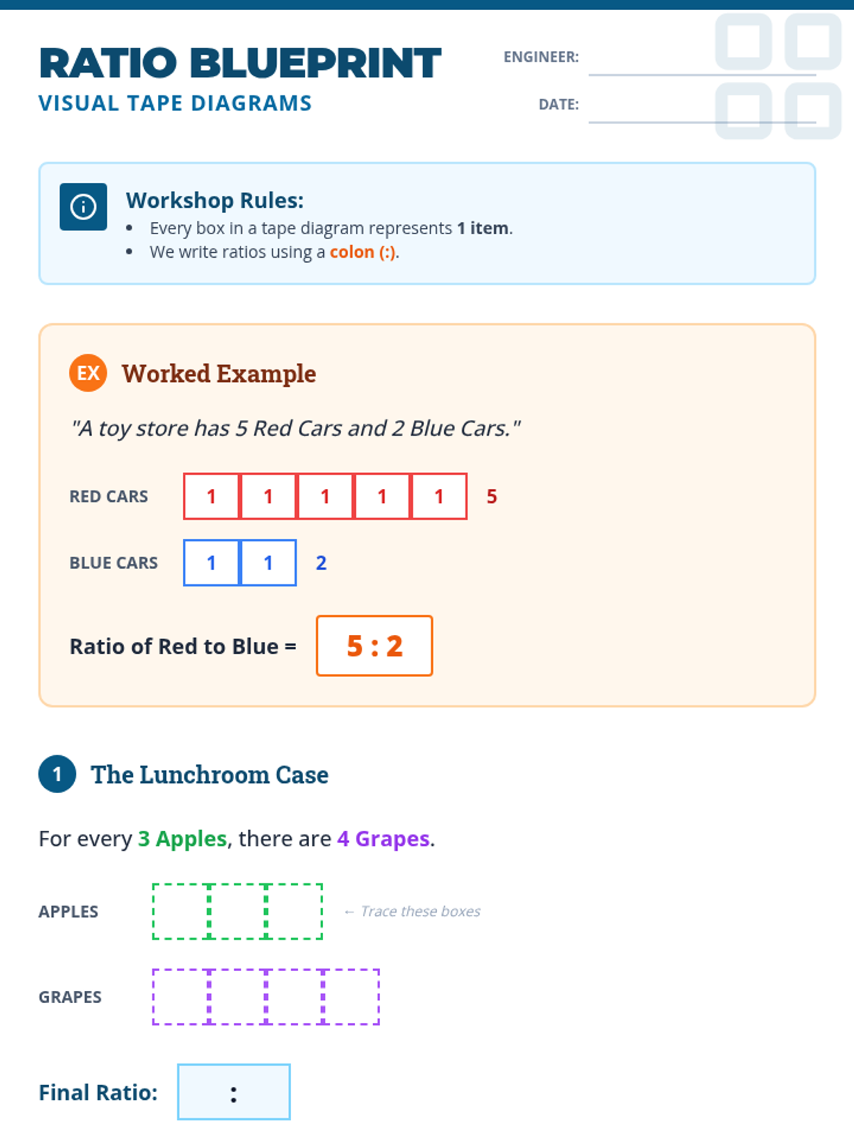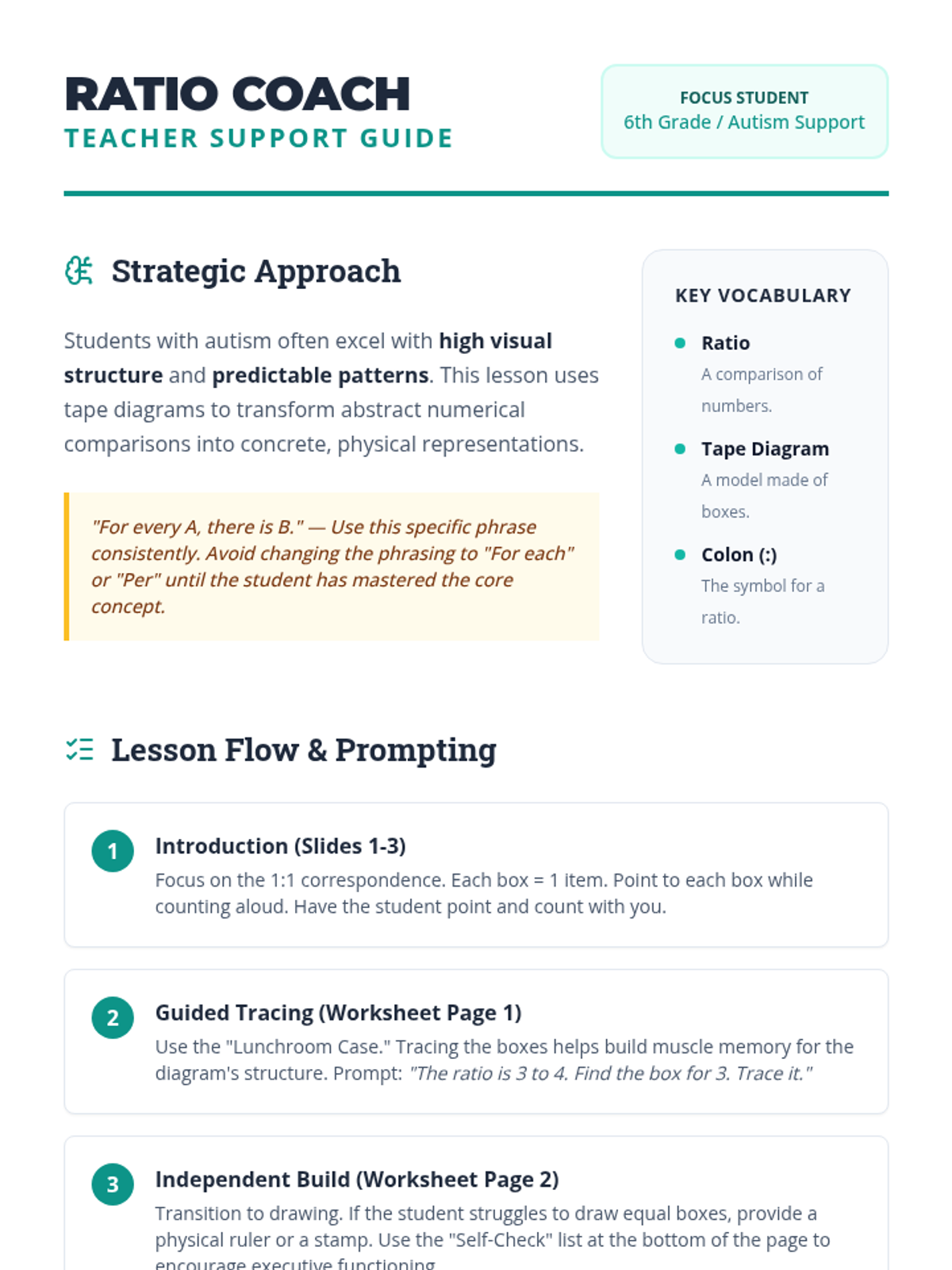 A specialized lesson focusing on understanding ratios through tape diagrams and bar models, designed with high visual structure and step-by-step guidance for 6th-grade students with autism.