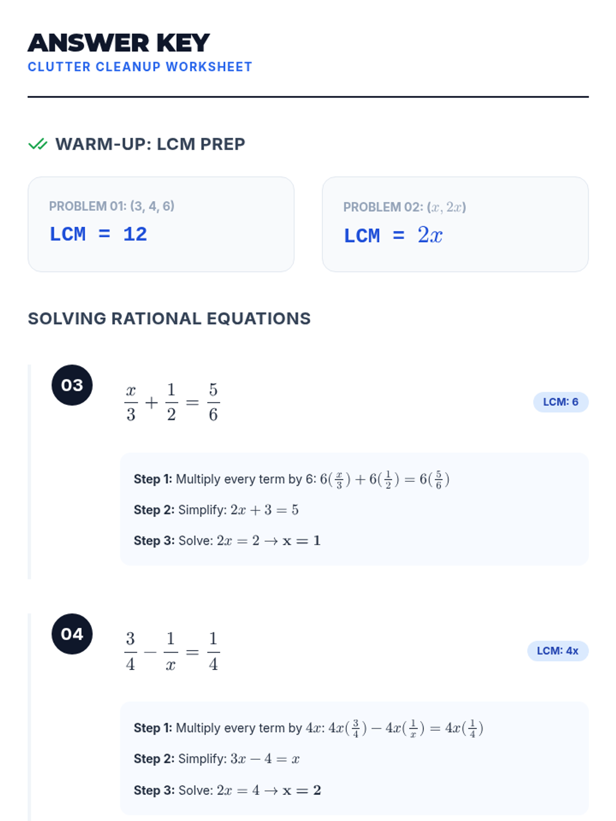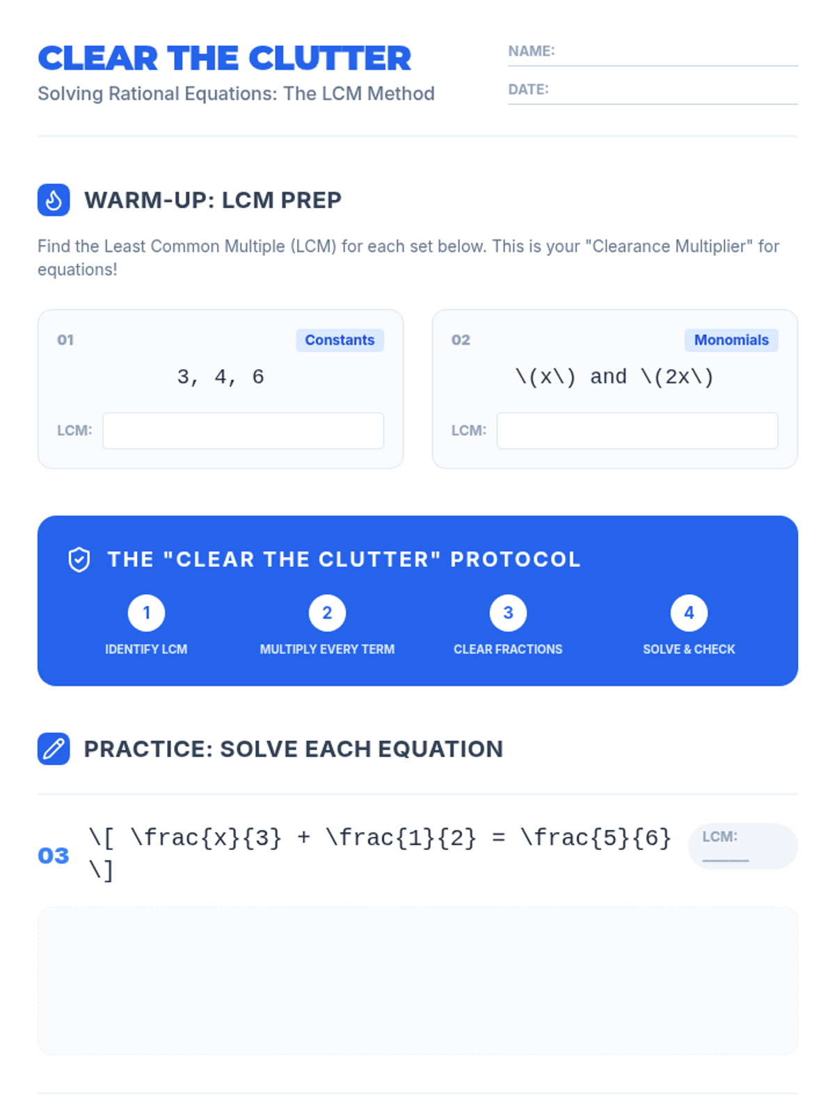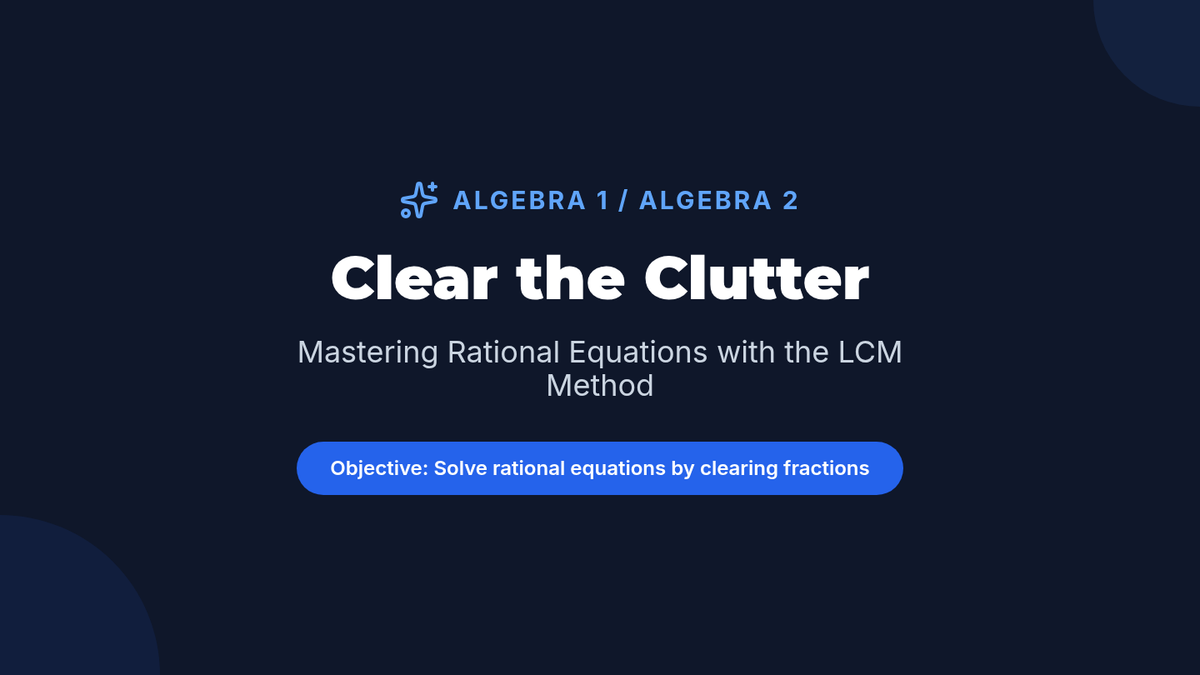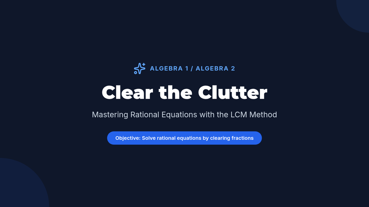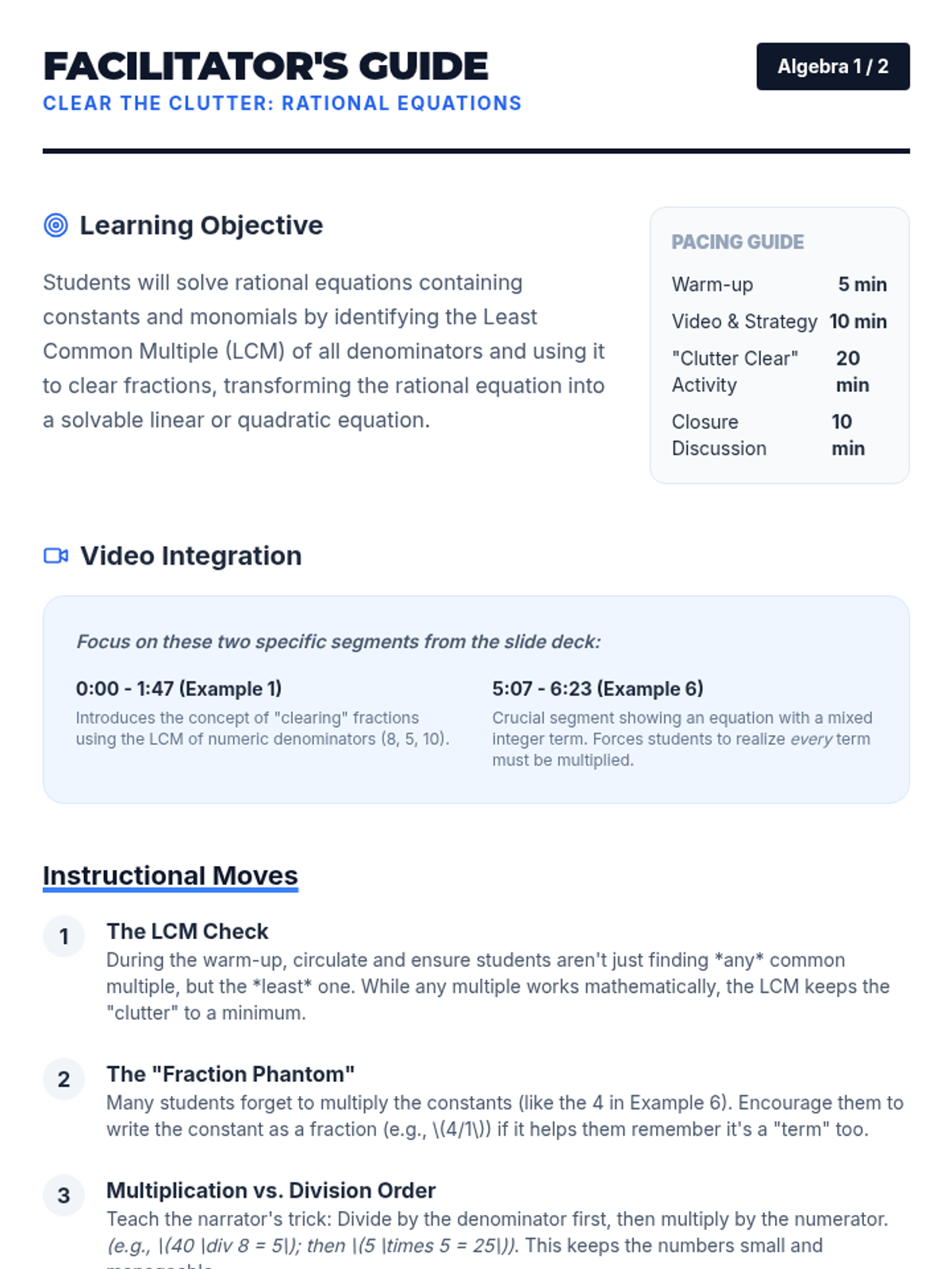 A high school algebra lesson focused on solving rational equations by clearing fractions using the Least Common Multiple (LCM) method. Includes a video-guided presentation, a practice worksheet, and a facilitator's guide.