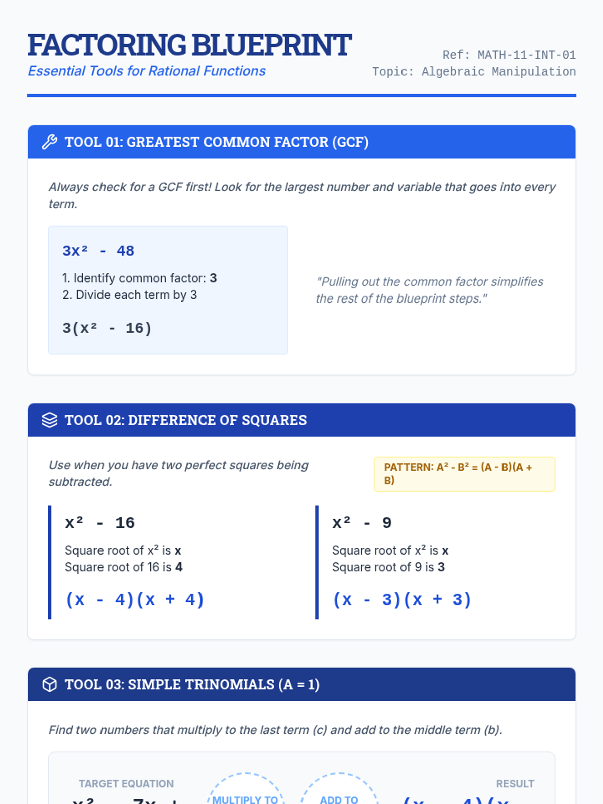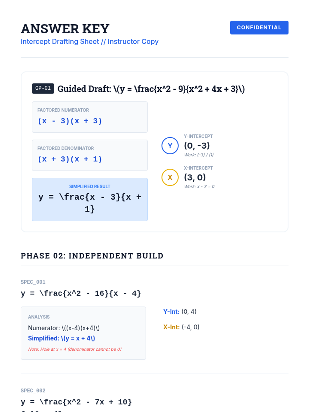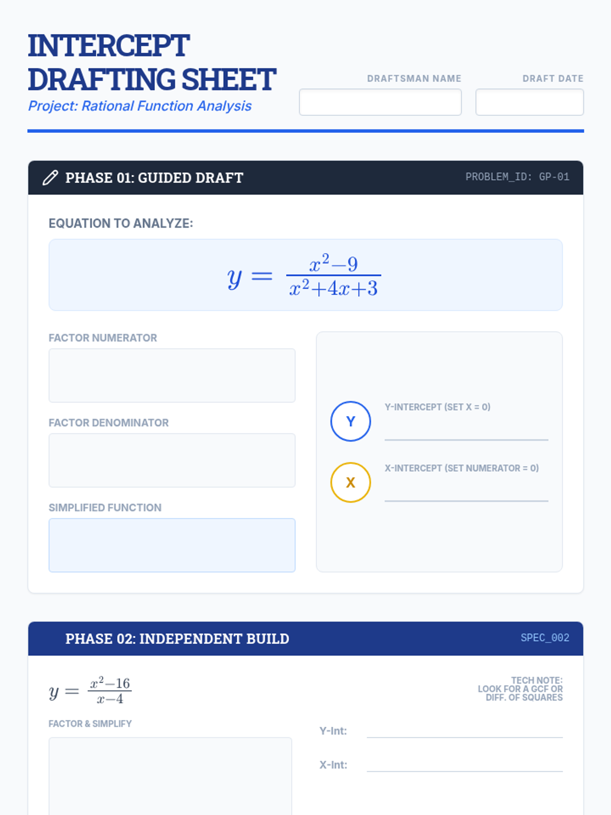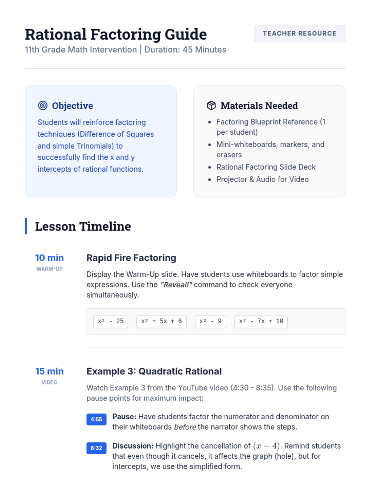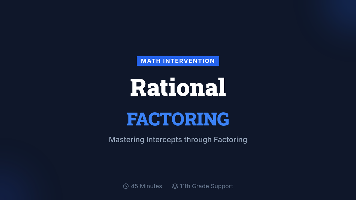 A high-school math intervention lesson focused on mastering factoring techniques (Difference of Squares and Trinomials) to find the intercepts of rational functions.