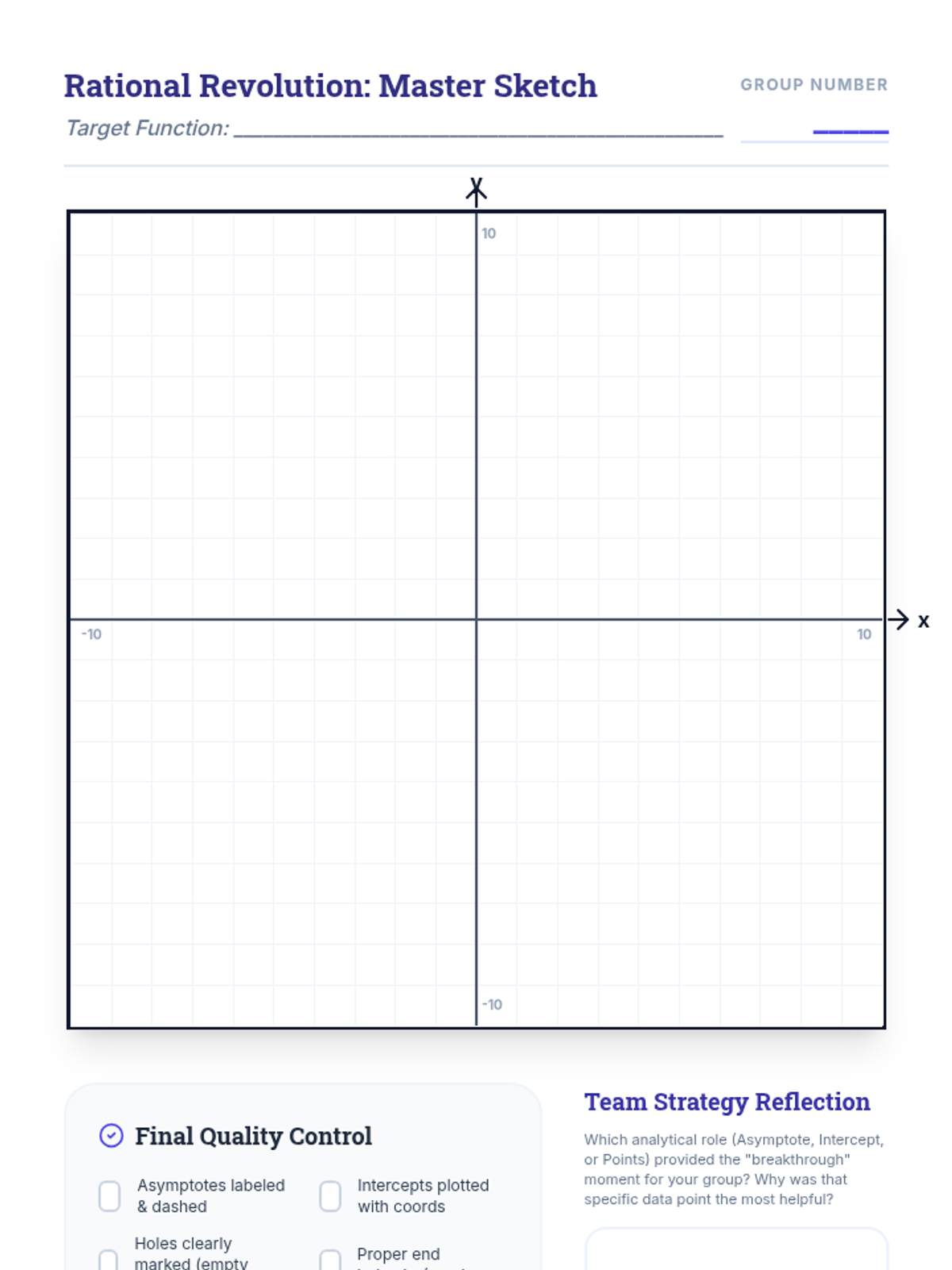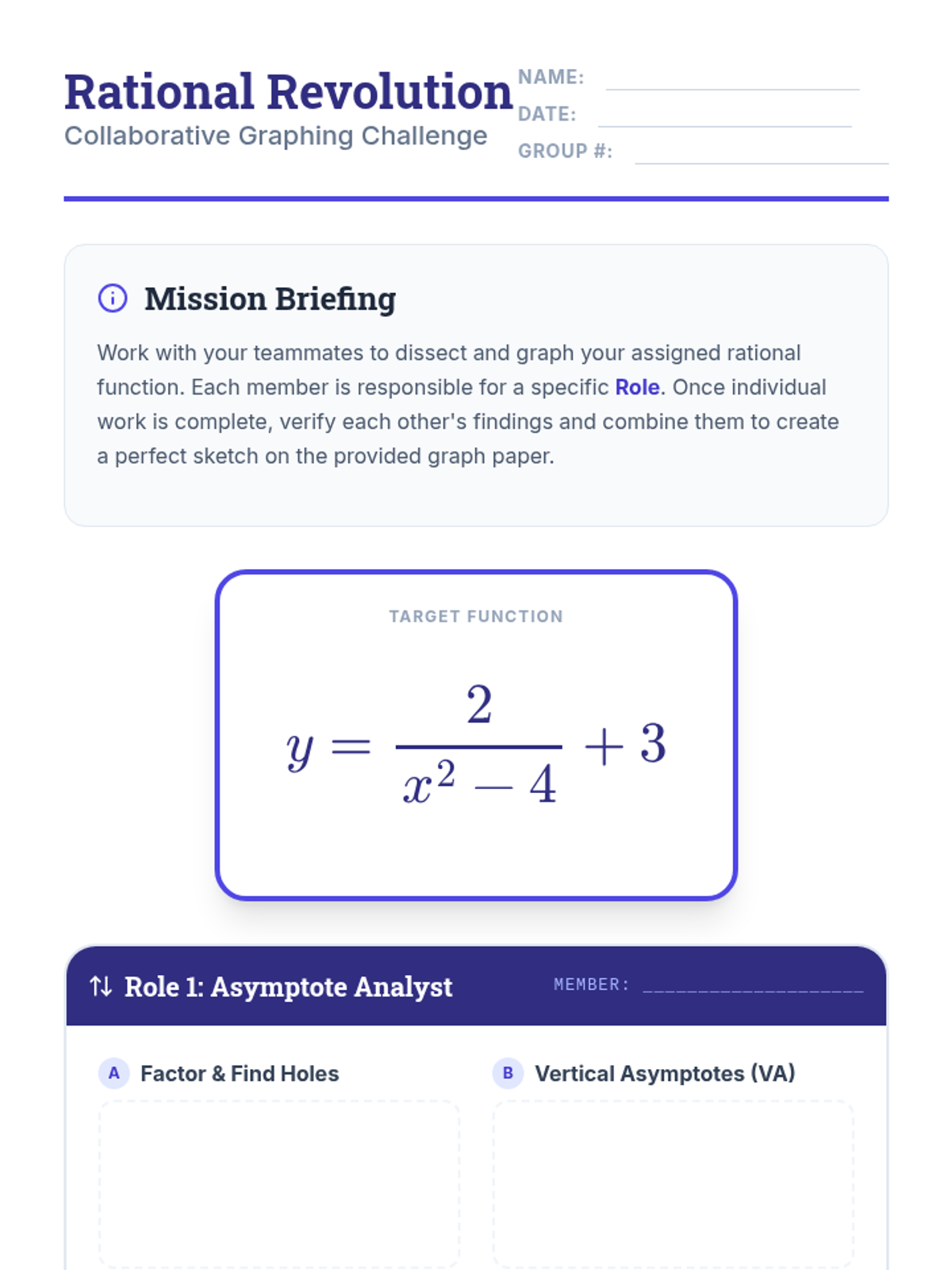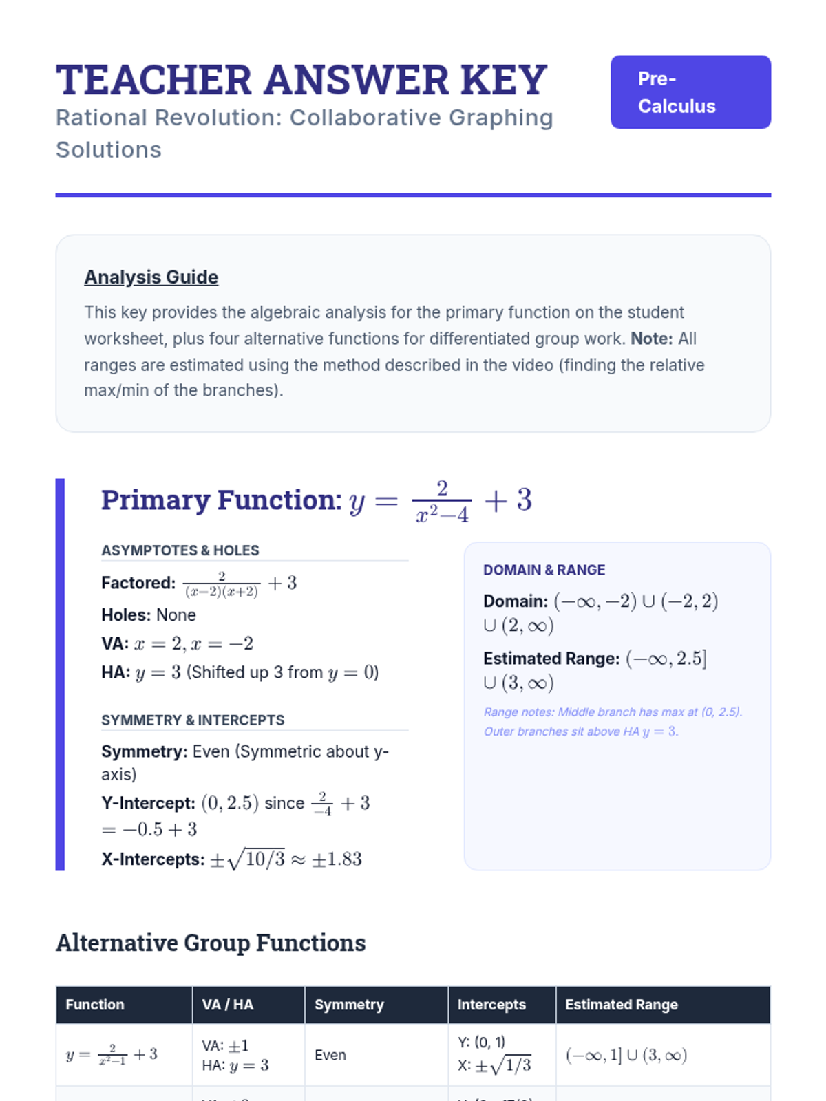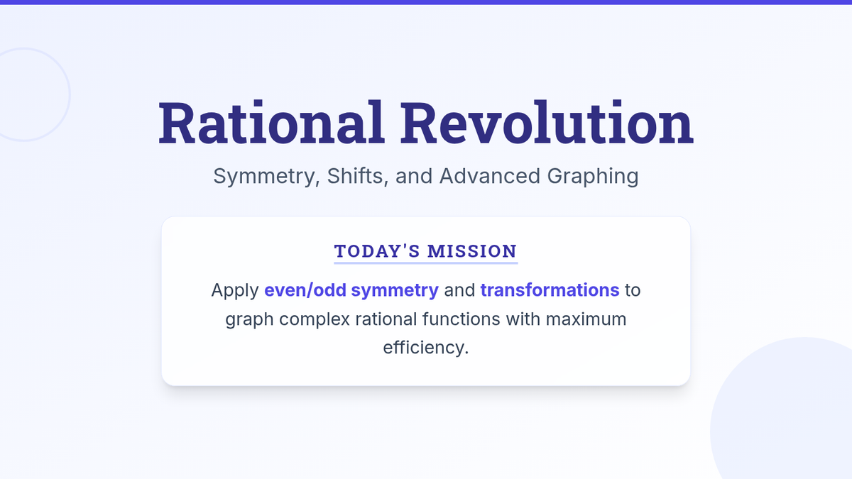 A high-school Pre-Calculus lesson focusing on graphing advanced rational functions through the lens of transformations and even/odd symmetry. Students watch a targeted video segment, participate in a collaborative 'role-based' graphing activity, and practice estimating domain and range.