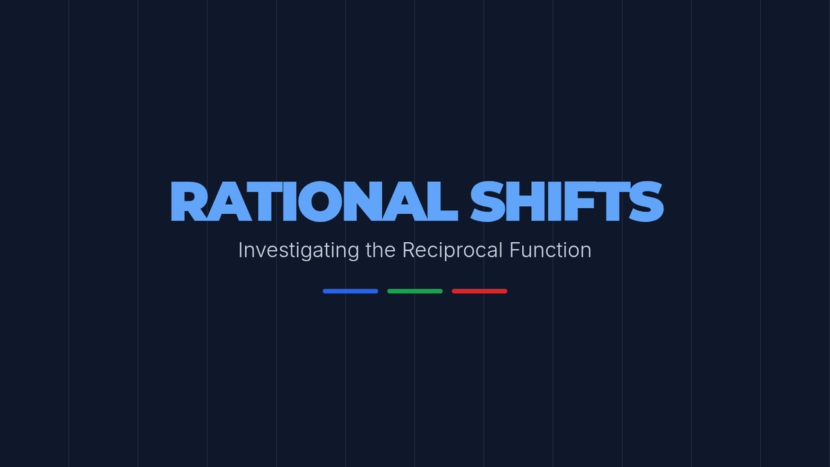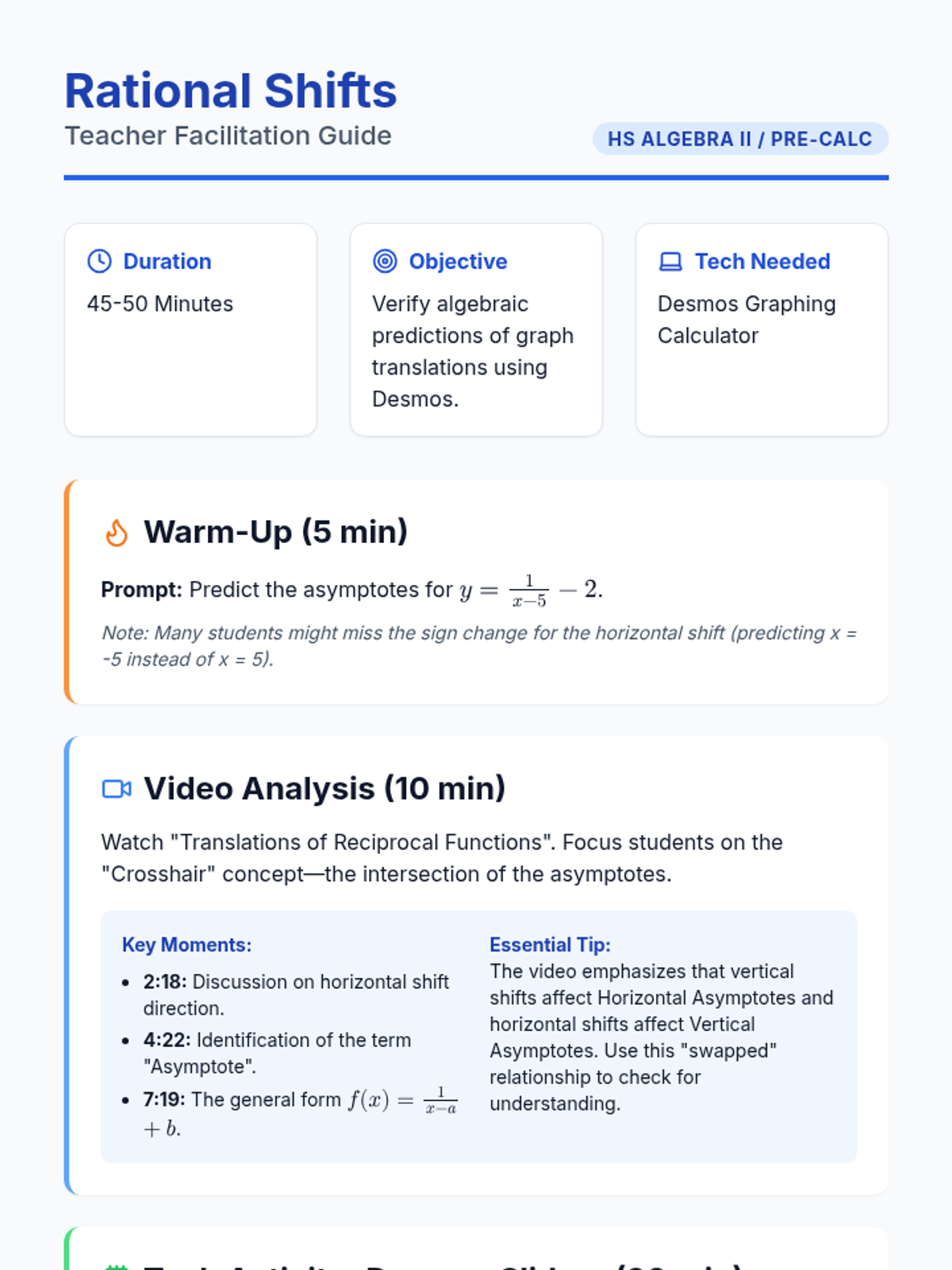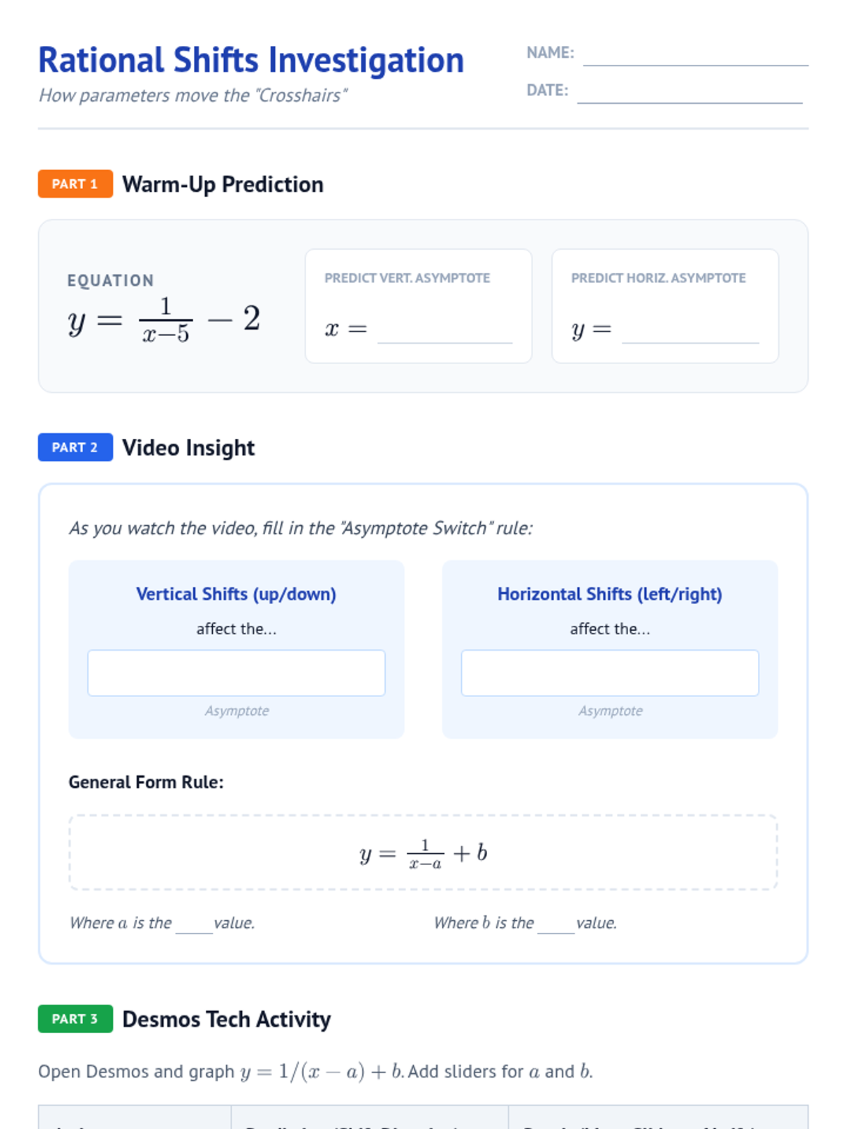 A high school math lesson focused on identifying and verifying translations of the reciprocal function $y = 1/x$ using algebra and Desmos graphing technology. Students explore how parameters $a$ and $b$ in $y = 1/(x-a) + b$ shift the graph's vertical and horizontal asymptotes.