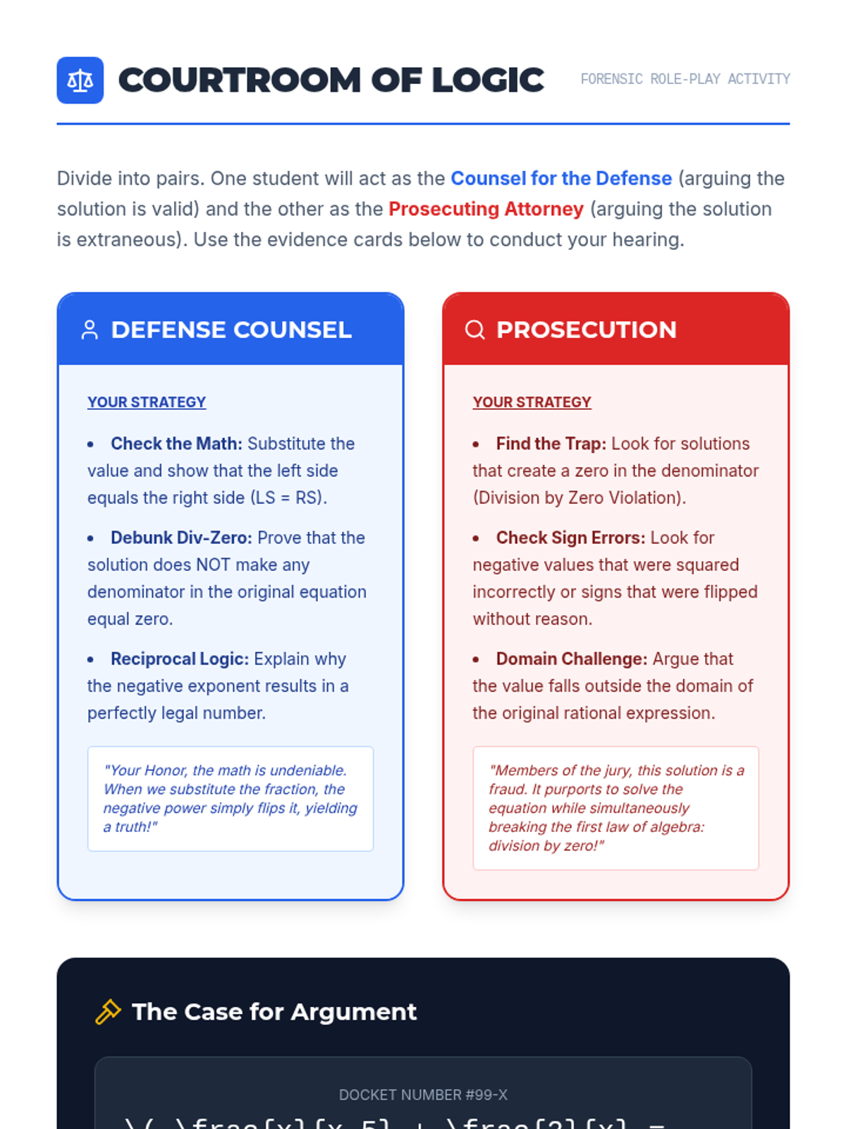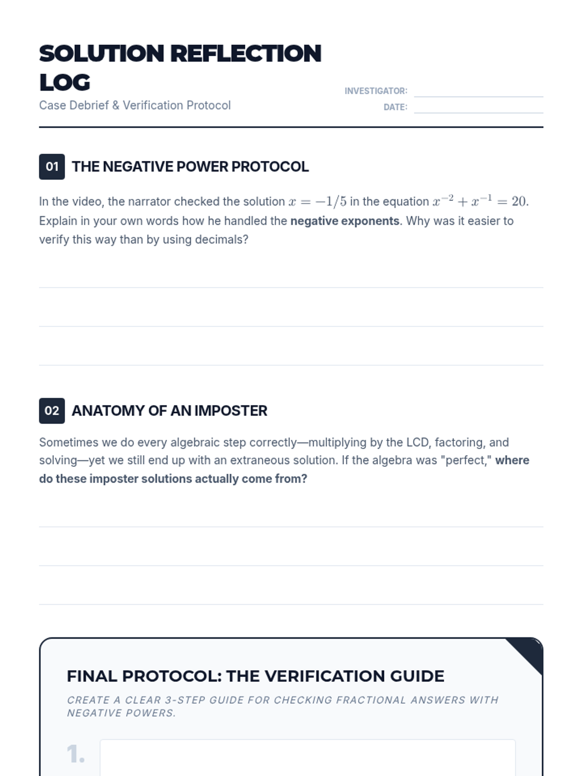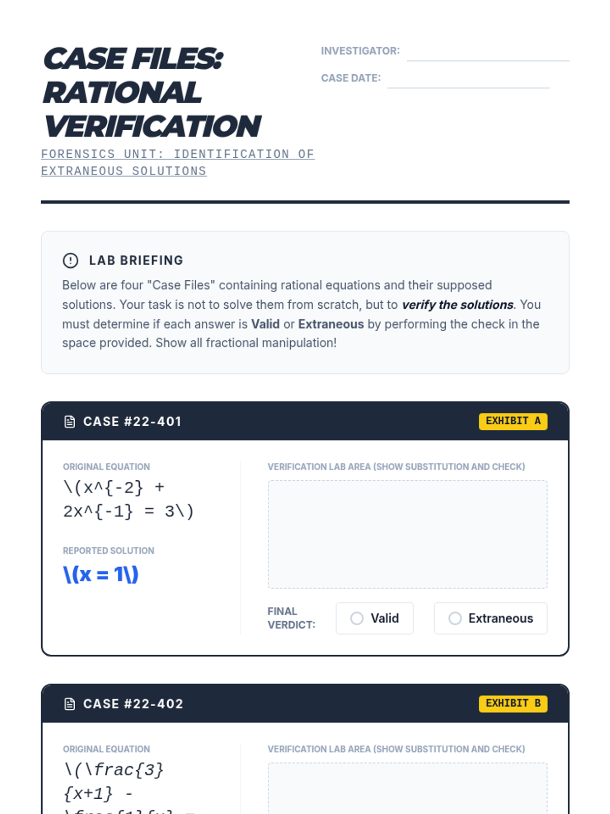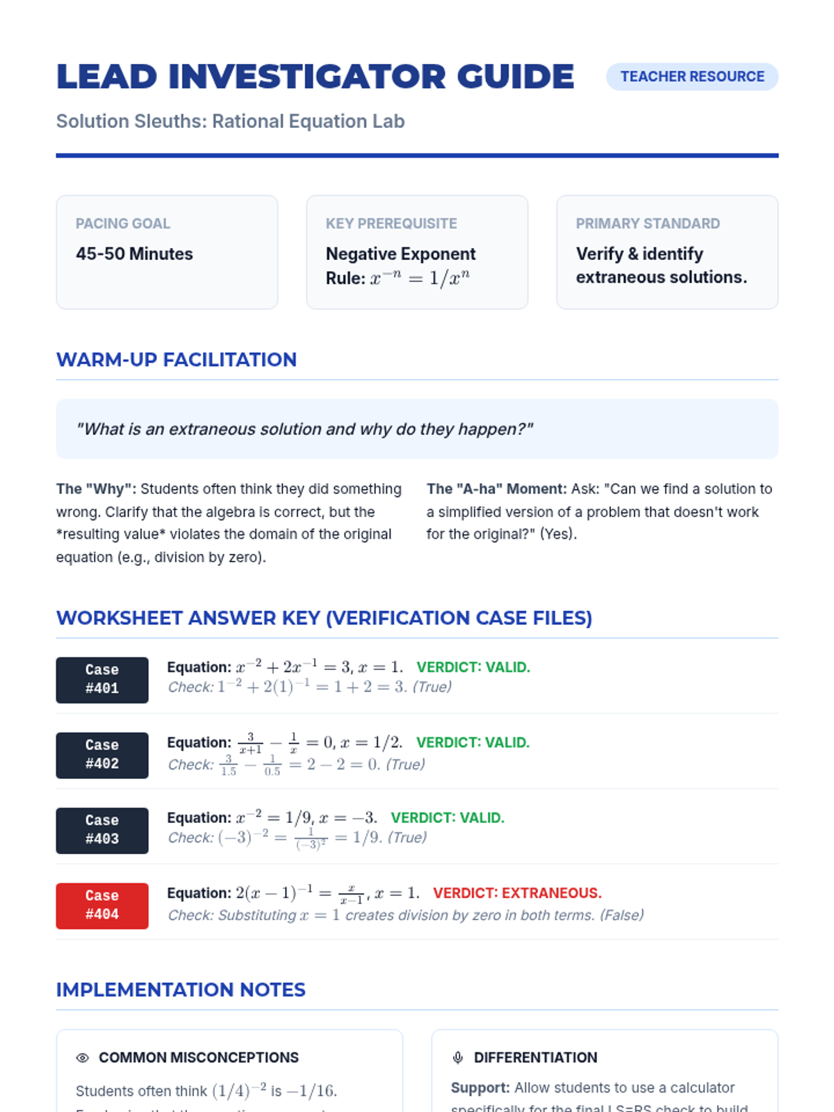 Students will investigate the validity of solutions to rational equations, focusing on identifying extraneous solutions and mastering the verification of answers involving negative exponents and fractions.