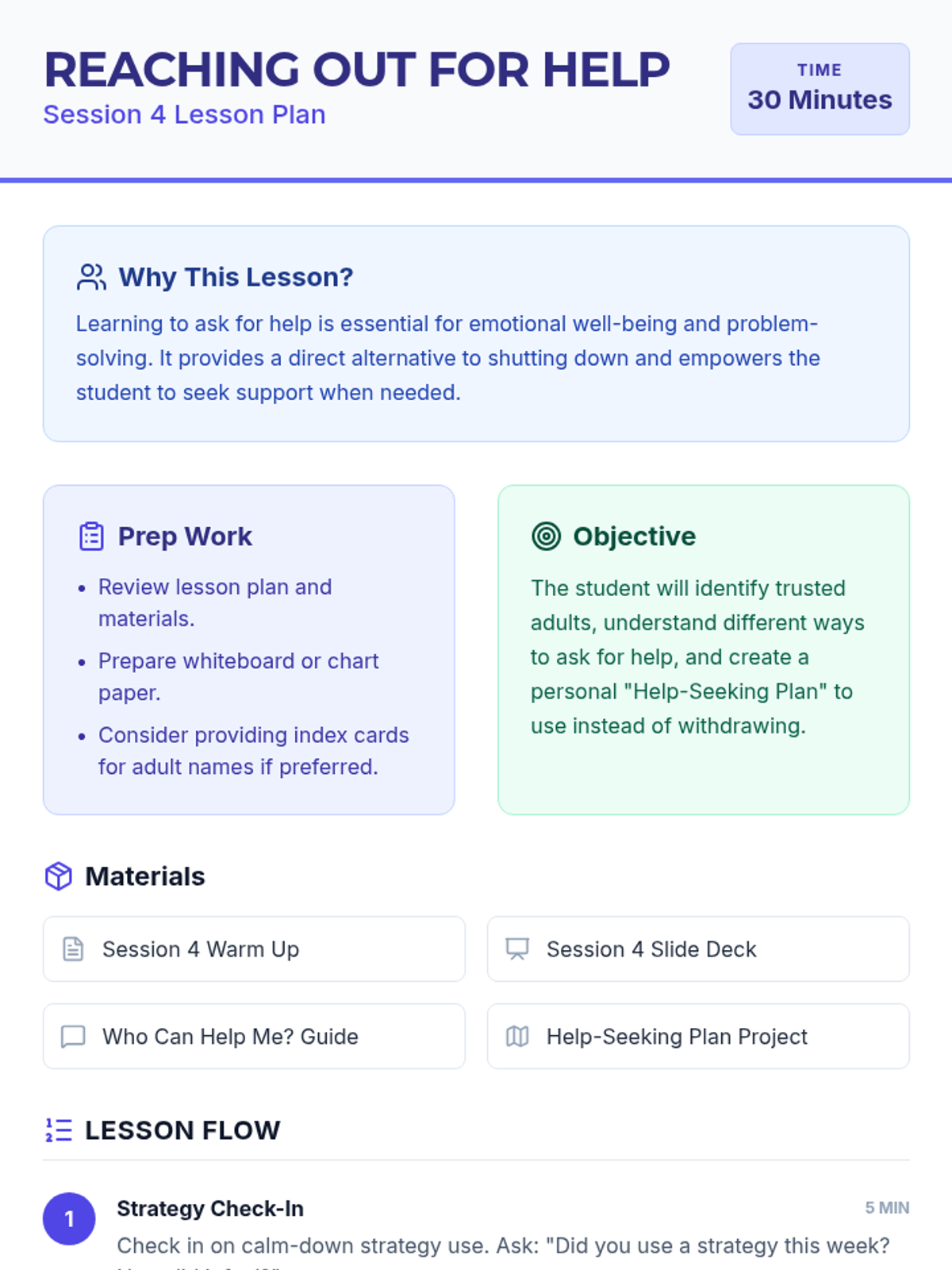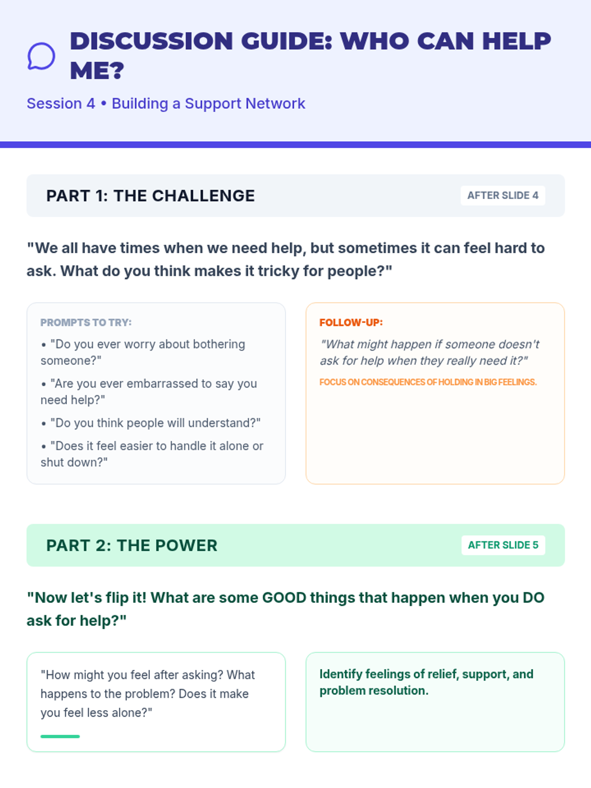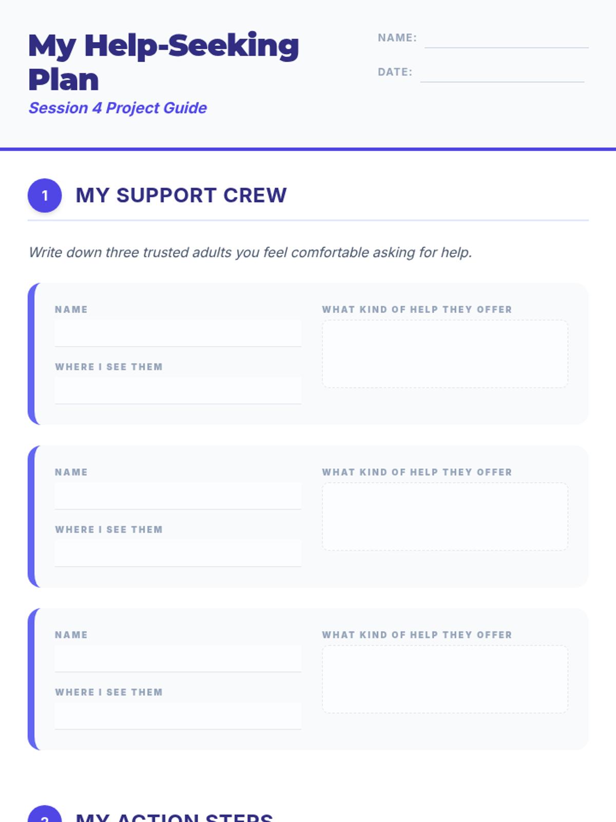 Helps students identify trusted adults at home and school and develop specific ways to ask for support, fostering self-advocacy skills.