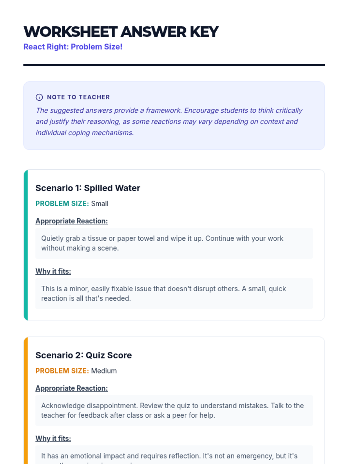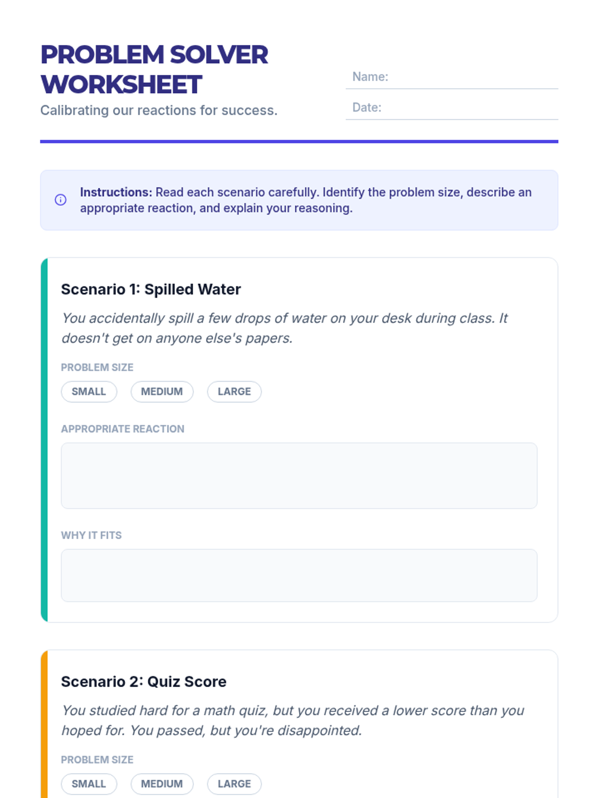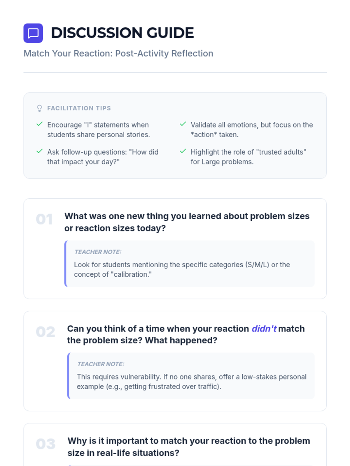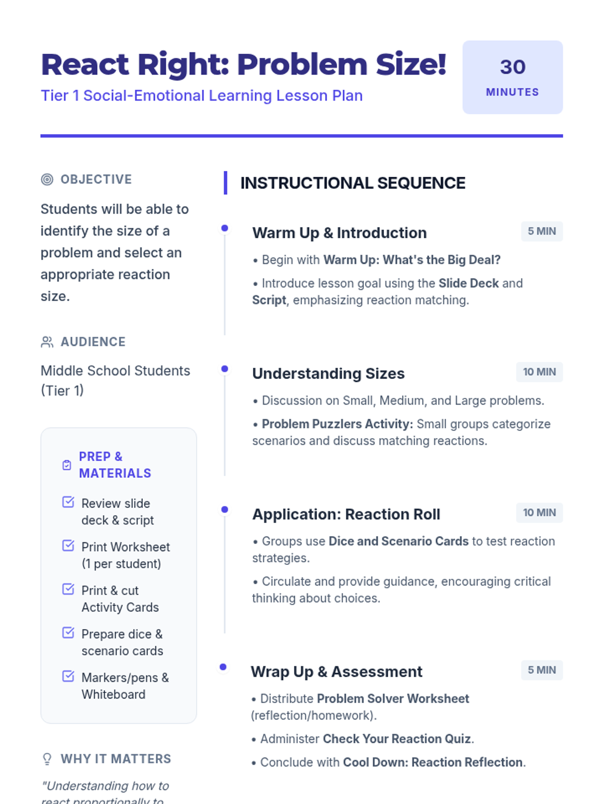 A middle school social-emotional learning lesson focused on identifying problem sizes (small, medium, large) and matching them with appropriate emotional reactions. Students engage in interactive scenario-based activities to develop self-regulation and social-emotional awareness.