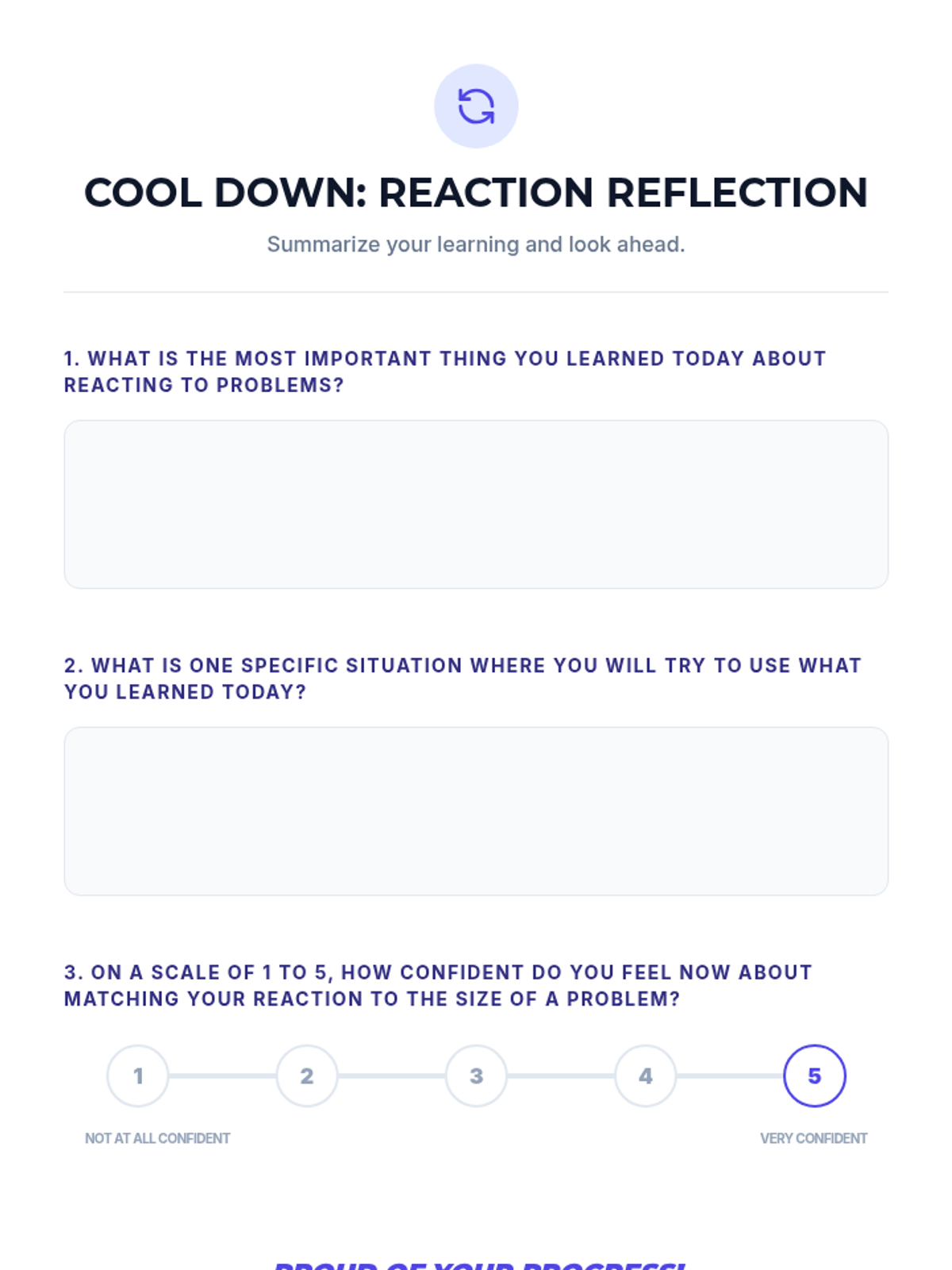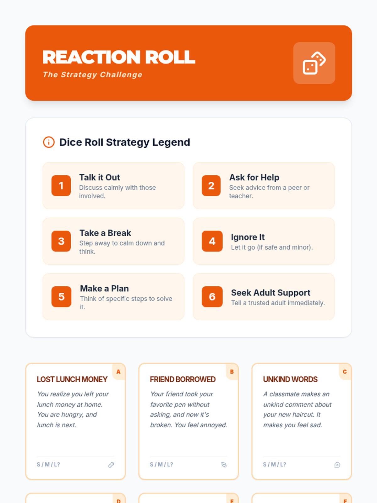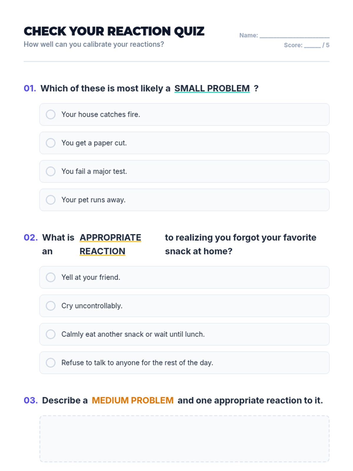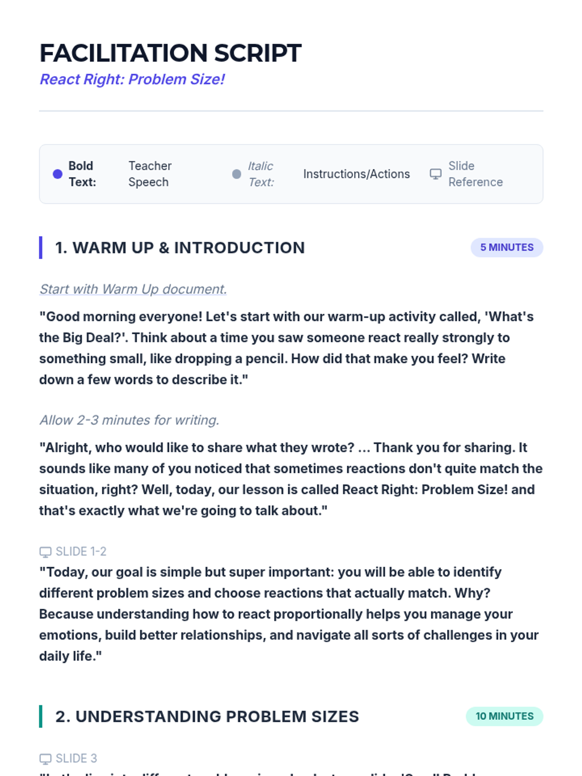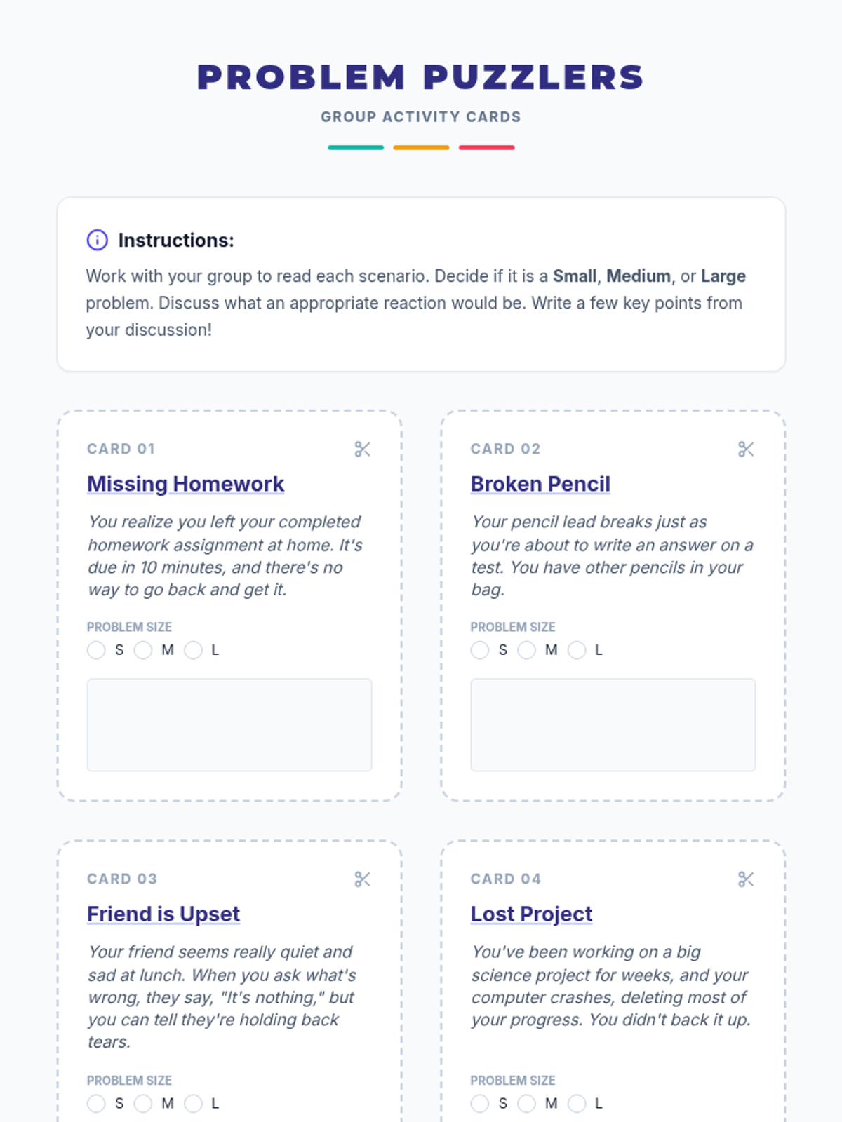 A middle school social-emotional learning lesson focused on identifying problem sizes (small, medium, large) and matching them with appropriate emotional reactions. Students engage in interactive scenario-based activities to develop self-regulation and social-emotional awareness.