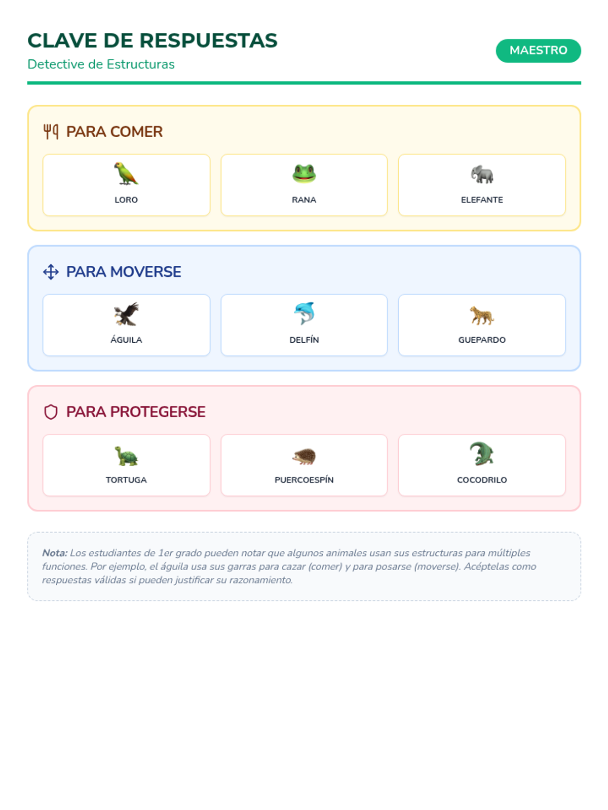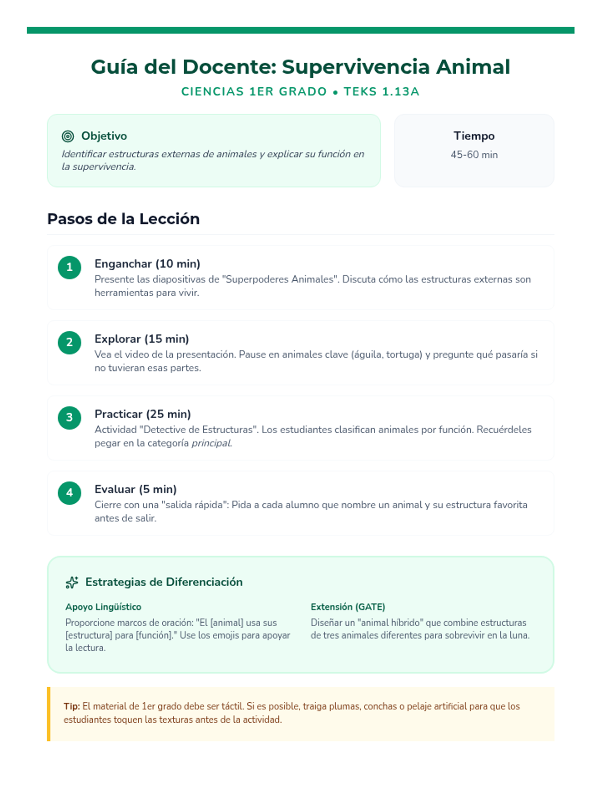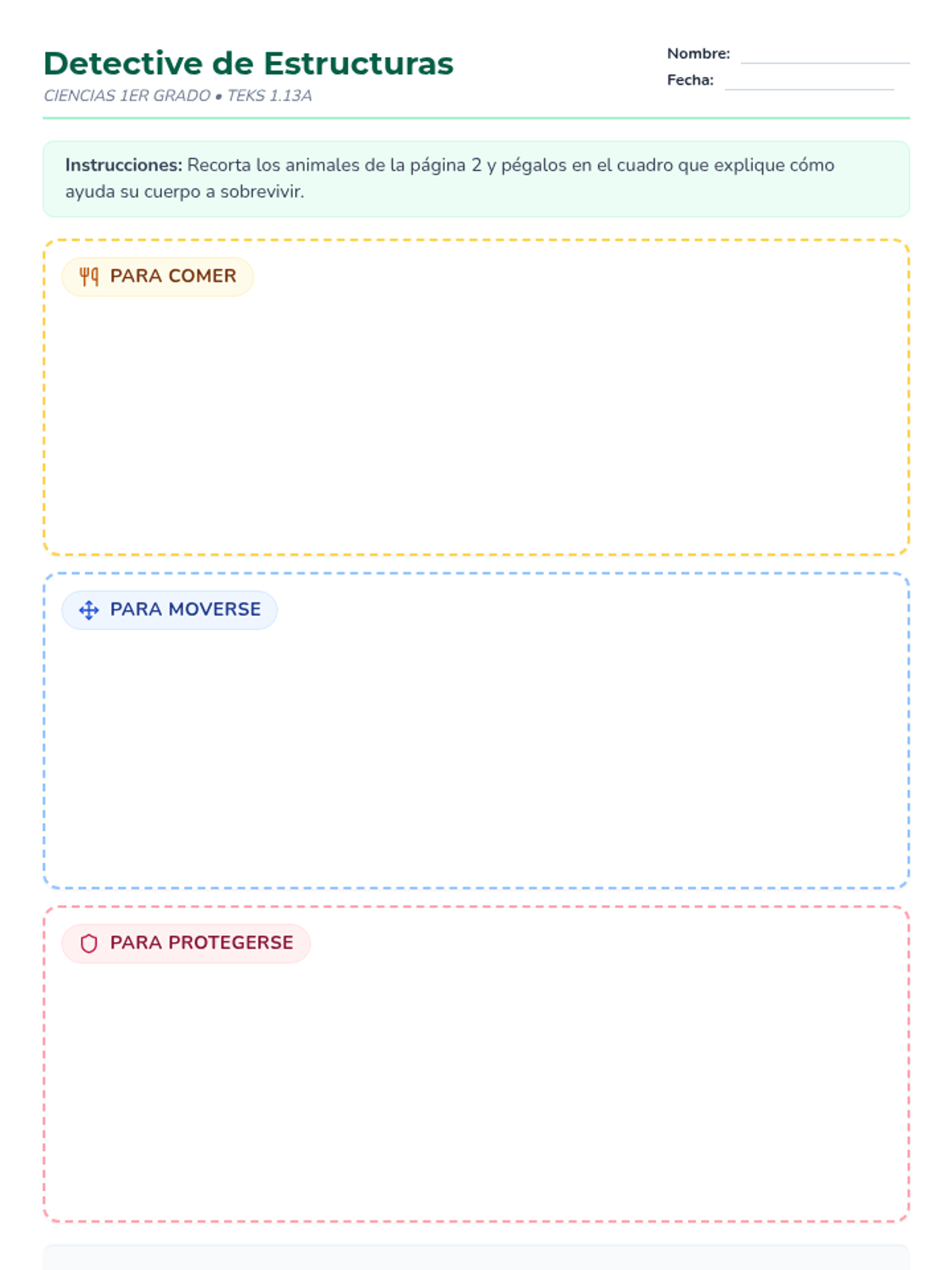 Una lección interactiva sobre las estructuras externas de los animales y cómo estas partes les ayudan a sobrevivir en su entorno, alineada con TEKS 1.13A.