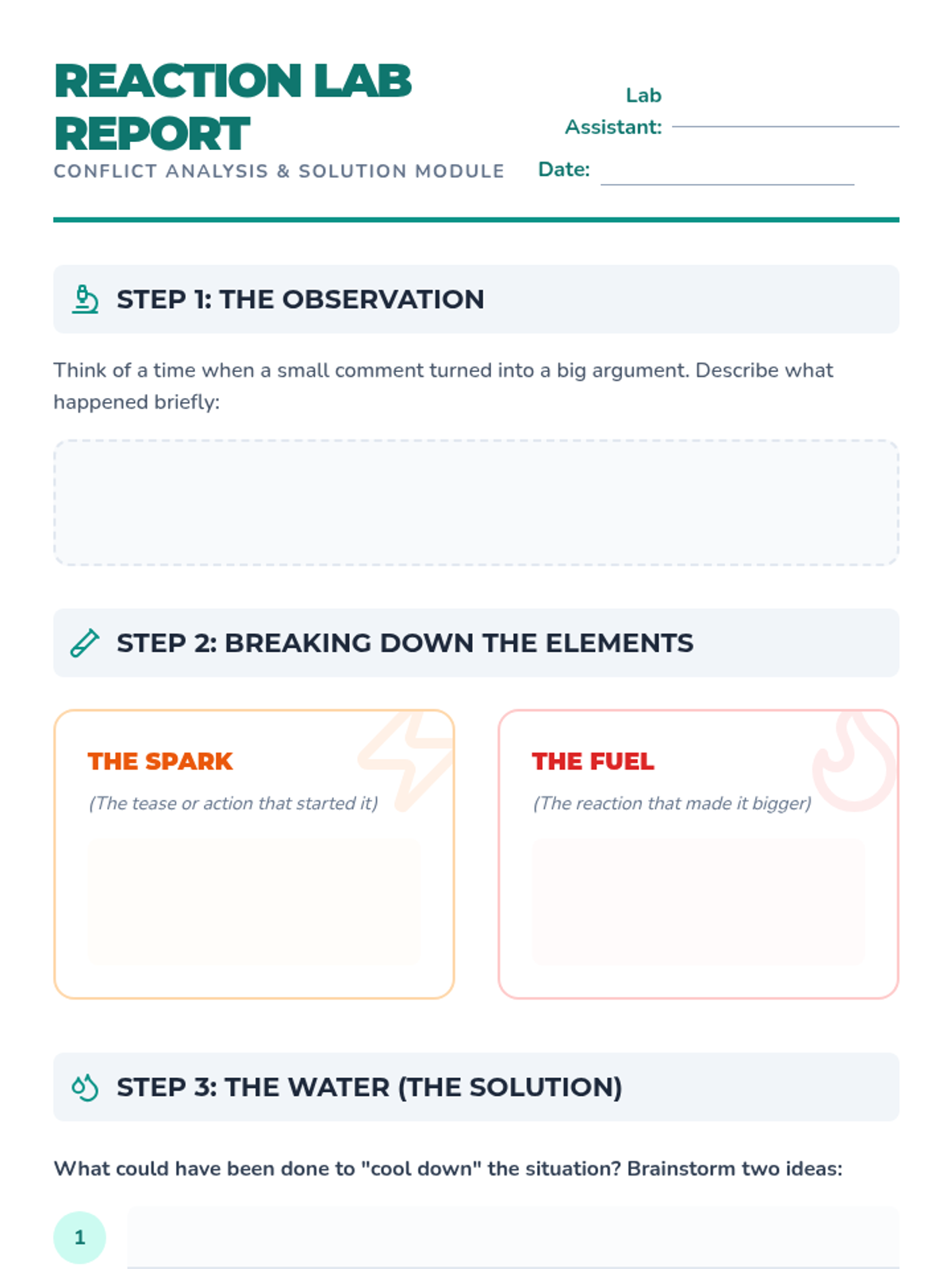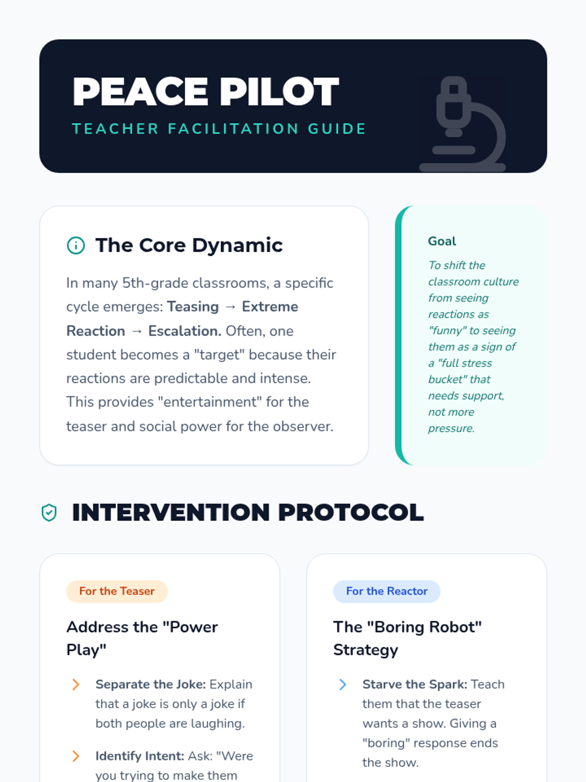 A social-emotional workshop for 5th graders focusing on the cycle of teasing and extreme reactions. Students explore how to break the chain of conflict through empathy and self-regulation.