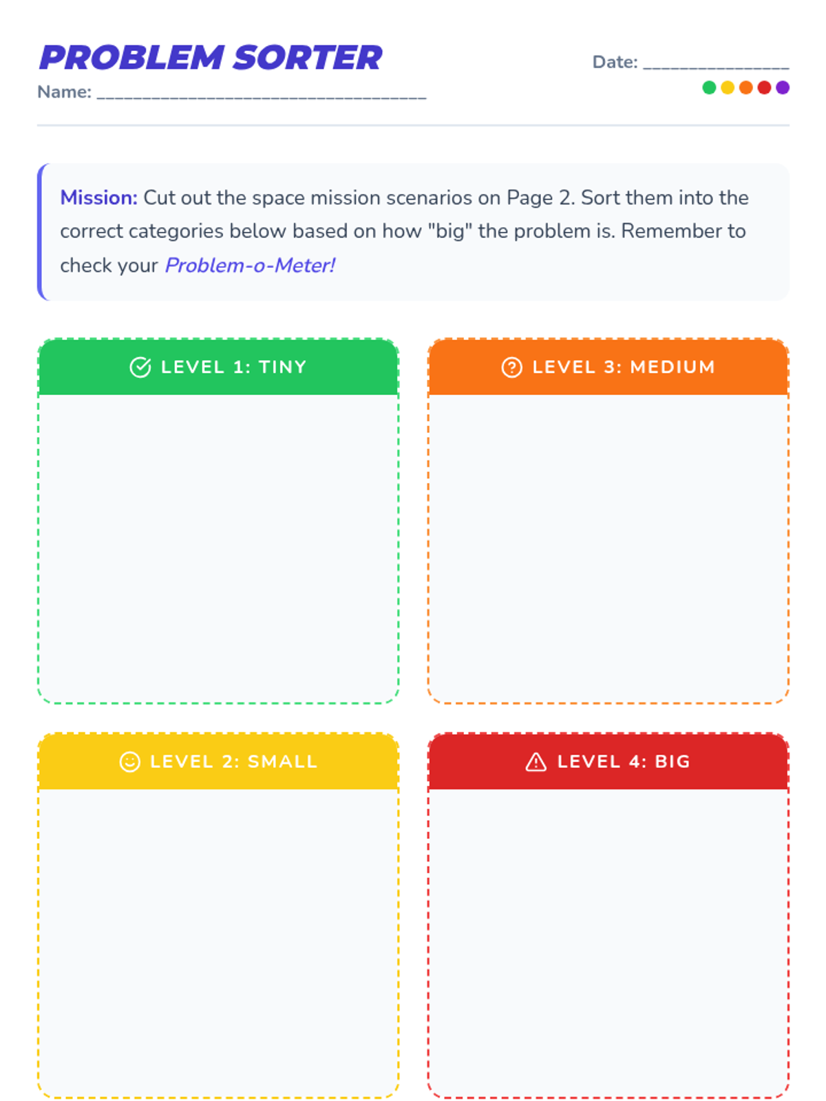 A social-emotional learning lesson for K-2 students to identify the 'size' of different problems and determine appropriate reactions using a space-themed 'Problem-o-Meter'.