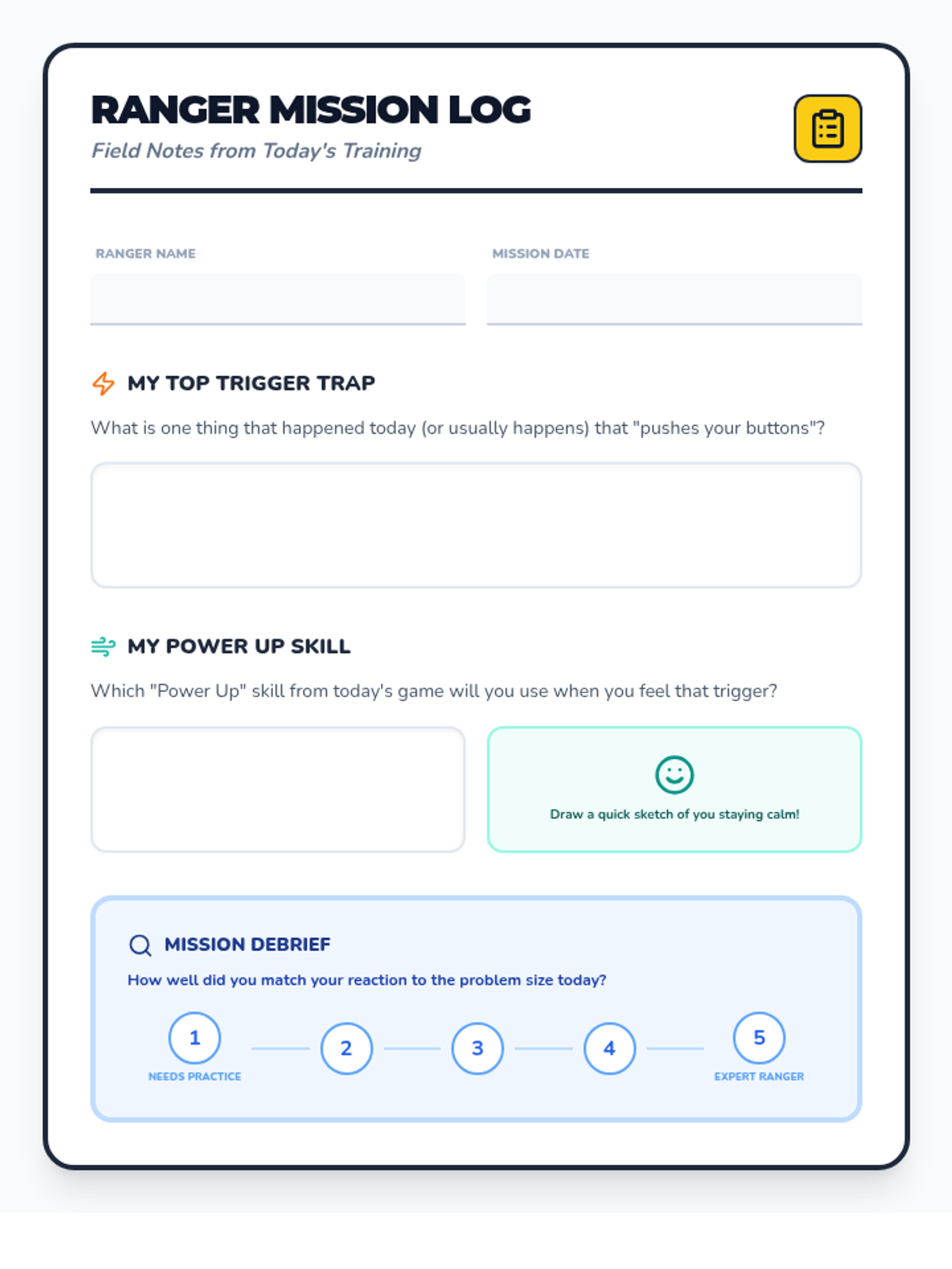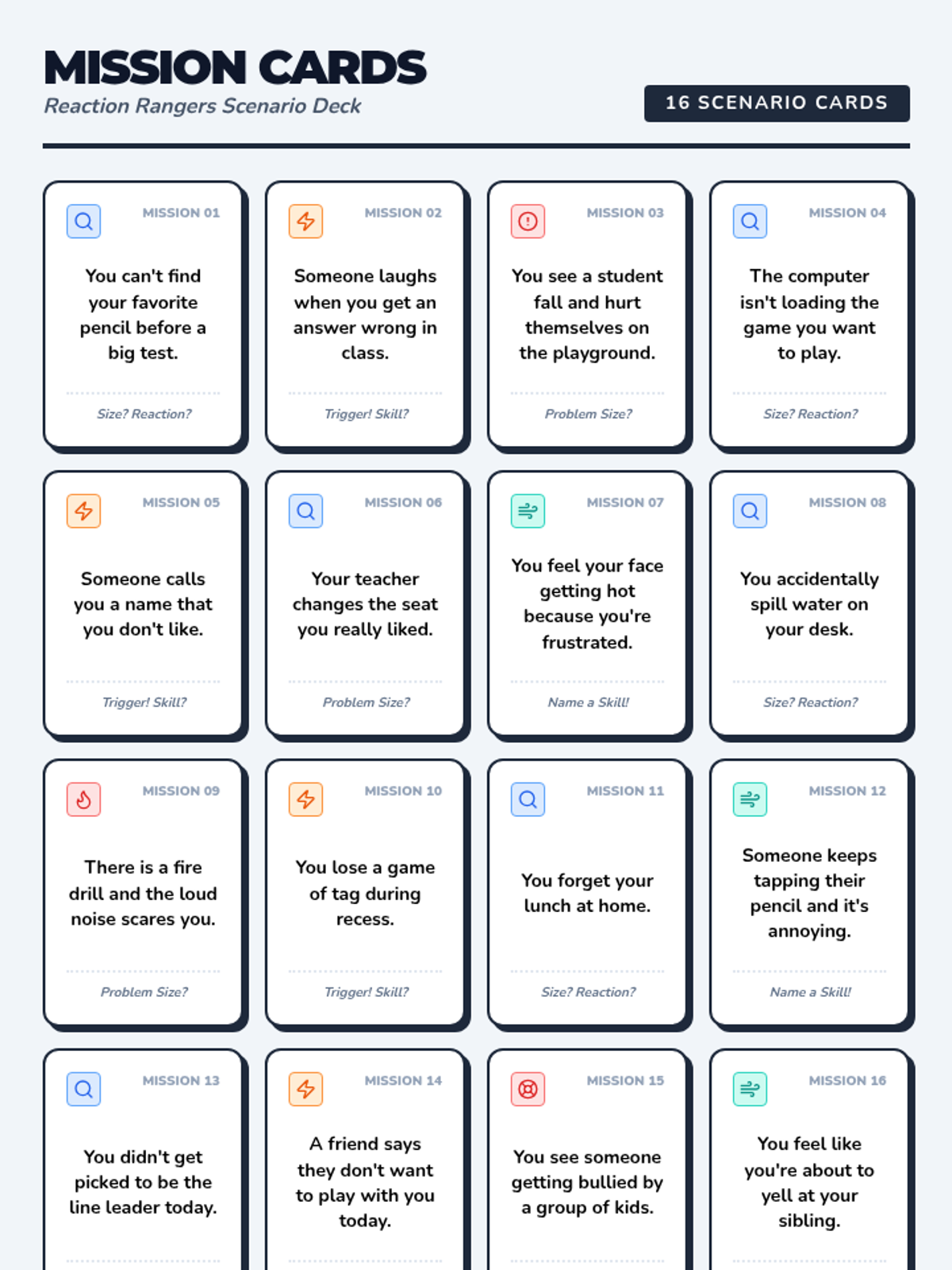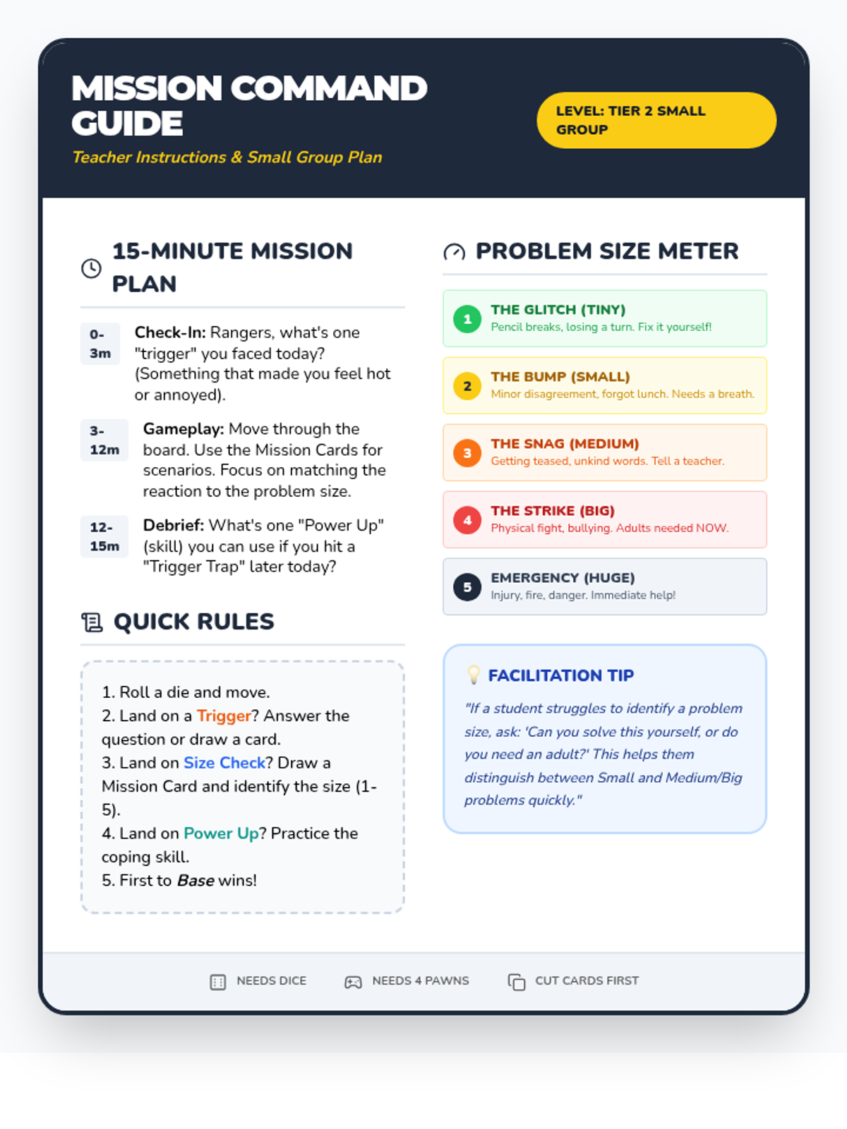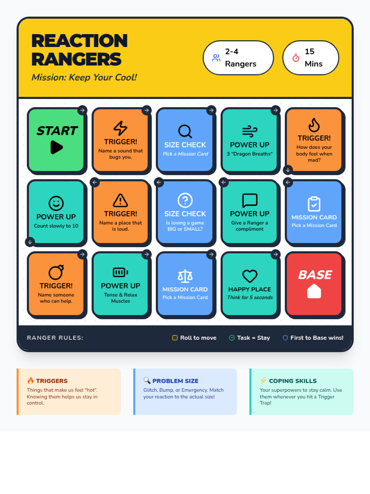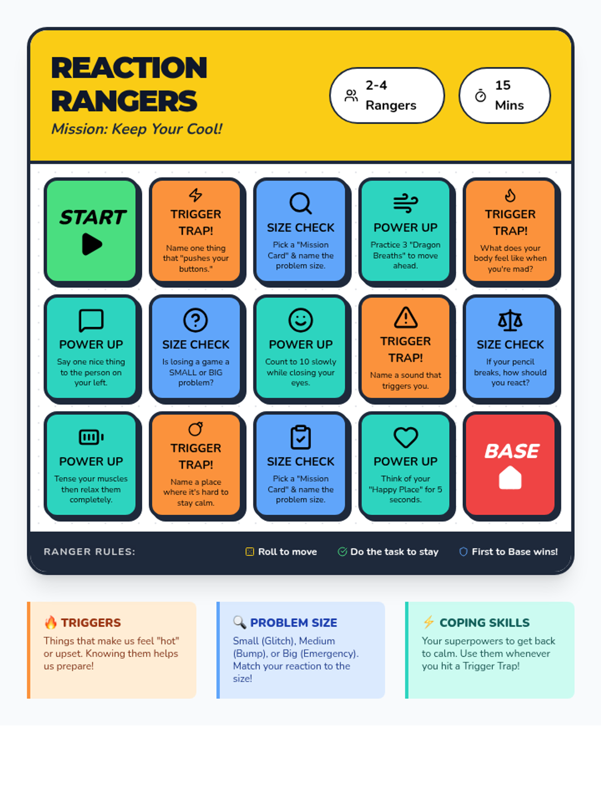 A fast-paced, 15-minute small group session focused on identifying triggers, matching reactions to the size of the problem, and practicing coping skills through a board game format.