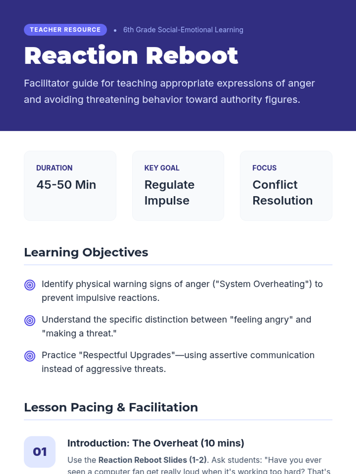 A Restorative Practices-based lesson for 6th graders focused on identifying impulsive emotional reactions, understanding their impact on others, and taking accountability through meaningful repair.