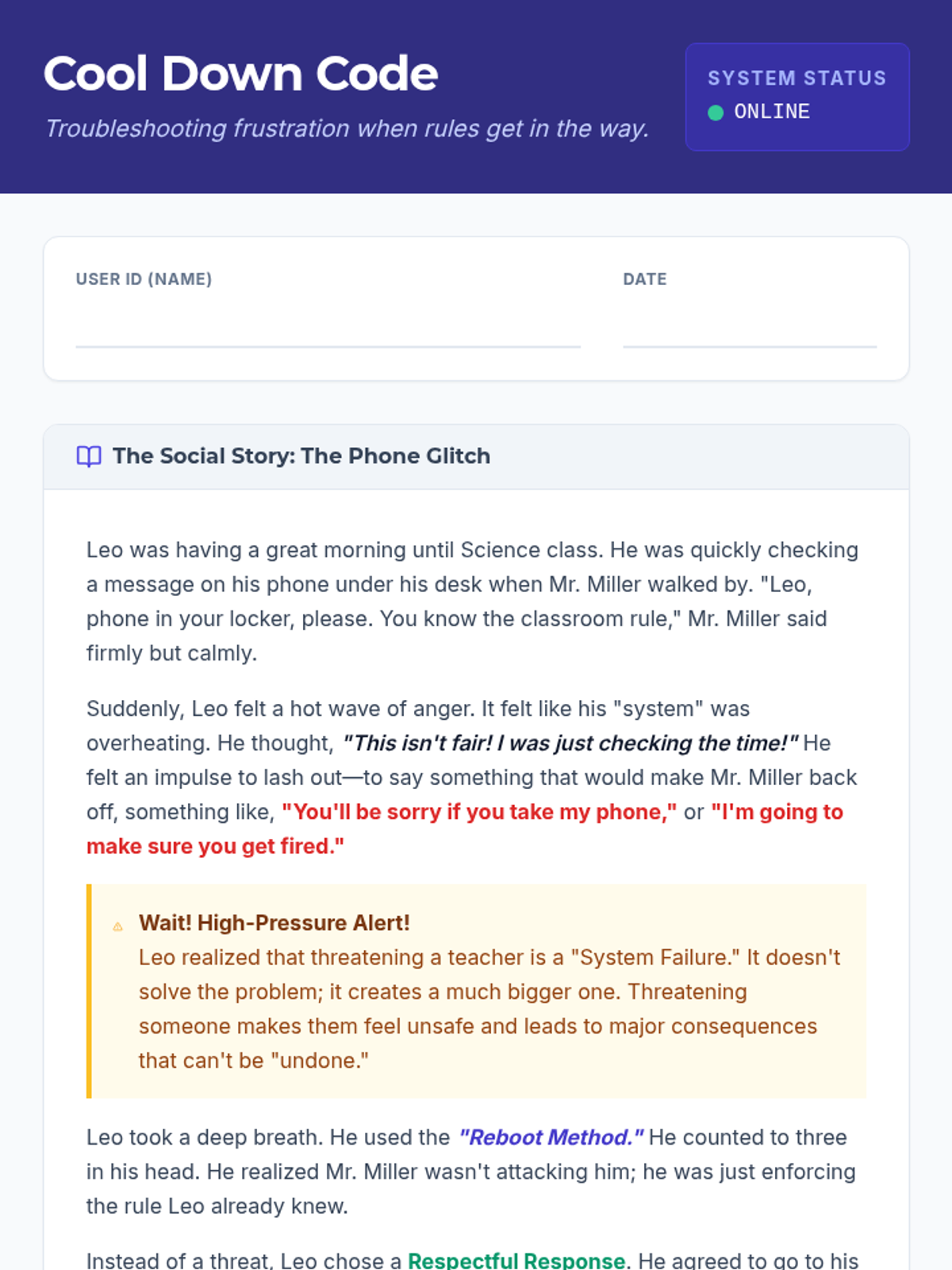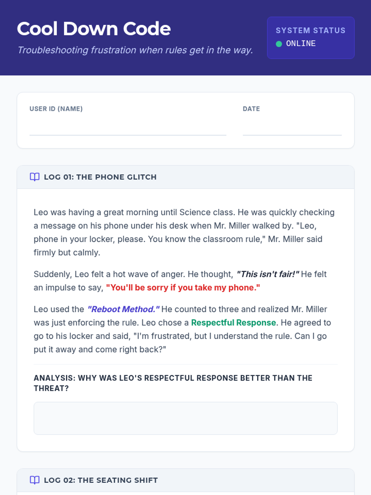 A lesson focused on helping students manage intense emotions and avoid threatening behavior when authority figures enforce rules, using a social story and reflective exercises.