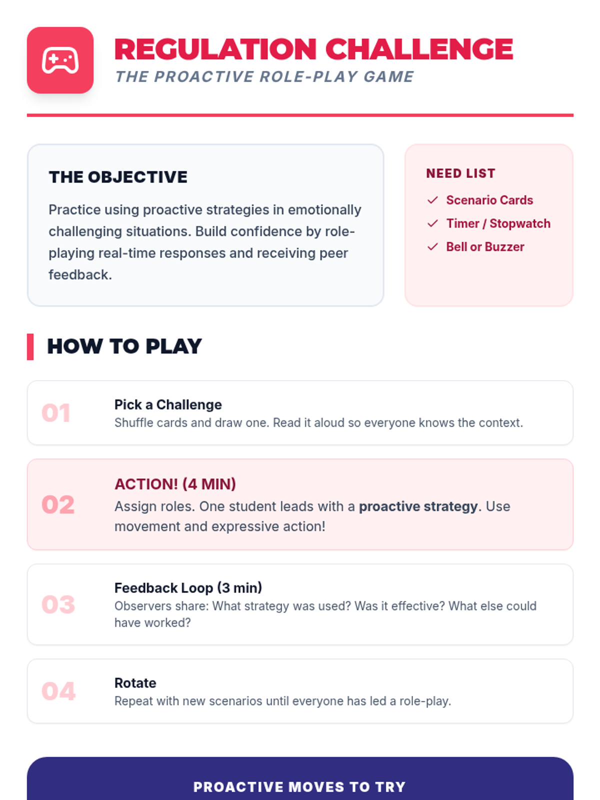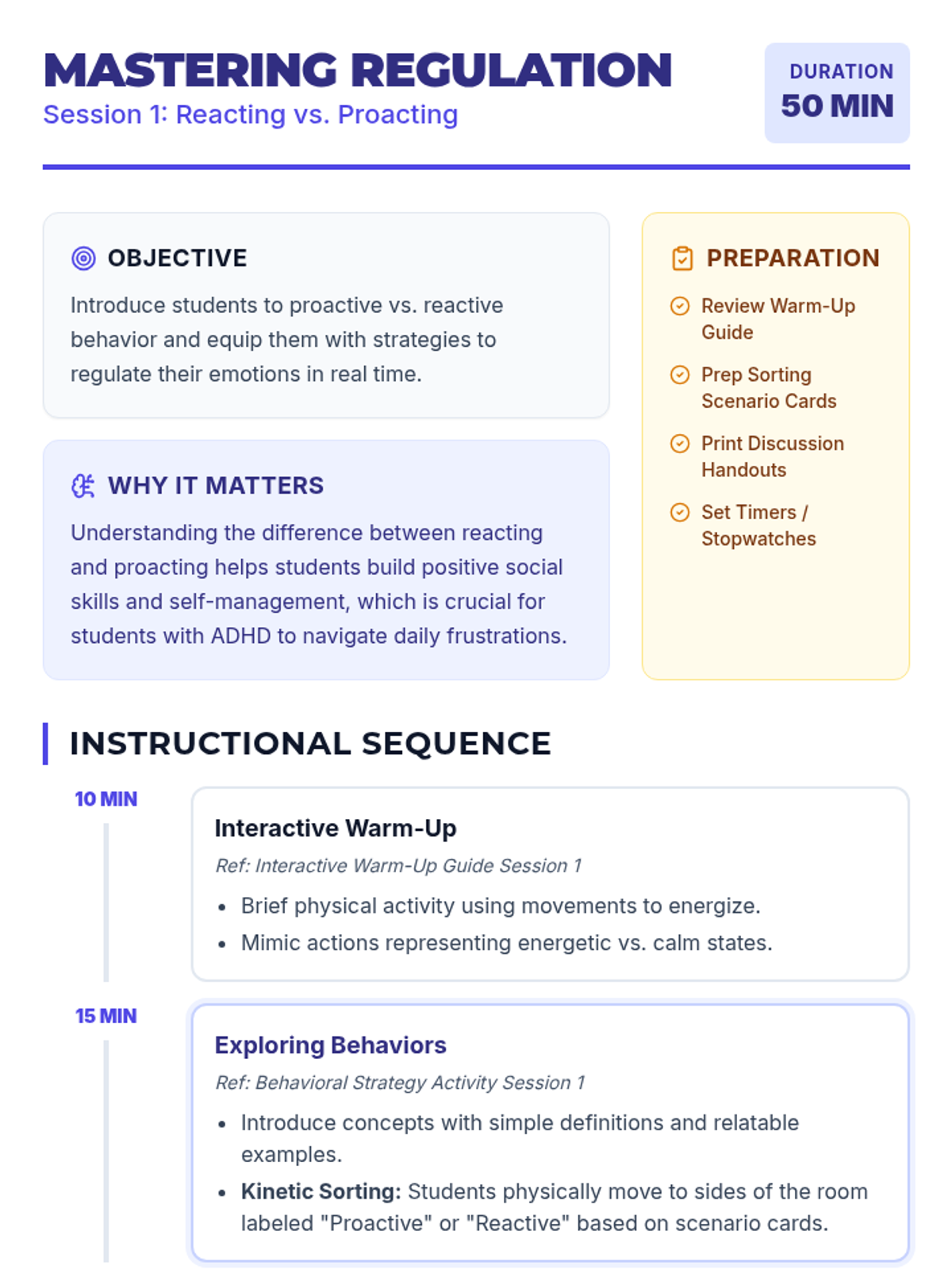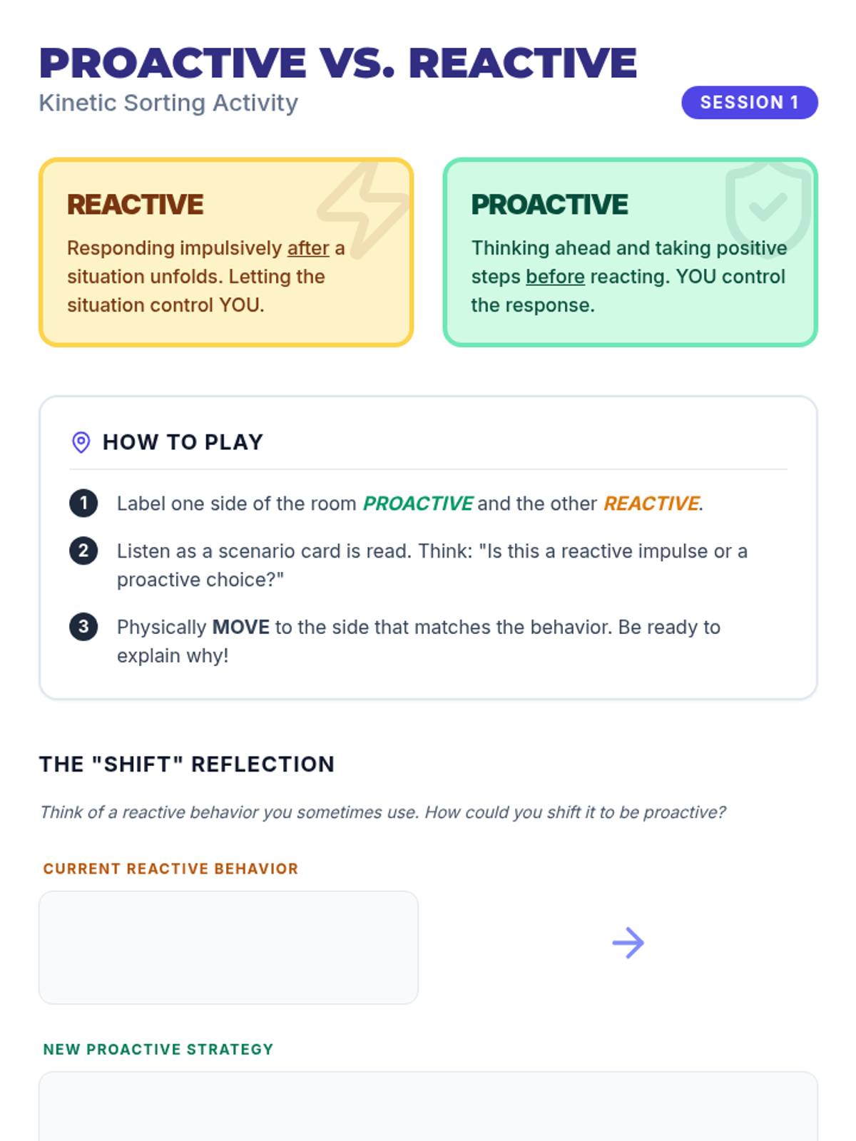 Introduces students to the concepts of proactive versus reactive behavior through movement-based sorting and emotional regulation games.