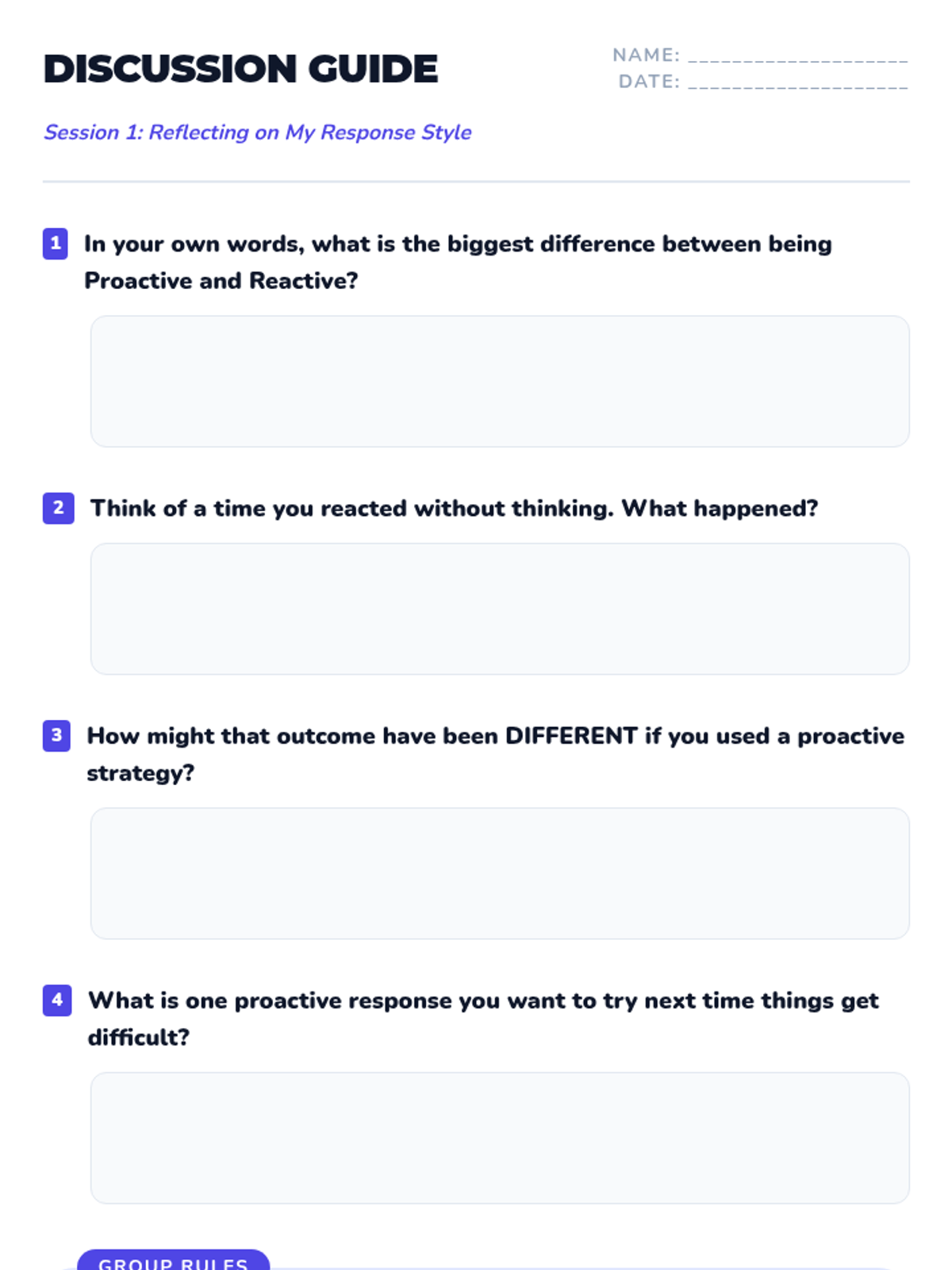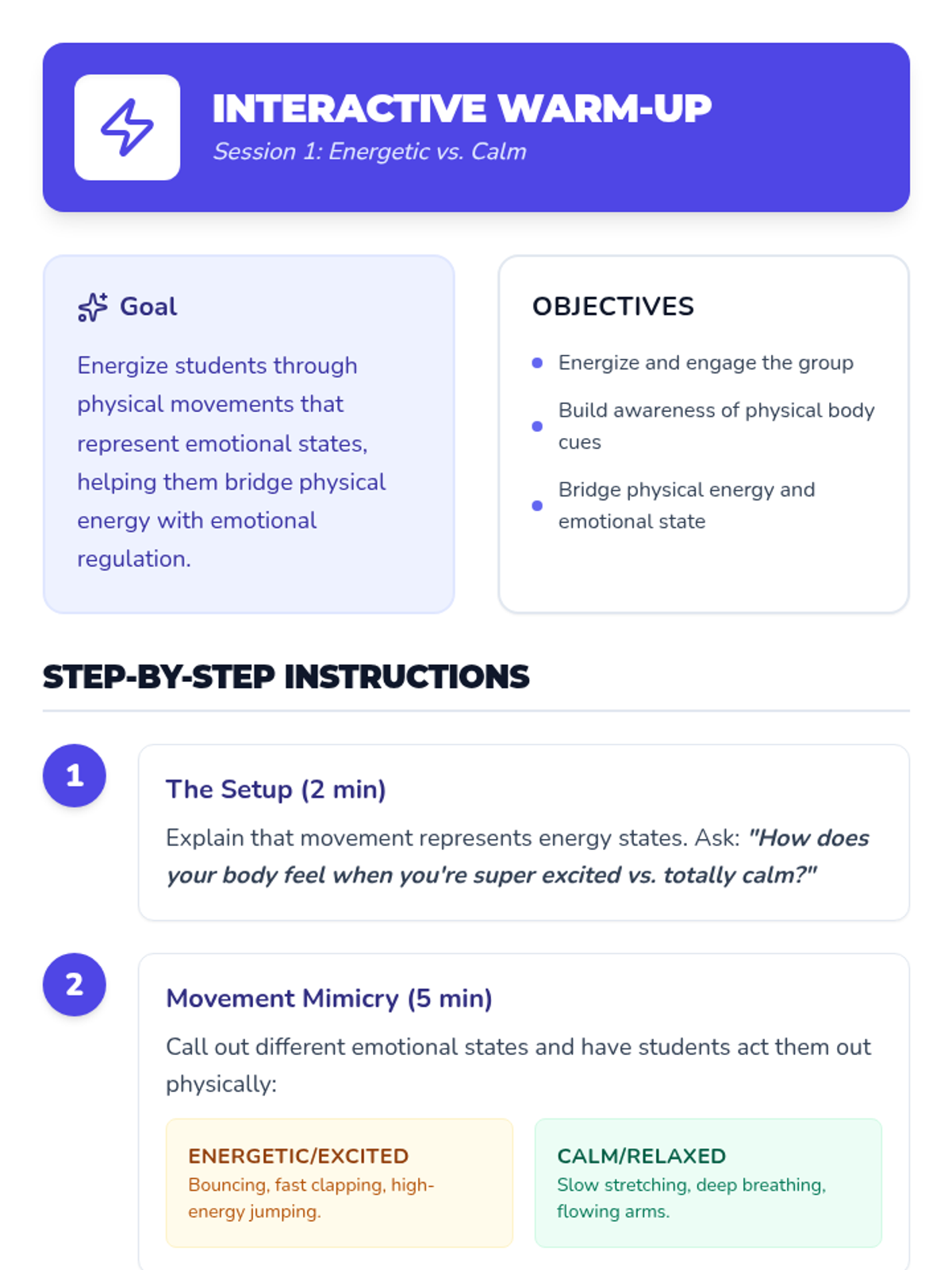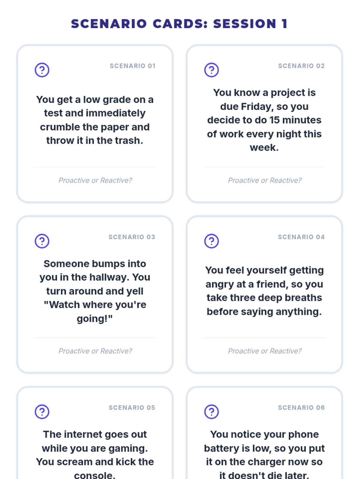 Introduces students to the concepts of proactive versus reactive behavior through movement-based sorting and emotional regulation games.