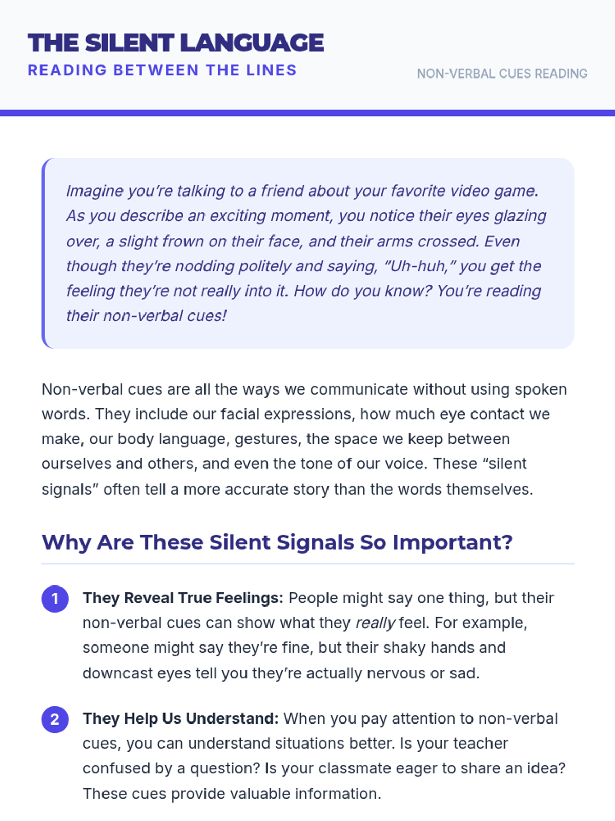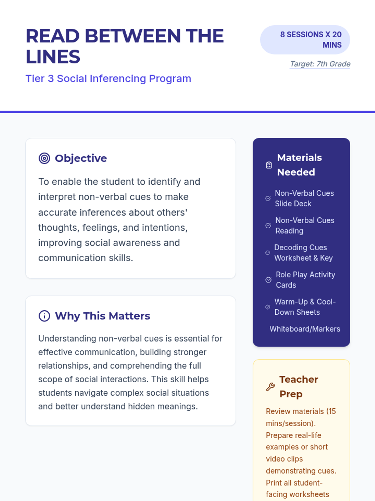 A comprehensive 8-session program that uses direct instruction, guided practice, and role-playing to help students master the art of decoding non-verbal communication.