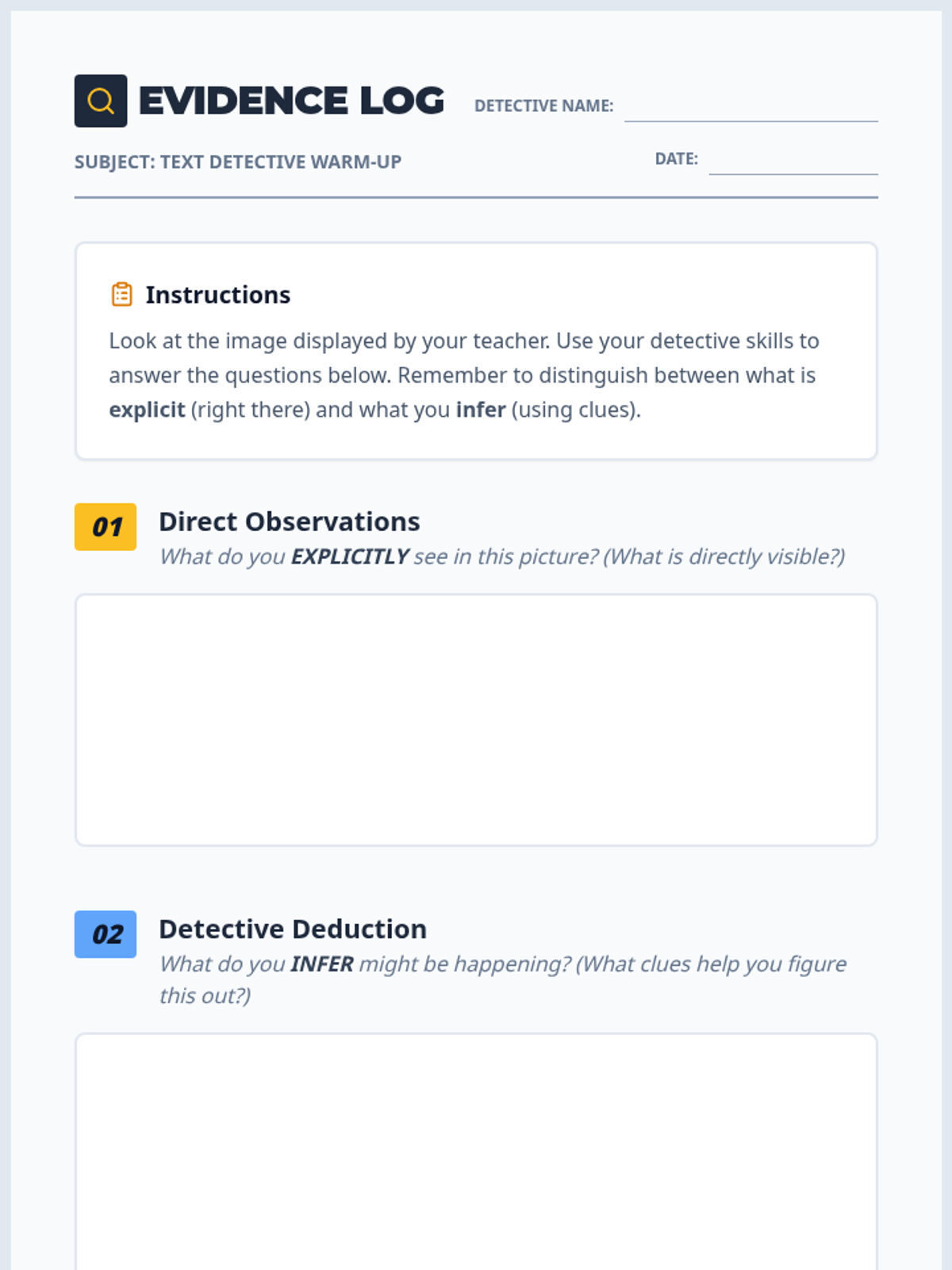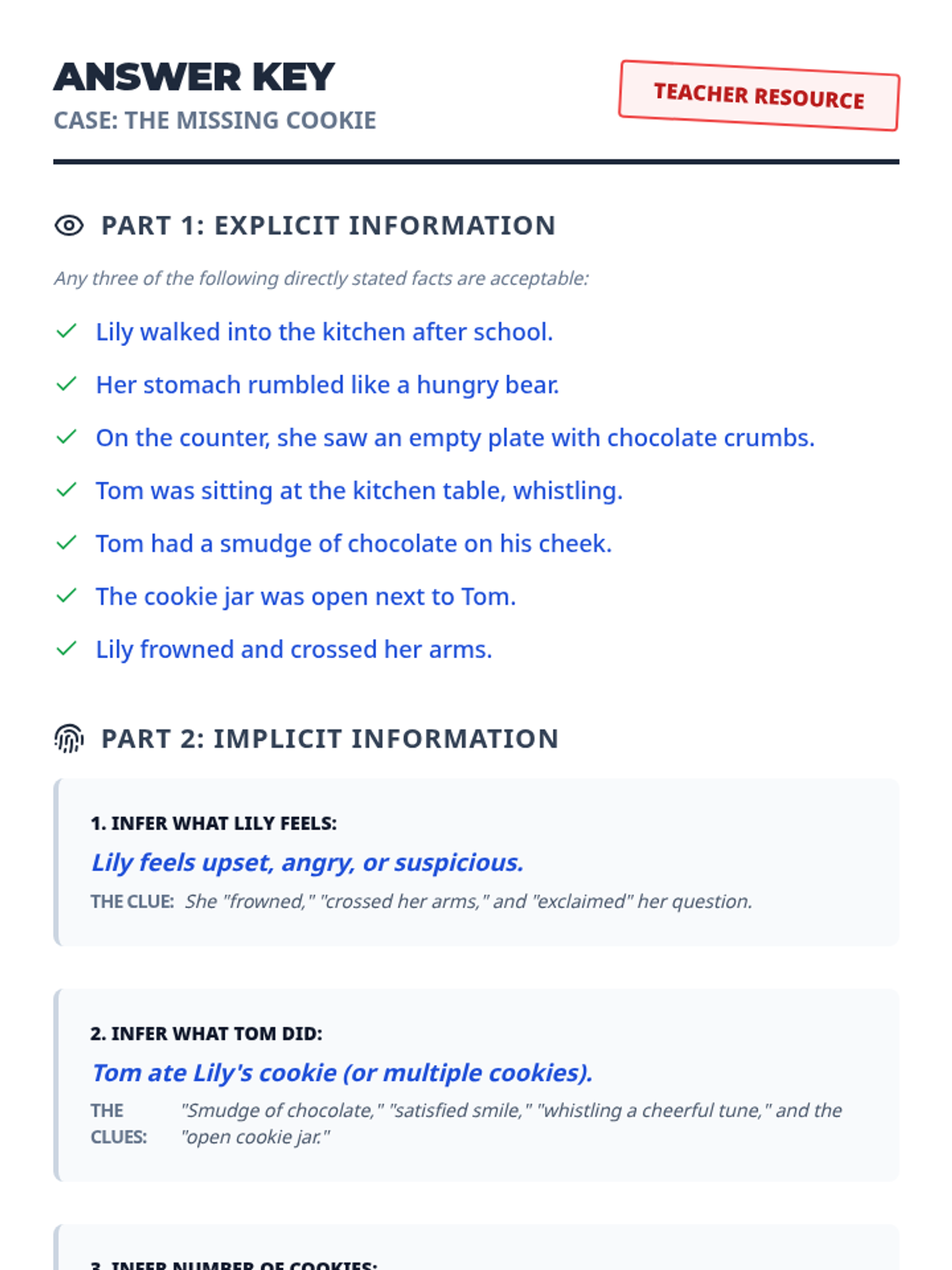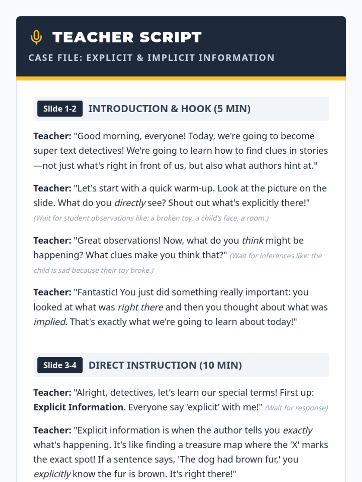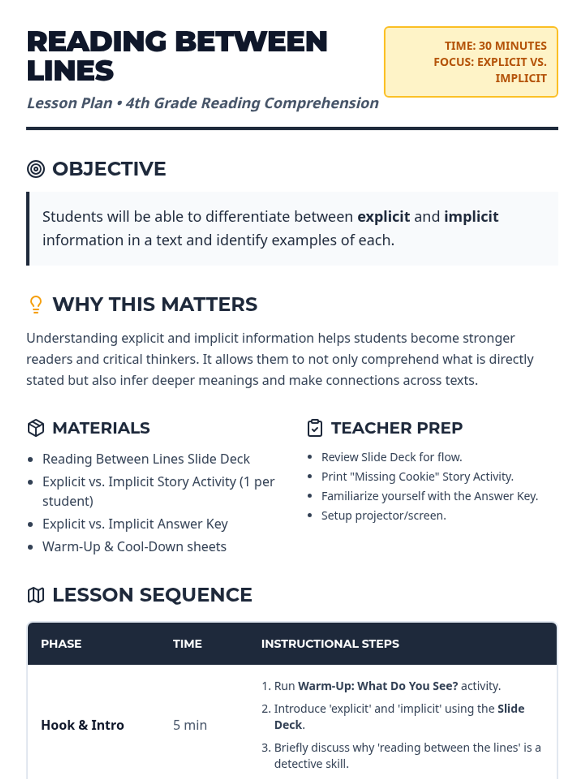 This lesson helps 4th-grade students understand the difference between explicit information (directly stated) and implicit information (implied). It's crucial for developing stronger reading comprehension skills and critical thinking. Designed for a single 30-minute classroom session.