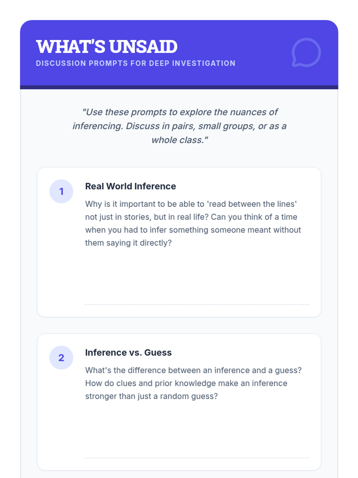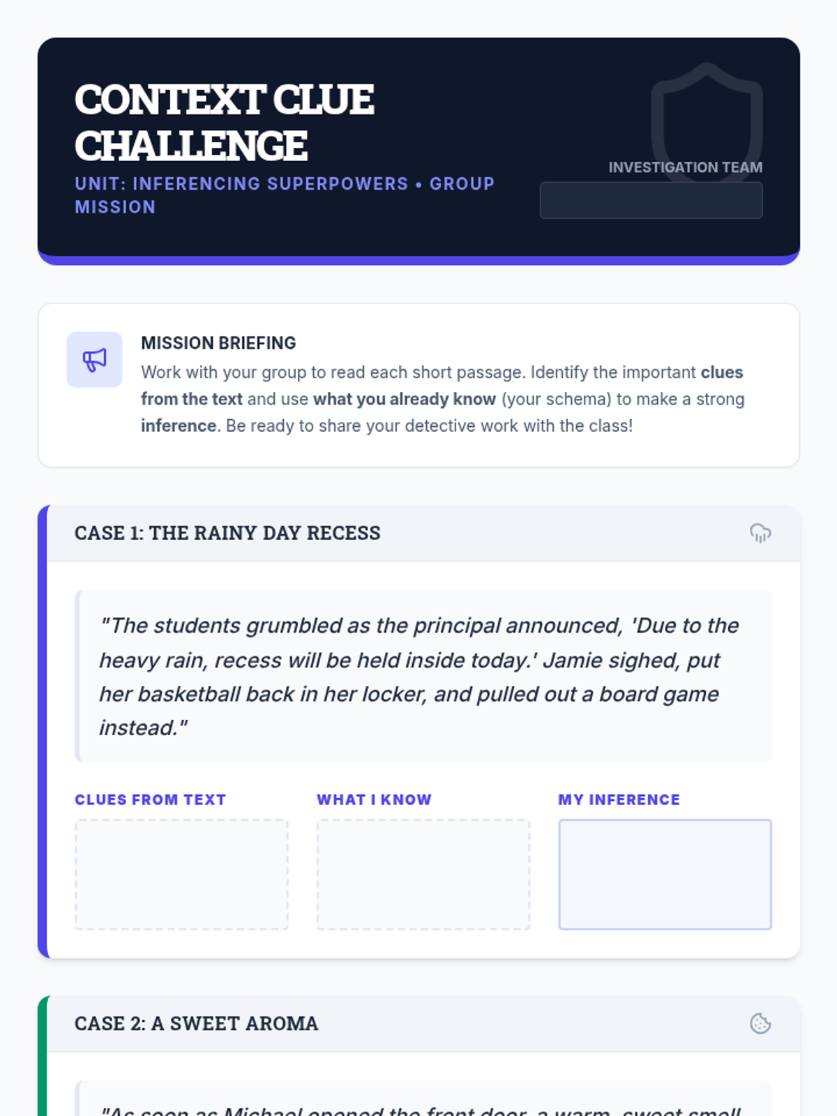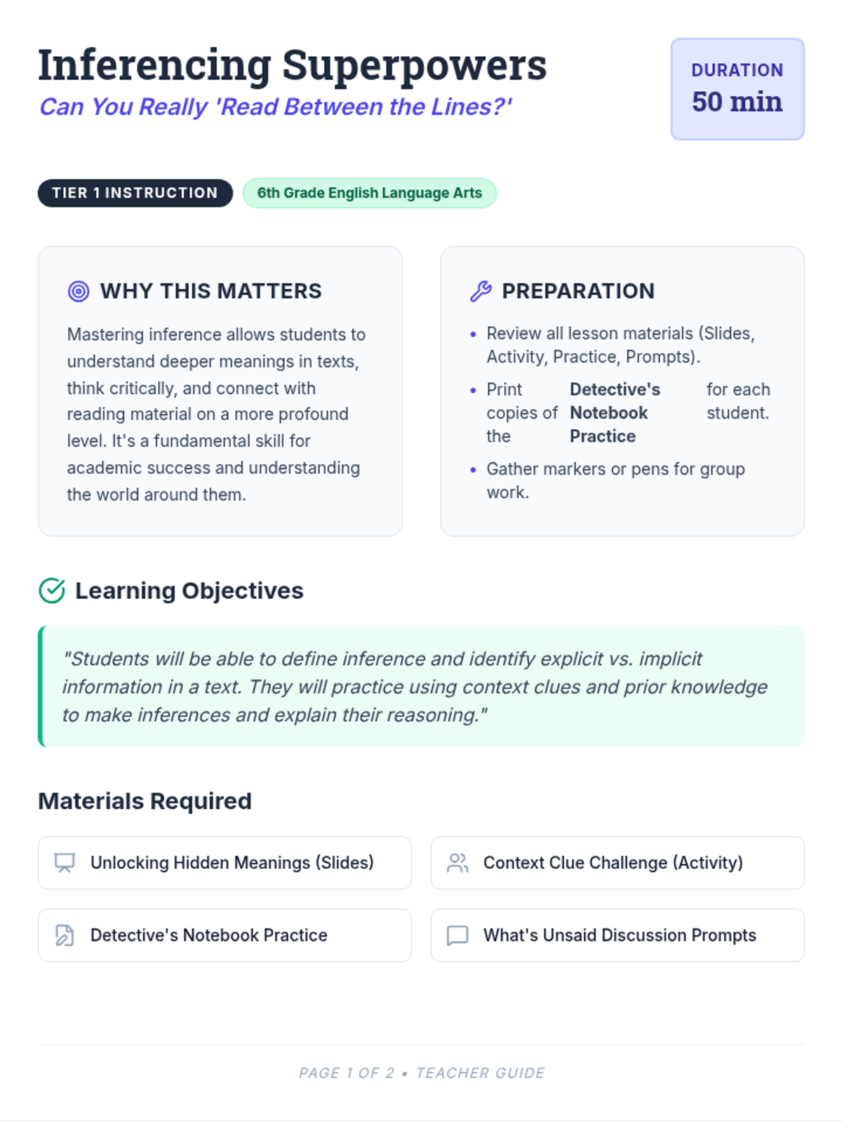 A 50-minute 6th grade lesson focused on the skill of inferencing, using a detective and superpower theme to help students distinguish between explicit and implicit information.