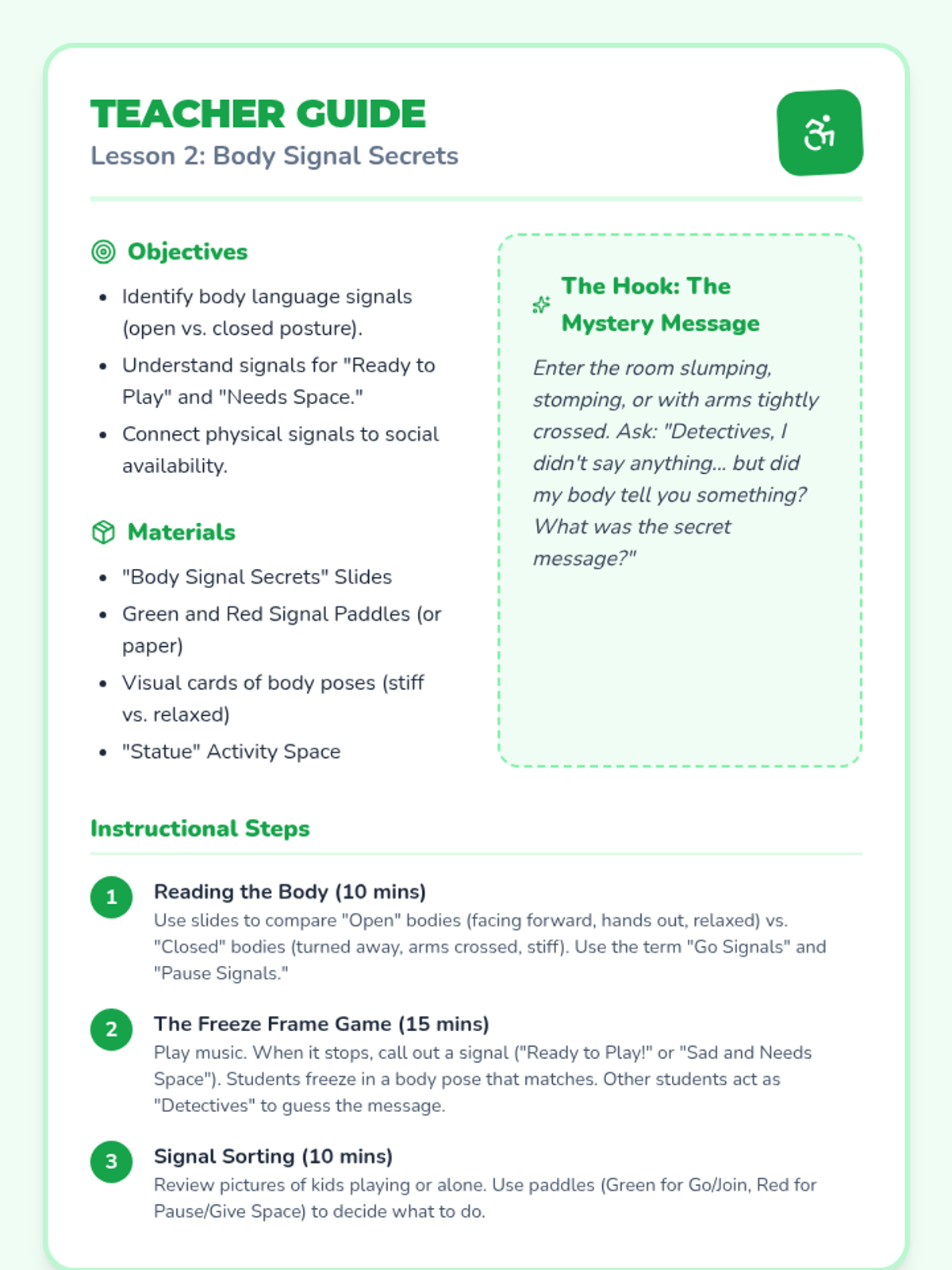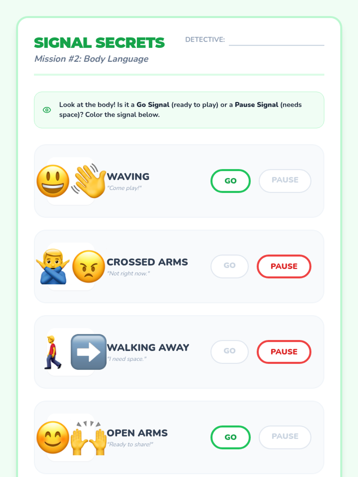 Students observe posture and hand signals to determine if someone is open to play or needs space.