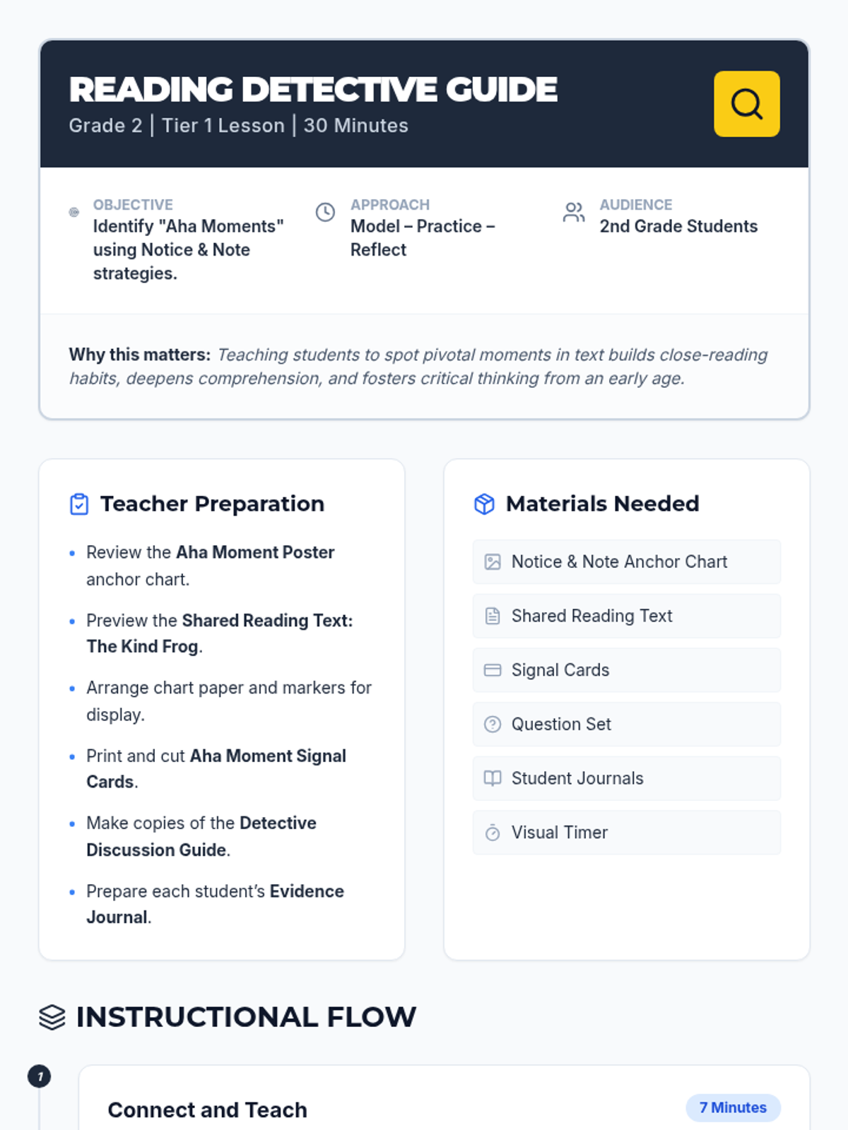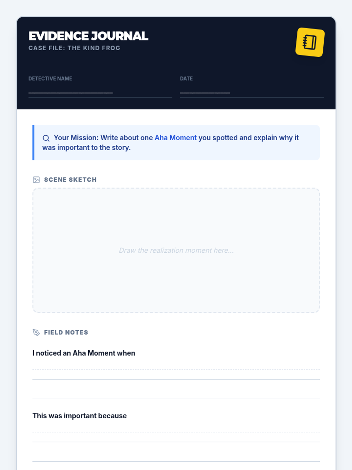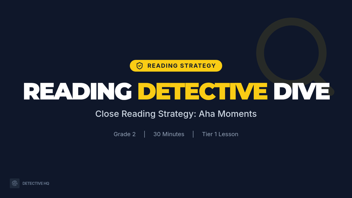 A 30-minute 2nd-grade lesson focused on the Notice and Note "Aha Moment" strategy. Students will learn to spot character realizations using a shared reading text and record their findings in a detective-themed journal.