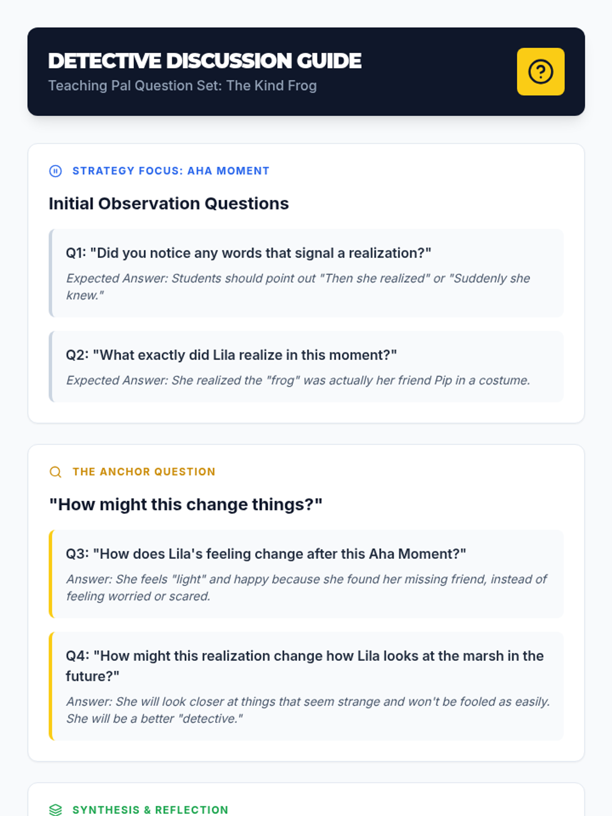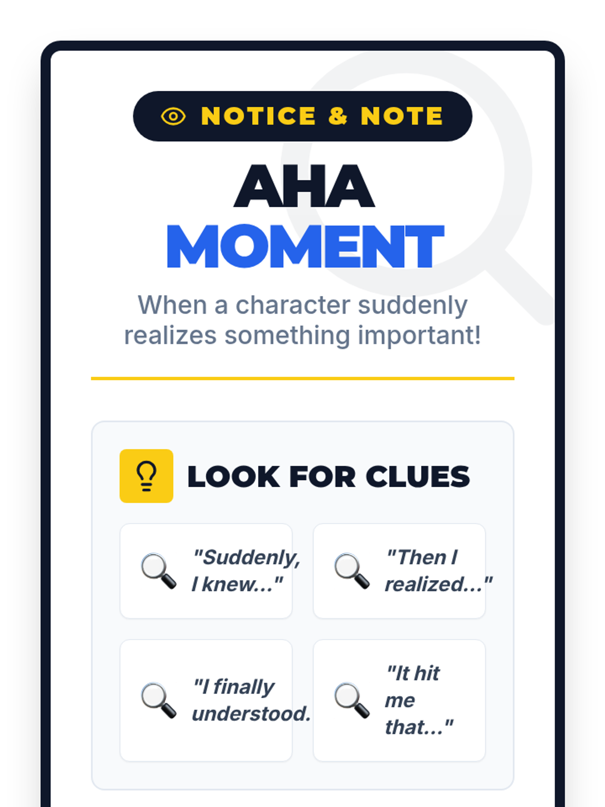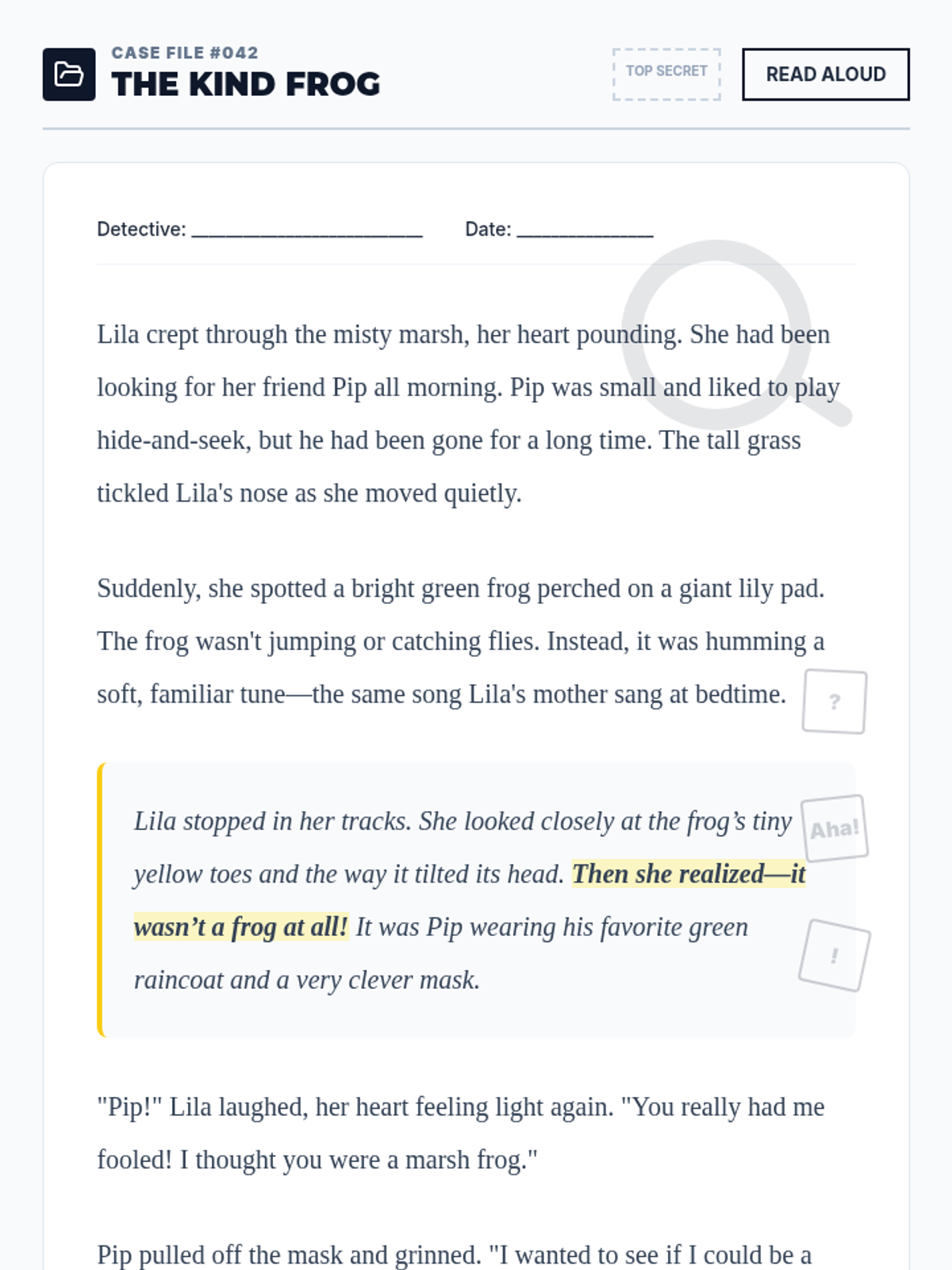 A 30-minute 2nd-grade lesson focused on the Notice and Note "Aha Moment" strategy. Students will learn to spot character realizations using a shared reading text and record their findings in a detective-themed journal.