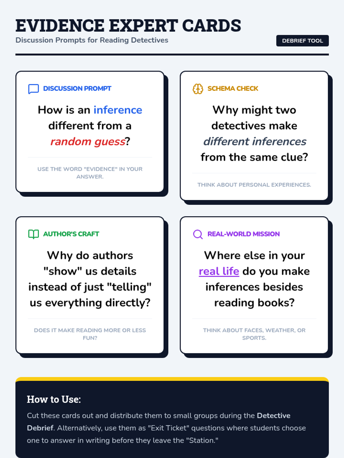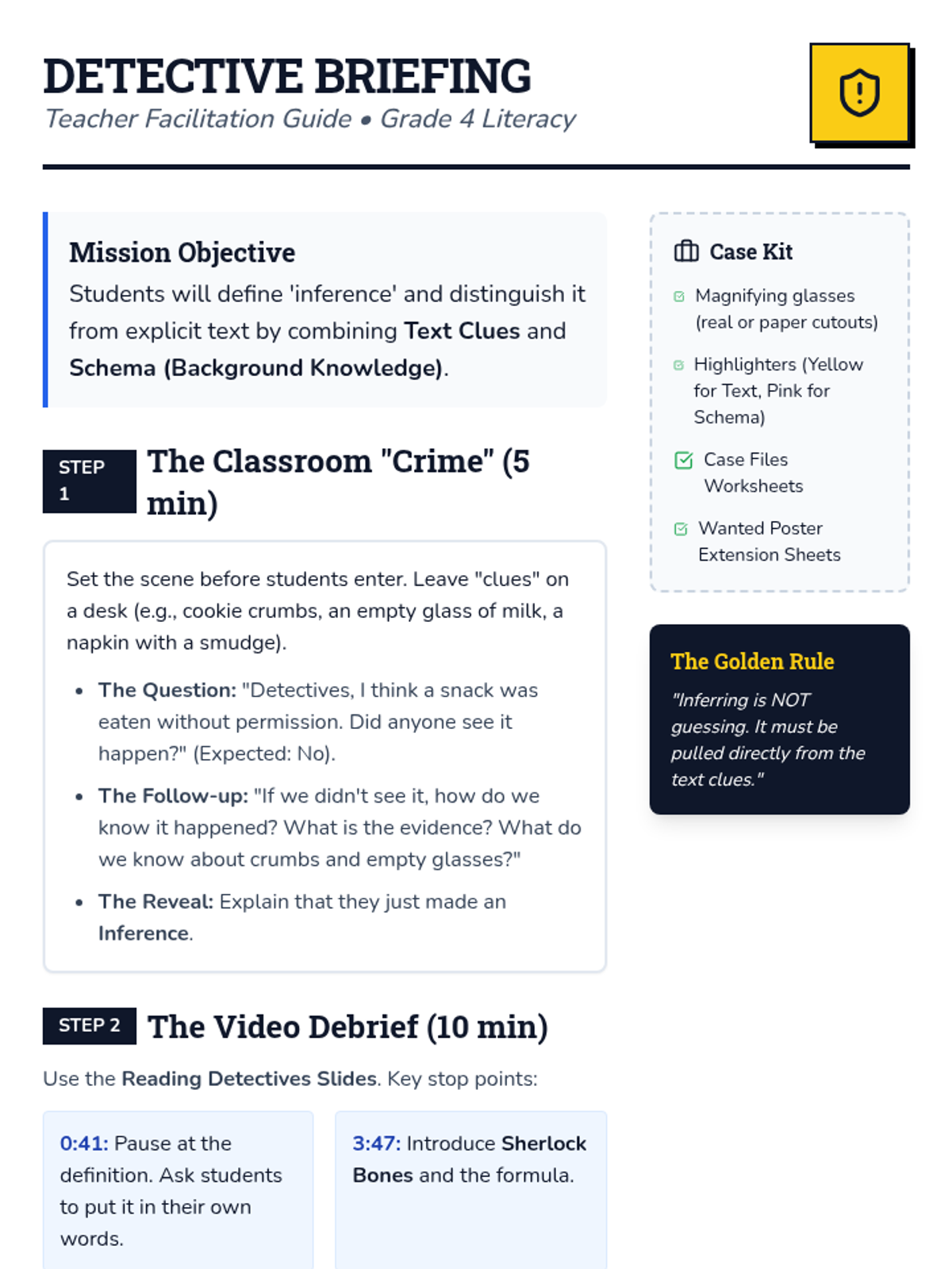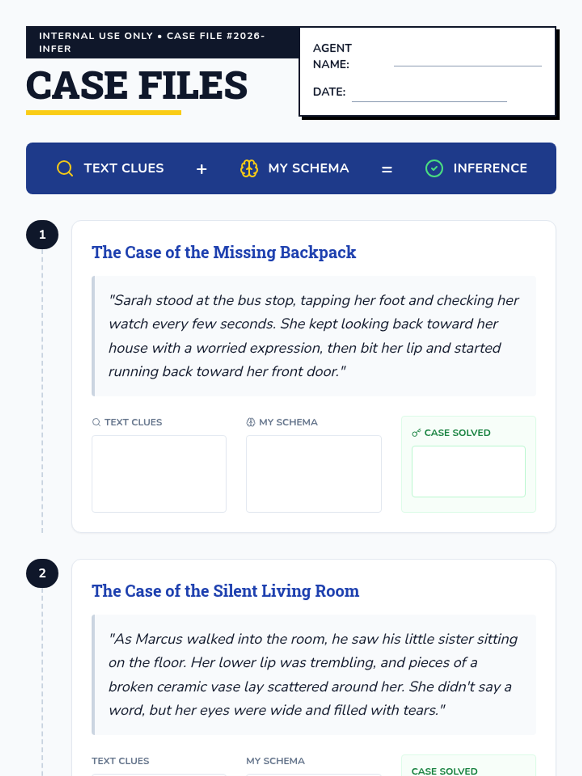 Students become 'Reading Detectives' to master the art of inference. Using a noir-inspired theme, they combine text clues with their own background knowledge to solve 'cases' and distinguish between what is explicitly stated and what is implied.