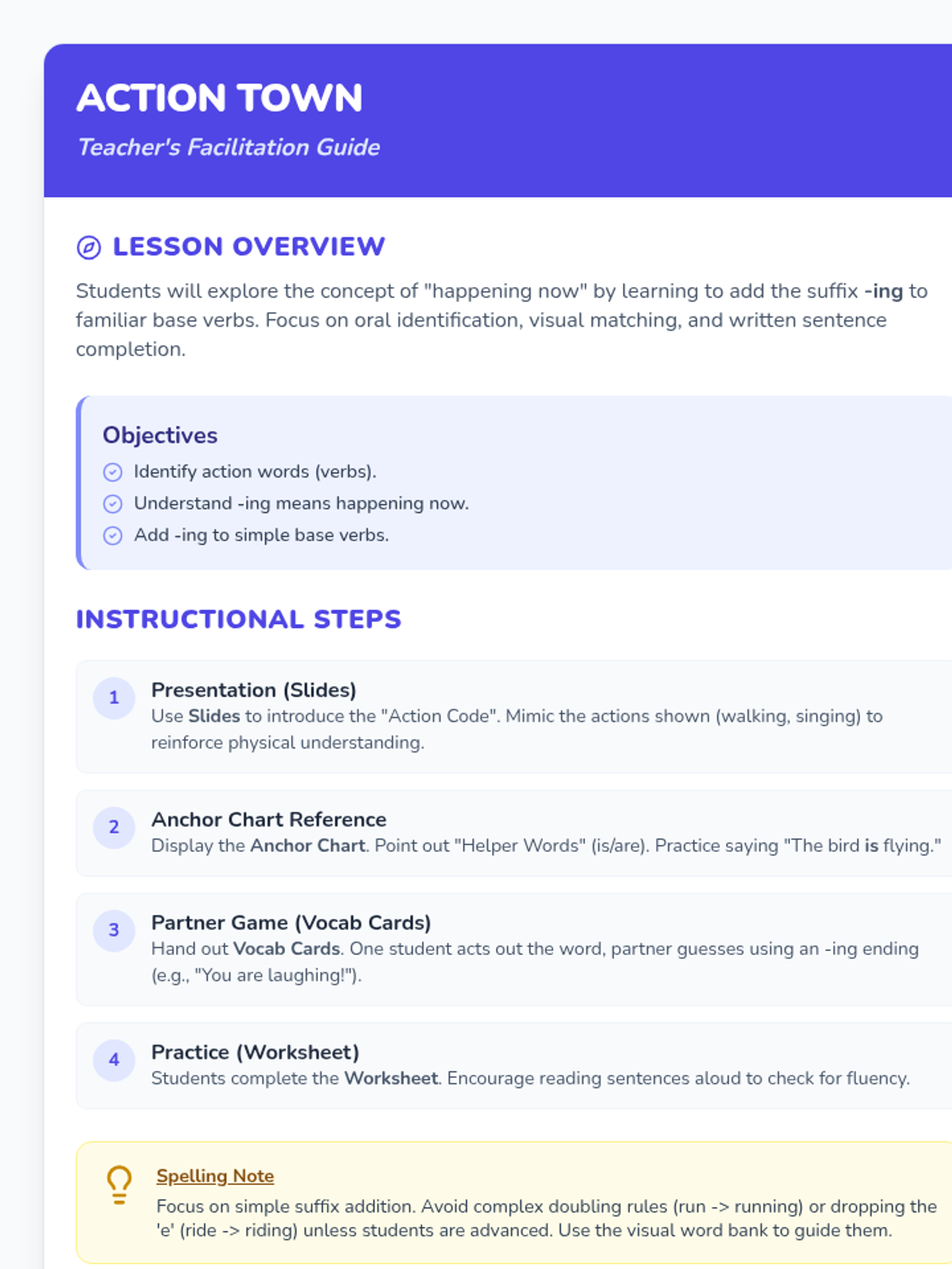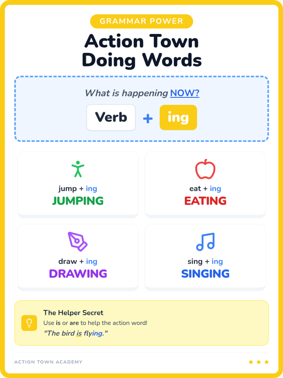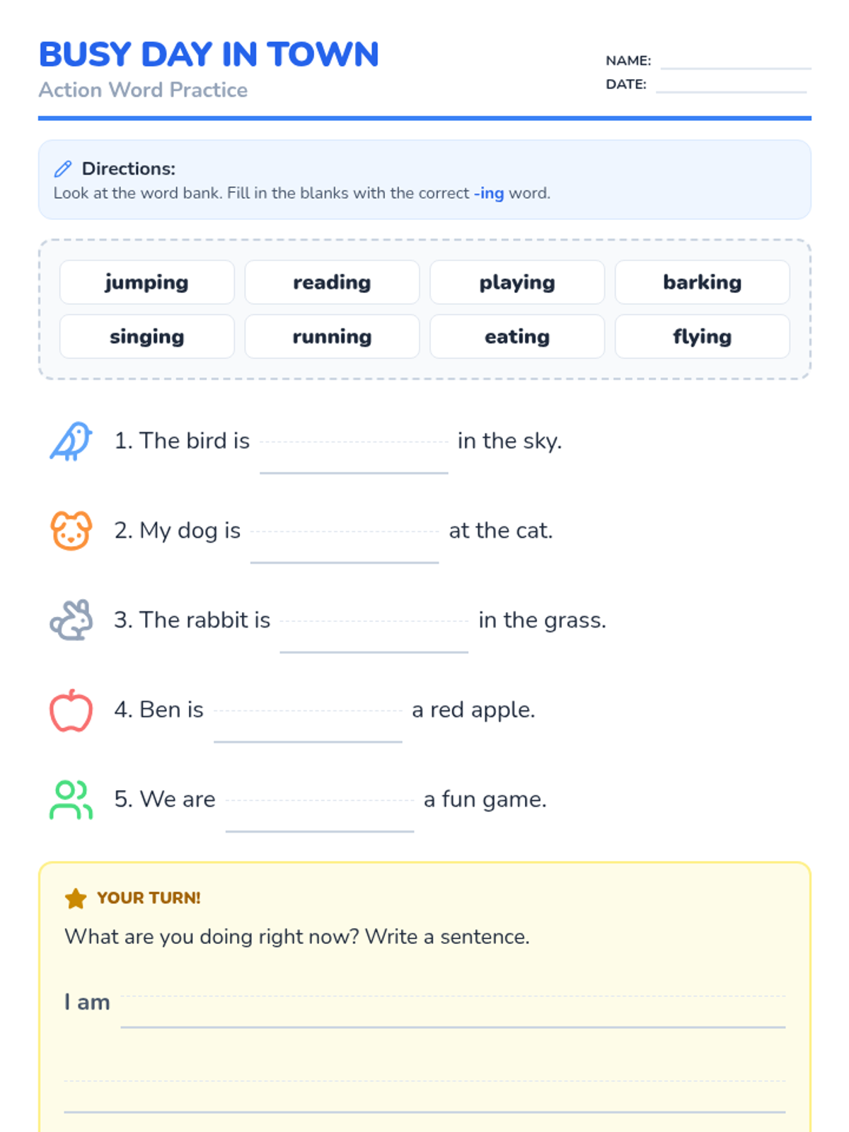 A lively introduction to using '-ing' endings to describe actions happening now, featuring engaging visuals and hands-on practice for 1st graders.