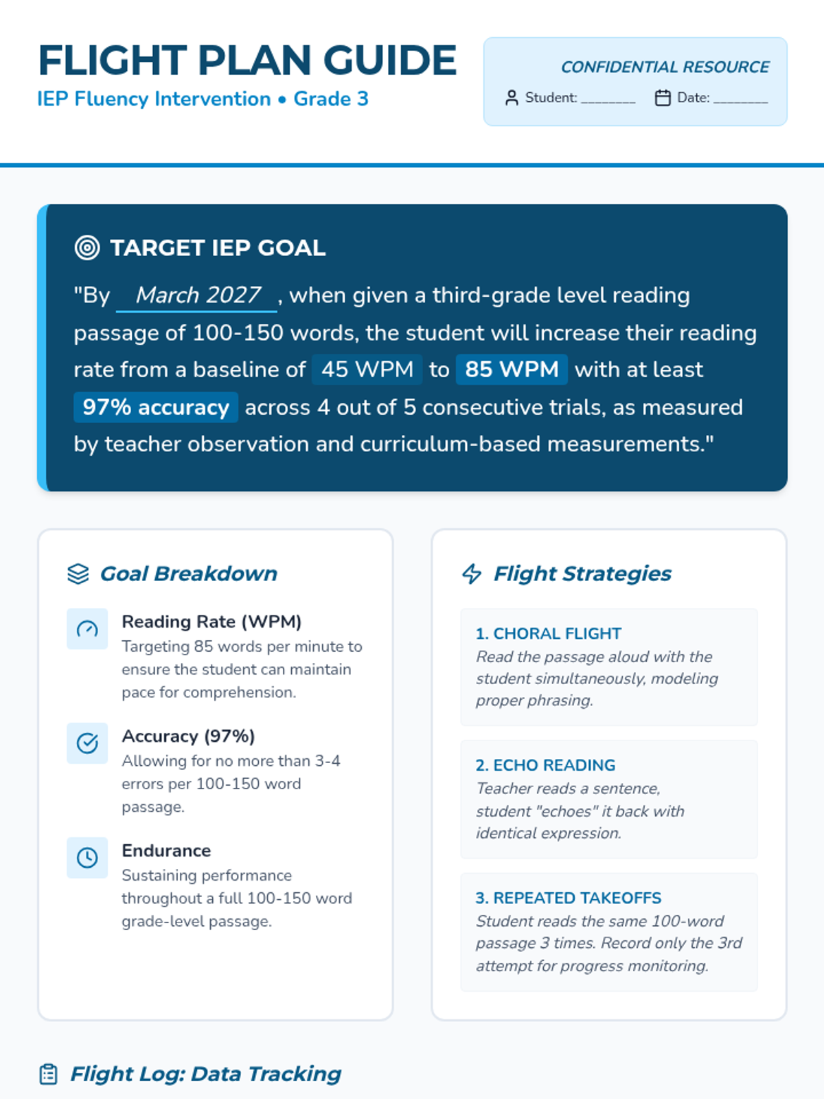 A comprehensive fluency intervention for a 3rd-grade student, focusing on increasing reading rate and accuracy through structured practice and data tracking.