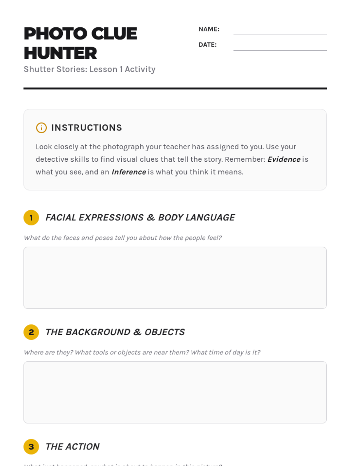 Students analyze photos to identify narrative clues like facial expressions and backgrounds to infer the story being told.