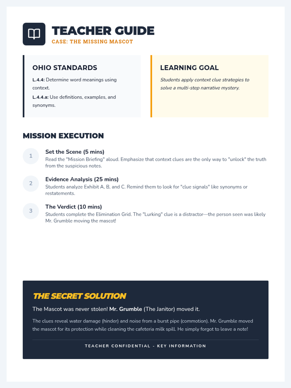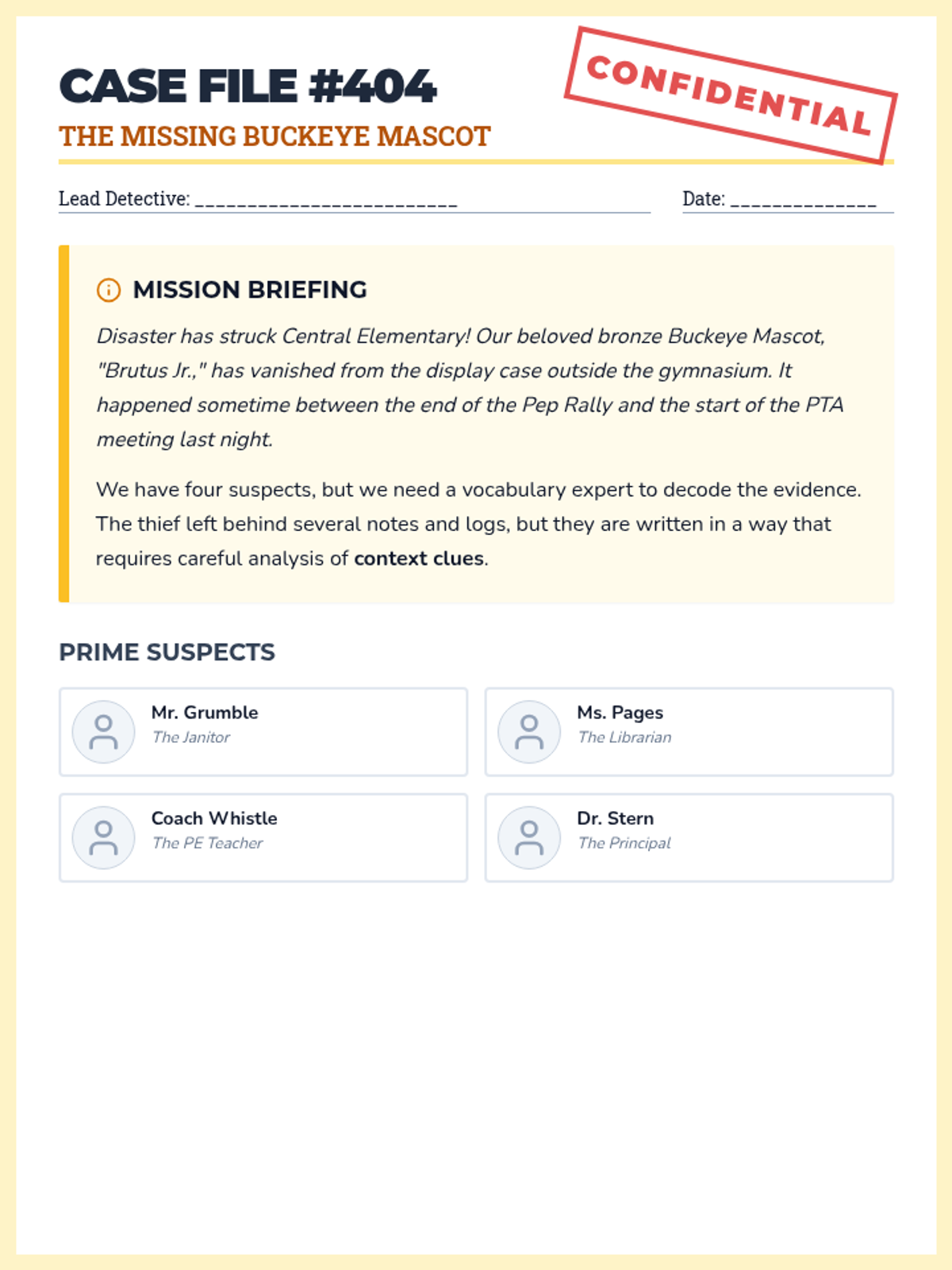 A high-stakes mystery where students use context clues and vocabulary strategies to recover the school's missing mascot. Students will analyze evidence files and eliminate suspects by correctly defining complex words from the text.