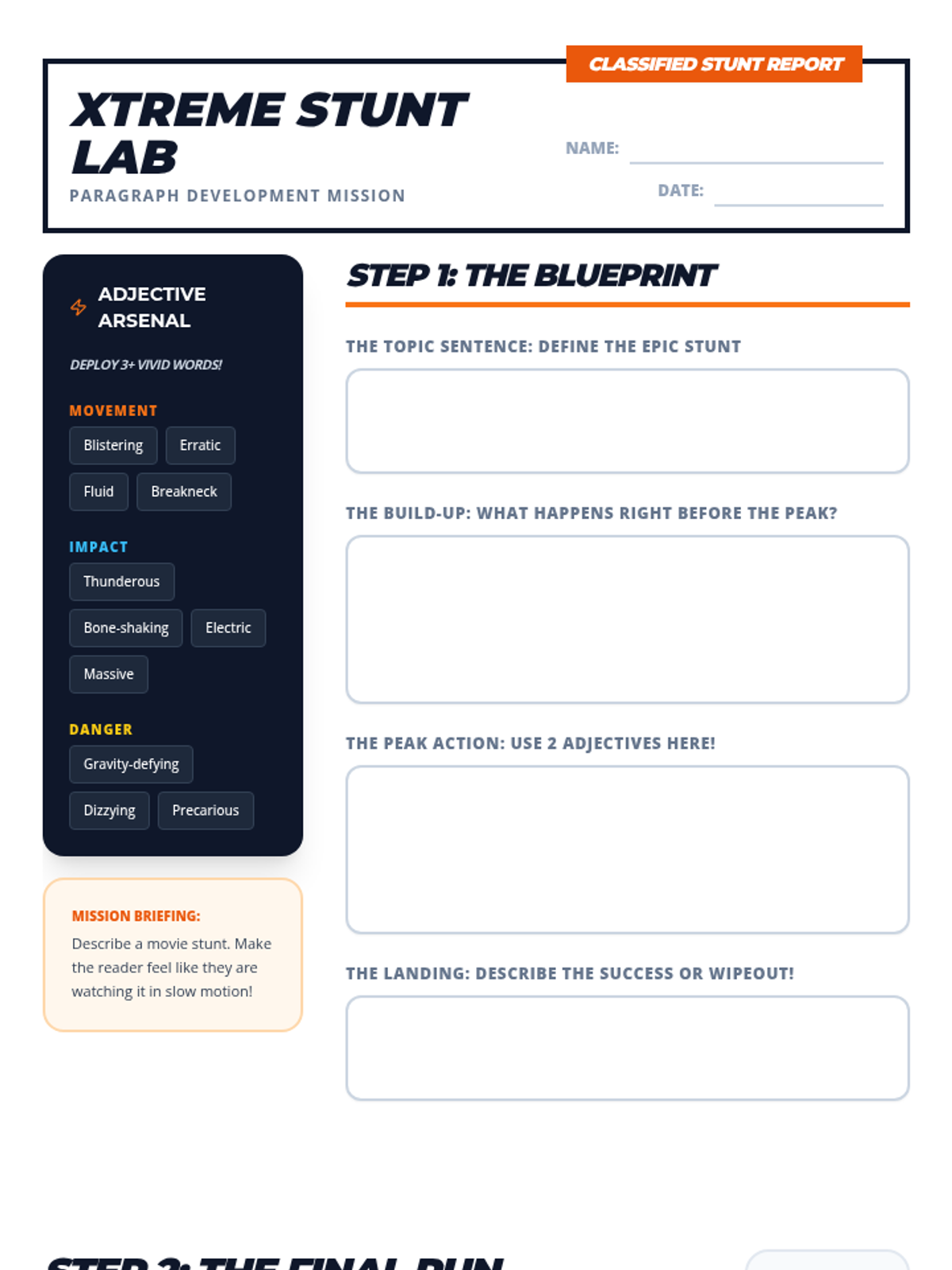 An action-packed writing lesson where students step into the role of a stunt coordinator or extreme sports reporter to master paragraph structure and vivid details.